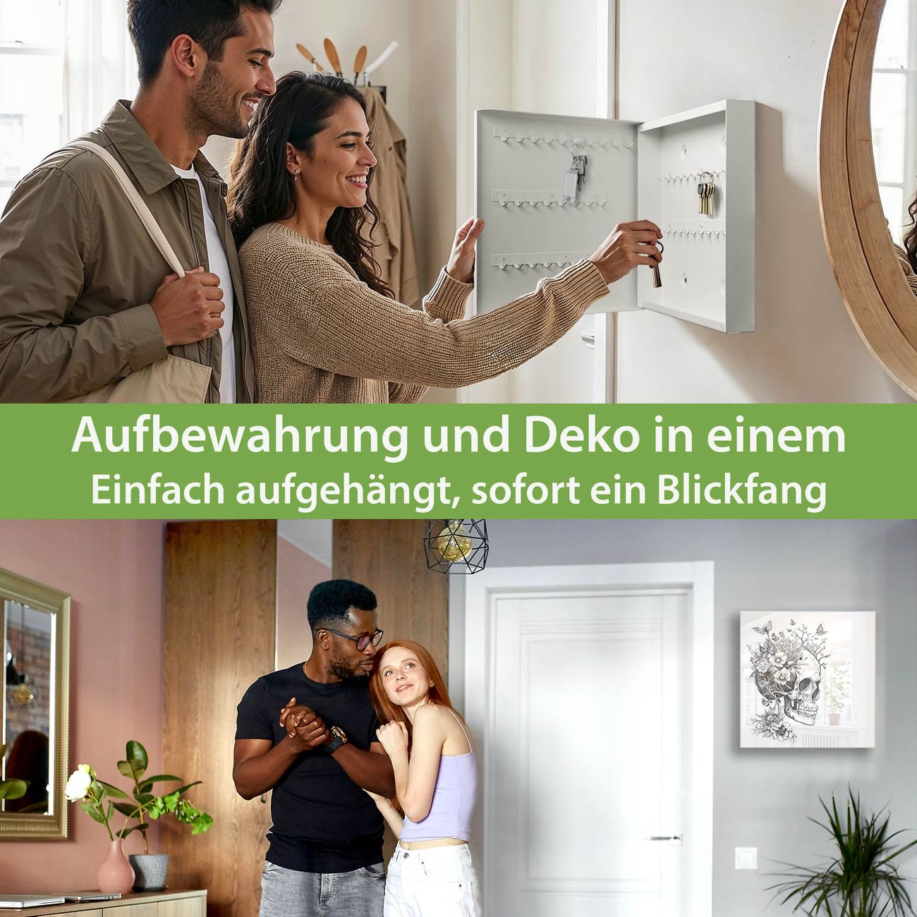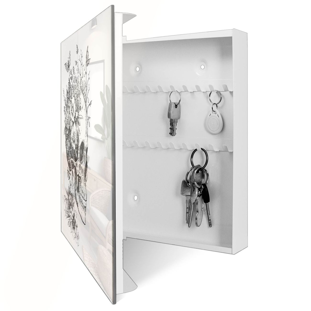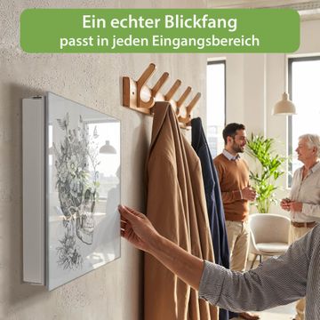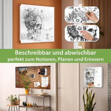 Bringe Ordnung und Eleganz in deinen Eingangsbereich mit dem banjado Schlüsselkasten Motiv Motiv Floral Skull. Die moderne Schlüsselbox kombiniert funktionales Design mit hochwertiger Verarbeitung und wird so zu einem echten Hingucker in Flur, Büro oder Ferienwohnung. ✅ Stilvolle Schlüsselaufbewahrung mit Glasfront im Motiv Motiv Floral Skull Der Design-Schlüsselkasten Motiv Motiv Floral Skull bietet Platz für bis zu 50 Schlüssel, die auf 5 stabilen Reihen mit je 10 Haken übersichtlich verstaut werden. Mit seinen kompakten Maßen von 30 x 30 x 5 cm passt die Schlüsselbox perfekt auch in kleinere Räume. Der weiß lackierte Stahlkorpus mit rechts angeschlagenem Türscharnier harmoniert mit der Glasfront und fügt sich nahtlos in jedes Wohnambiente ein. Ob als Schlüsselorganizer für Zuhause oder als praktische Lösung für Büros, Praxen und Gewerbe, der banjado Schlüsselkasten sorgt für Ordnung und Übersicht. Dank der magnetischen, mit Kreidestiften beschreibbaren Glasfront kannst du Notizen anheften oder Termine direkt auf der Oberfläche festhalten. Die Schlüsselbox Motiv Motiv Floral Skull zur Wandmontage wird inklusive Befestigungsmaterial geliefert und ist schnell angebracht. So hast du deine Schlüssel jederzeit griffbereit und zugleich stilvoll verstaut. Mit diesem banjado Schlüsselkasten Motiv Motiv Floral Skull kombinierst du praktische Aufbewahrung mit stilvollem Wohndesign. Ob privat oder geschäftlich, die Schlüsselbox sorgt für mehr Ordnung, Übersicht und ein wohnliches Ambiente.Vorteile im Überblick