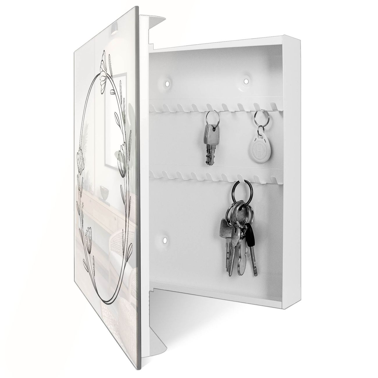 Bringe Ordnung und Eleganz in deinen Eingangsbereich mit dem banjado Schlüsselkasten Motiv Motiv Florale Eleganz 3. Die moderne Schlüsselbox kombiniert funktionales Design mit hochwertiger Verarbeitung und wird so zu einem echten Hingucker in Flur, Büro oder Ferienwohnung. ✅ Stilvolle Schlüsselaufbewahrung mit Glasfront im Motiv Motiv Florale Eleganz 3 Der Design-Schlüsselkasten Motiv Motiv Florale Eleganz 3 bietet Platz für bis zu 50 Schlüssel, die auf 5 stabilen Reihen mit je 10 Haken übersichtlich verstaut werden. Mit seinen kompakten Maßen von 30 x 30 x 5 cm passt die Schlüsselbox perfekt auch in kleinere Räume. Der weiß lackierte Stahlkorpus mit rechts angeschlagenem Türscharnier harmoniert mit der Glasfront und fügt sich nahtlos in jedes Wohnambiente ein. Ob als Schlüsselorganizer für Zuhause oder als praktische Lösung für Büros, Praxen und Gewerbe, der banjado Schlüsselkasten sorgt für Ordnung und Übersicht. Dank der magnetischen, mit Kreidestiften beschreibbaren Glasfront kannst du Notizen anheften oder Termine direkt auf der Oberfläche festhalten. Die Schlüsselbox Motiv Motiv Florale Eleganz 3 zur Wandmontage wird inklusive Befestigungsmaterial geliefert und ist schnell angebracht. So hast du deine Schlüssel jederzeit griffbereit und zugleich stilvoll verstaut. Mit diesem banjado Schlüsselkasten Motiv Motiv Florale Eleganz 3 kombinierst du praktische Aufbewahrung mit stilvollem Wohndesign. Ob privat oder geschäftlich, die Schlüsselbox sorgt für mehr Ordnung, Übersicht und ein wohnliches Ambiente.Vorteile im Überblick