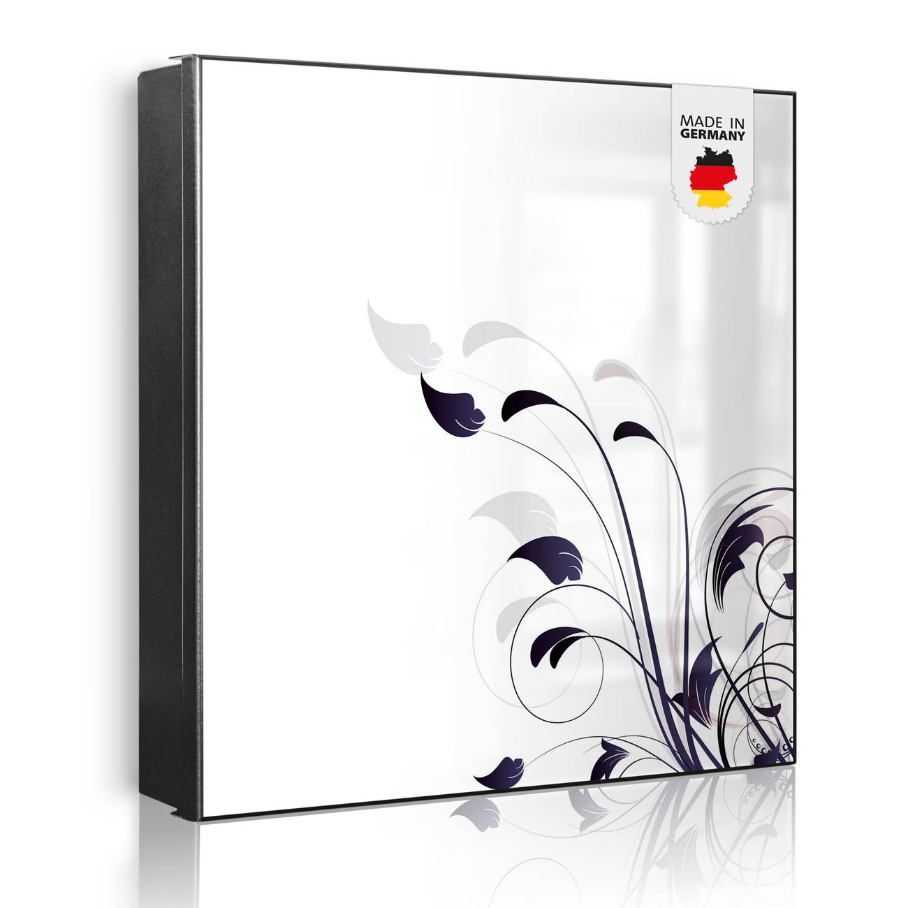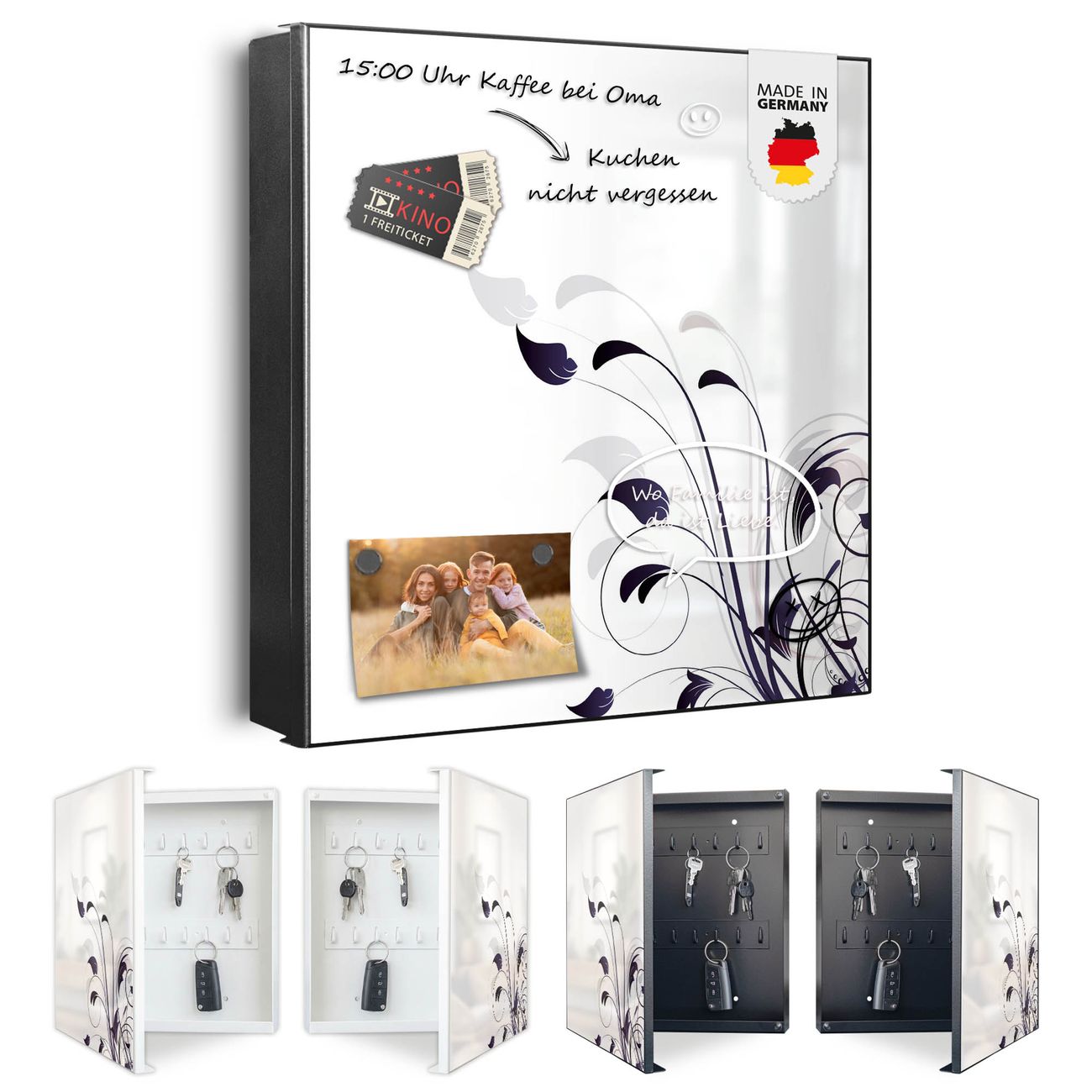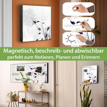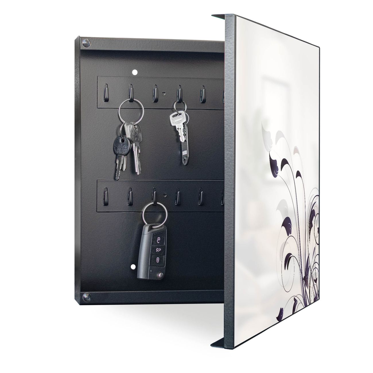 Bringe Ordnung und Eleganz in deinen Eingangsbereich mit dem banjado Schlüsselkasten Motiv Motiv Florale Eleganz. Die moderne Schlüsselbox kombiniert funktionales Design mit hochwertiger Verarbeitung und wird so zu einem echten Hingucker in Flur, Büro oder Ferienwohnung. ✅ Stilvolle Schlüsselaufbewahrung mit Motiv Motiv Florale Eleganz Der Design-Schlüsselkasten Motiv Motiv Florale Eleganz bietet Platz für bis zu 32 Schlüssel, die auf 4 stabilen Reihen mit je 8 Haken übersichtlich verstaut werden. Mit seinen kompakten Maßen von 30 x 30 x 5 cm passt die Schlüsselbox perfekt auch in kleinere Räume. Der schwarz lackierte Stahlkorpus mit rechts angeschlagenem Türscharnier harmoniert mit gedruckten Folie auf der Front und fügt sich nahtlos in jedes Wohnambiente ein. Ob als Schlüsselorganizer für Zuhause oder als praktische Lösung für Büros, Praxen und Gewerbe, der banjado Schlüsselkasten sorgt für Ordnung und Übersicht. Dank der magnetischen, mit Kreidestiften beschreibbaren Folie auf der Front kannst du Notizen anheften oder Termine direkt auf der Oberfläche festhalten. Die Schlüsselbox Motiv Motiv Florale Eleganz zur Wandmontage wird inklusive Befestigungsmaterial geliefert und ist schnell angebracht. So hast du deine Schlüssel jederzeit griffbereit und zugleich stilvoll verstaut. Mit diesem banjado Schlüsselkasten Motiv Motiv Florale Eleganz kombinierst du praktische Aufbewahrung mit stilvollem Wohndesign. Ob privat oder geschäftlich, die Schlüsselbox sorgt für mehr Ordnung, Übersicht und ein wohnliches Ambiente.Vorteile im Überblick