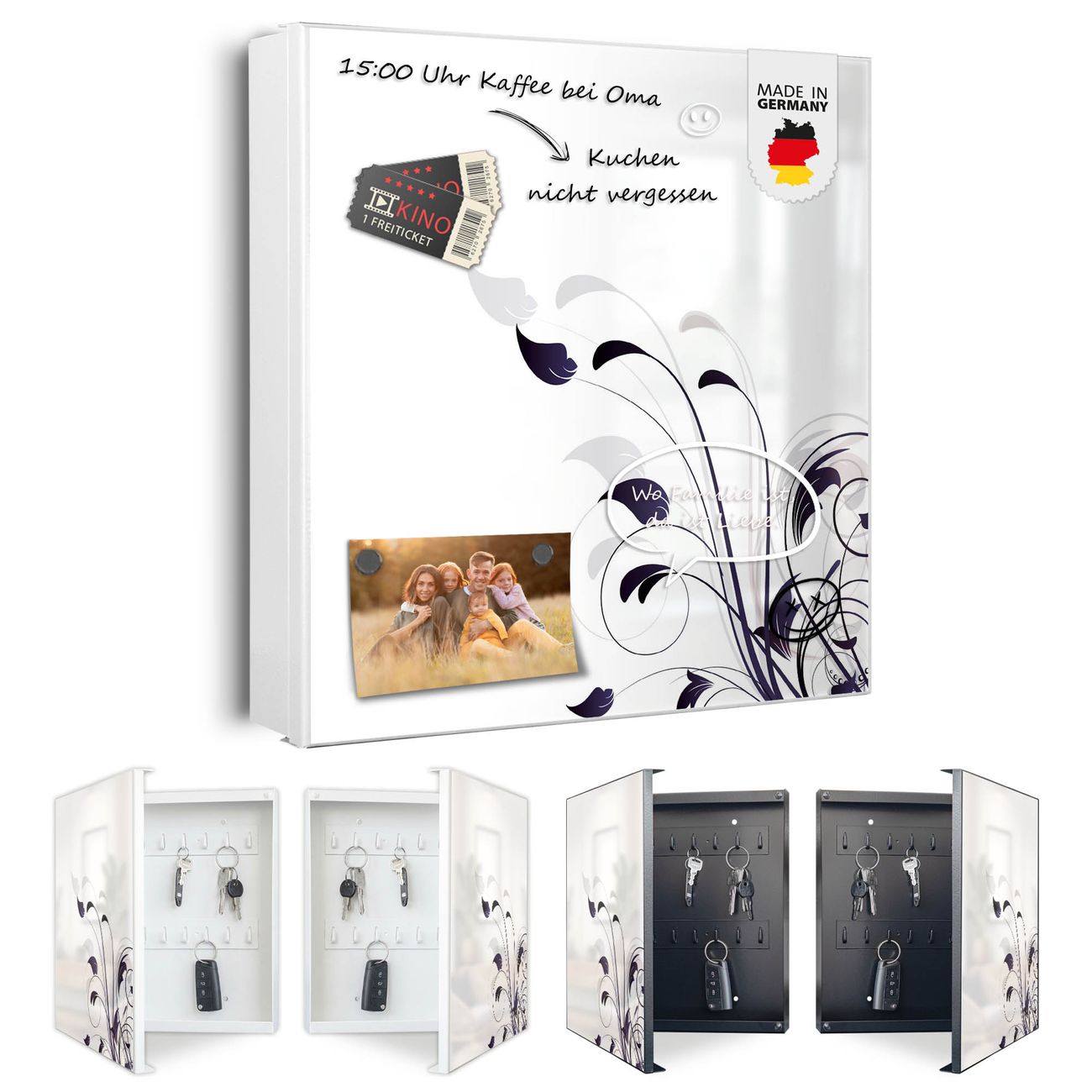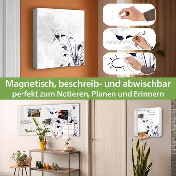 Bringe Ordnung und Eleganz in deinen Eingangsbereich mit dem banjado Schlüsselkasten Motiv Motiv Florale Eleganz. Die moderne Schlüsselbox kombiniert funktionales Design mit hochwertiger Verarbeitung und wird so zu einem echten Hingucker in Flur, Büro oder Ferienwohnung. ✅ Stilvolle Schlüsselaufbewahrung mit Motiv Motiv Florale Eleganz Der Design-Schlüsselkasten Motiv Motiv Florale Eleganz bietet Platz für bis zu 32 Schlüssel, die auf 4 stabilen Reihen mit je 8 Haken übersichtlich verstaut werden. Mit seinen kompakten Maßen von 30 x 30 x 5 cm passt die Schlüsselbox perfekt auch in kleinere Räume. Der weiß lackierte Stahlkorpus mit links angeschlagenem Türscharnier harmoniert mit gedruckten Folie auf der Front und fügt sich nahtlos in jedes Wohnambiente ein. Ob als Schlüsselorganizer für Zuhause oder als praktische Lösung für Büros, Praxen und Gewerbe, der banjado Schlüsselkasten sorgt für Ordnung und Übersicht. Dank der magnetischen, mit Kreidestiften beschreibbaren Folie auf der Front kannst du Notizen anheften oder Termine direkt auf der Oberfläche festhalten. Die Schlüsselbox Motiv Motiv Florale Eleganz zur Wandmontage wird inklusive Befestigungsmaterial geliefert und ist schnell angebracht. So hast du deine Schlüssel jederzeit griffbereit und zugleich stilvoll verstaut. Mit diesem banjado Schlüsselkasten Motiv Motiv Florale Eleganz kombinierst du praktische Aufbewahrung mit stilvollem Wohndesign. Ob privat oder geschäftlich, die Schlüsselbox sorgt für mehr Ordnung, Übersicht und ein wohnliches Ambiente.Vorteile im Überblick