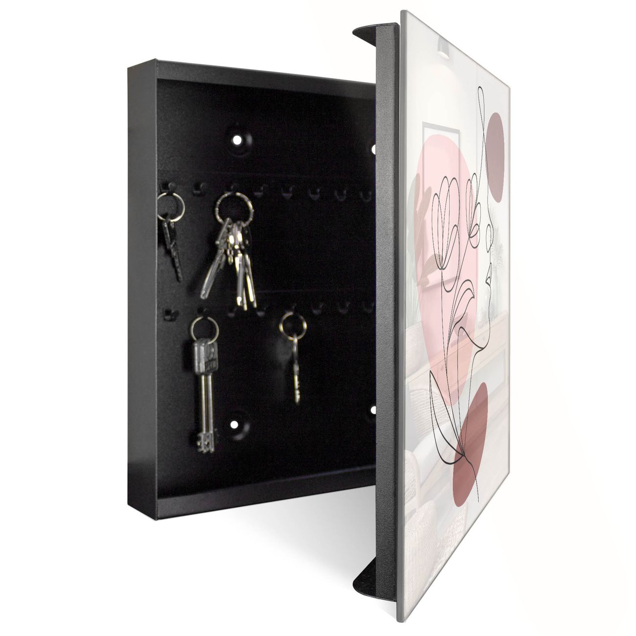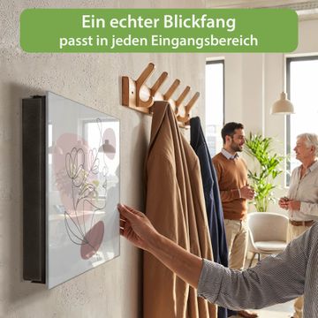 Bringe Ordnung und Eleganz in deinen Eingangsbereich mit dem banjado Schlüsselkasten Motiv Motiv Florale Line Art. Die moderne Schlüsselbox kombiniert funktionales Design mit hochwertiger Verarbeitung und wird so zu einem echten Hingucker in Flur, Büro oder Ferienwohnung. ✅ Stilvolle Schlüsselaufbewahrung mit Glasfront im Motiv Motiv Florale Line Art Der Design-Schlüsselkasten Motiv Motiv Florale Line Art bietet Platz für bis zu 50 Schlüssel, die auf 5 stabilen Reihen mit je 10 Haken übersichtlich verstaut werden. Mit seinen kompakten Maßen von 30 x 30 x 5 cm passt die Schlüsselbox perfekt auch in kleinere Räume. Der schwarz lackierte Stahlkorpus mit rechts angeschlagenem Türscharnier harmoniert mit der Glasfront und fügt sich nahtlos in jedes Wohnambiente ein. Ob als Schlüsselorganizer für Zuhause oder als praktische Lösung für Büros, Praxen und Gewerbe, der banjado Schlüsselkasten sorgt für Ordnung und Übersicht. Dank der magnetischen, mit Kreidestiften beschreibbaren Glasfront kannst du Notizen anheften oder Termine direkt auf der Oberfläche festhalten. Die Schlüsselbox Motiv Motiv Florale Line Art zur Wandmontage wird inklusive Befestigungsmaterial geliefert und ist schnell angebracht. So hast du deine Schlüssel jederzeit griffbereit und zugleich stilvoll verstaut. Mit diesem banjado Schlüsselkasten Motiv Motiv Florale Line Art kombinierst du praktische Aufbewahrung mit stilvollem Wohndesign. Ob privat oder geschäftlich, die Schlüsselbox sorgt für mehr Ordnung, Übersicht und ein wohnliches Ambiente.Vorteile im Überblick