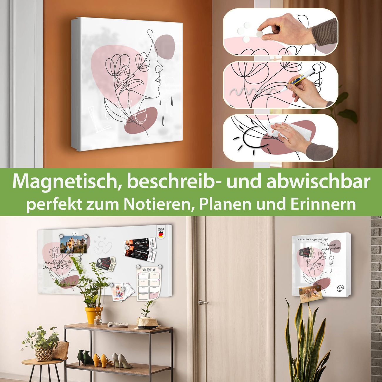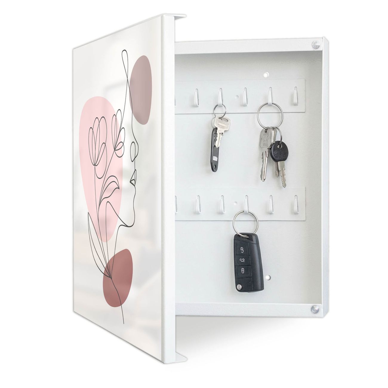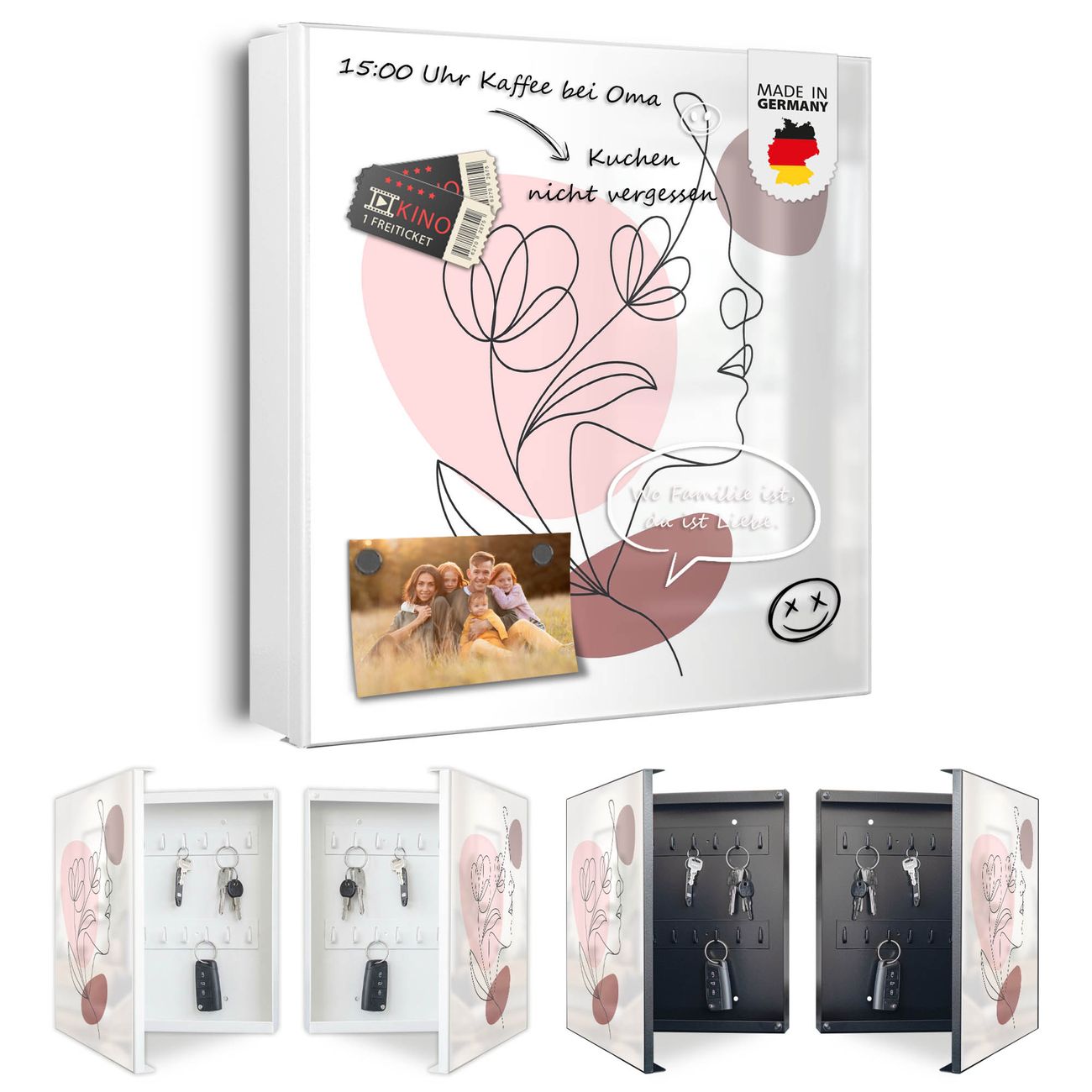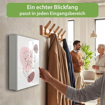 Bringe Ordnung und Eleganz in deinen Eingangsbereich mit dem banjado Schlüsselkasten Motiv Motiv Weibliche Lineart. Die moderne Schlüsselbox kombiniert funktionales Design mit hochwertiger Verarbeitung und wird so zu einem echten Hingucker in Flur, Büro oder Ferienwohnung. ✅ Stilvolle Schlüsselaufbewahrung mit Motiv Motiv Weibliche Lineart Der Design-Schlüsselkasten Motiv Motiv Weibliche Lineart bietet Platz für bis zu 32 Schlüssel, die auf 4 stabilen Reihen mit je 8 Haken übersichtlich verstaut werden. Mit seinen kompakten Maßen von 30 x 30 x 5 cm passt die Schlüsselbox perfekt auch in kleinere Räume. Der weiß lackierte Stahlkorpus mit links angeschlagenem Türscharnier harmoniert mit gedruckten Folie auf der Front und fügt sich nahtlos in jedes Wohnambiente ein. Ob als Schlüsselorganizer für Zuhause oder als praktische Lösung für Büros, Praxen und Gewerbe, der banjado Schlüsselkasten sorgt für Ordnung und Übersicht. Dank der magnetischen, mit Kreidestiften beschreibbaren Folie auf der Front kannst du Notizen anheften oder Termine direkt auf der Oberfläche festhalten. Die Schlüsselbox Motiv Motiv Weibliche Lineart zur Wandmontage wird inklusive Befestigungsmaterial geliefert und ist schnell angebracht. So hast du deine Schlüssel jederzeit griffbereit und zugleich stilvoll verstaut. Mit diesem banjado Schlüsselkasten Motiv Motiv Weibliche Lineart kombinierst du praktische Aufbewahrung mit stilvollem Wohndesign. Ob privat oder geschäftlich, die Schlüsselbox sorgt für mehr Ordnung, Übersicht und ein wohnliches Ambiente.Vorteile im Überblick
