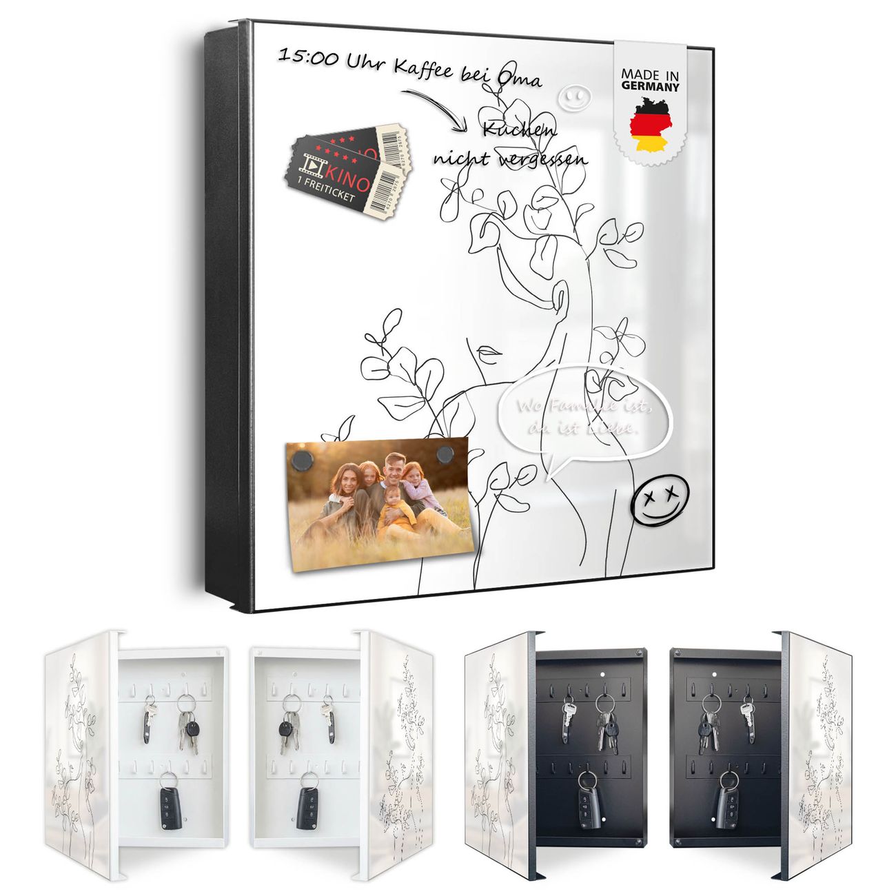 Bringe Ordnung und Eleganz in deinen Eingangsbereich mit dem banjado Schlüsselkasten Motiv Motiv Feminin Floral Lineart 3. Die moderne Schlüsselbox kombiniert funktionales Design mit hochwertiger Verarbeitung und wird so zu einem echten Hingucker in Flur, Büro oder Ferienwohnung. ✅ Stilvolle Schlüsselaufbewahrung mit Motiv Motiv Feminin Floral Lineart 3 Der Design-Schlüsselkasten Motiv Motiv Feminin Floral Lineart 3 bietet Platz für bis zu 32 Schlüssel, die auf 4 stabilen Reihen mit je 8 Haken übersichtlich verstaut werden. Mit seinen kompakten Maßen von 30 x 30 x 5 cm passt die Schlüsselbox perfekt auch in kleinere Räume. Der schwarz lackierte Stahlkorpus mit links angeschlagenem Türscharnier harmoniert mit gedruckten Folie auf der Front und fügt sich nahtlos in jedes Wohnambiente ein. Ob als Schlüsselorganizer für Zuhause oder als praktische Lösung für Büros, Praxen und Gewerbe, der banjado Schlüsselkasten sorgt für Ordnung und Übersicht. Dank der magnetischen, mit Kreidestiften beschreibbaren Folie auf der Front kannst du Notizen anheften oder Termine direkt auf der Oberfläche festhalten. Die Schlüsselbox Motiv Motiv Feminin Floral Lineart 3 zur Wandmontage wird inklusive Befestigungsmaterial geliefert und ist schnell angebracht. So hast du deine Schlüssel jederzeit griffbereit und zugleich stilvoll verstaut. Mit diesem banjado Schlüsselkasten Motiv Motiv Feminin Floral Lineart 3 kombinierst du praktische Aufbewahrung mit stilvollem Wohndesign. Ob privat oder geschäftlich, die Schlüsselbox sorgt für mehr Ordnung, Übersicht und ein wohnliches Ambiente.Vorteile im Überblick