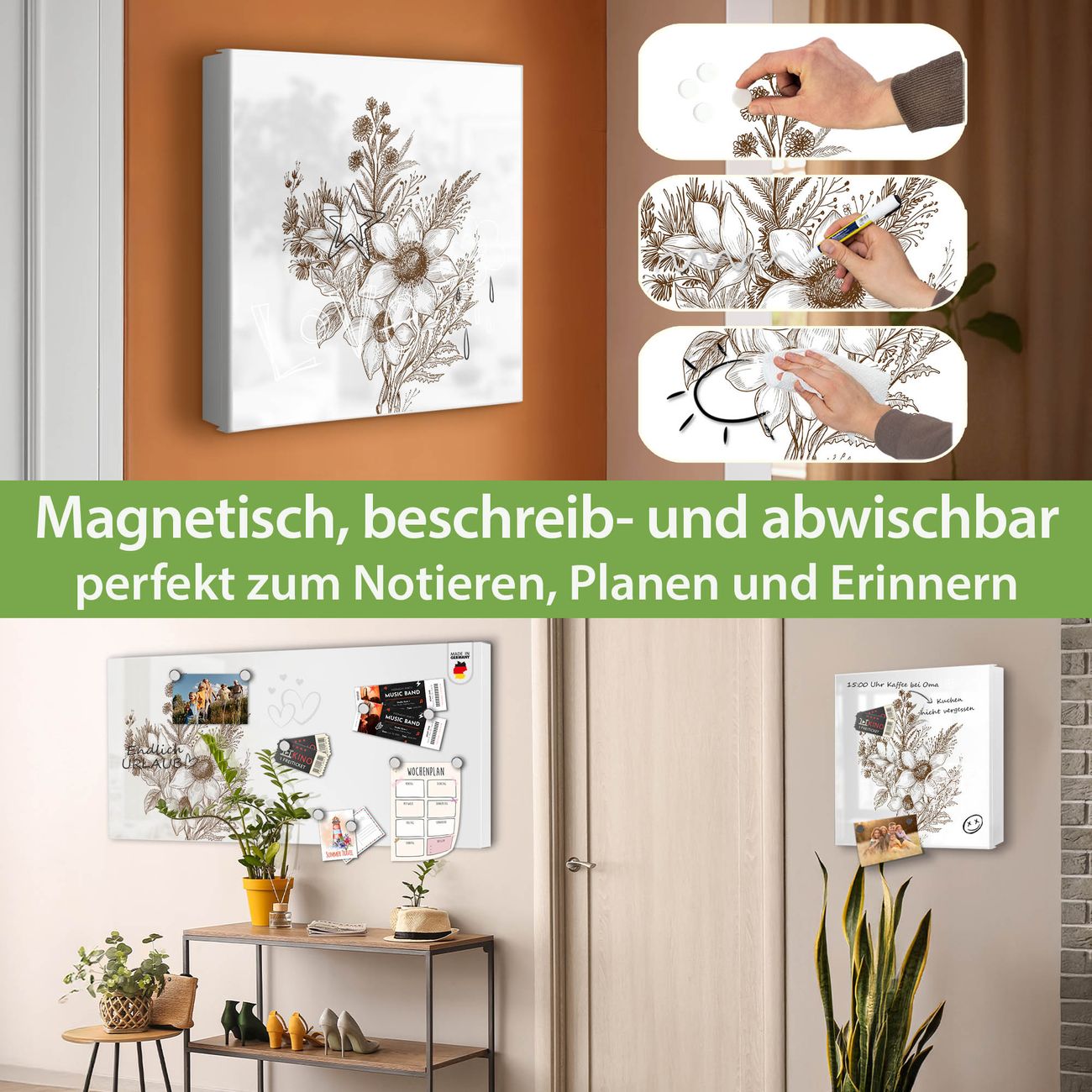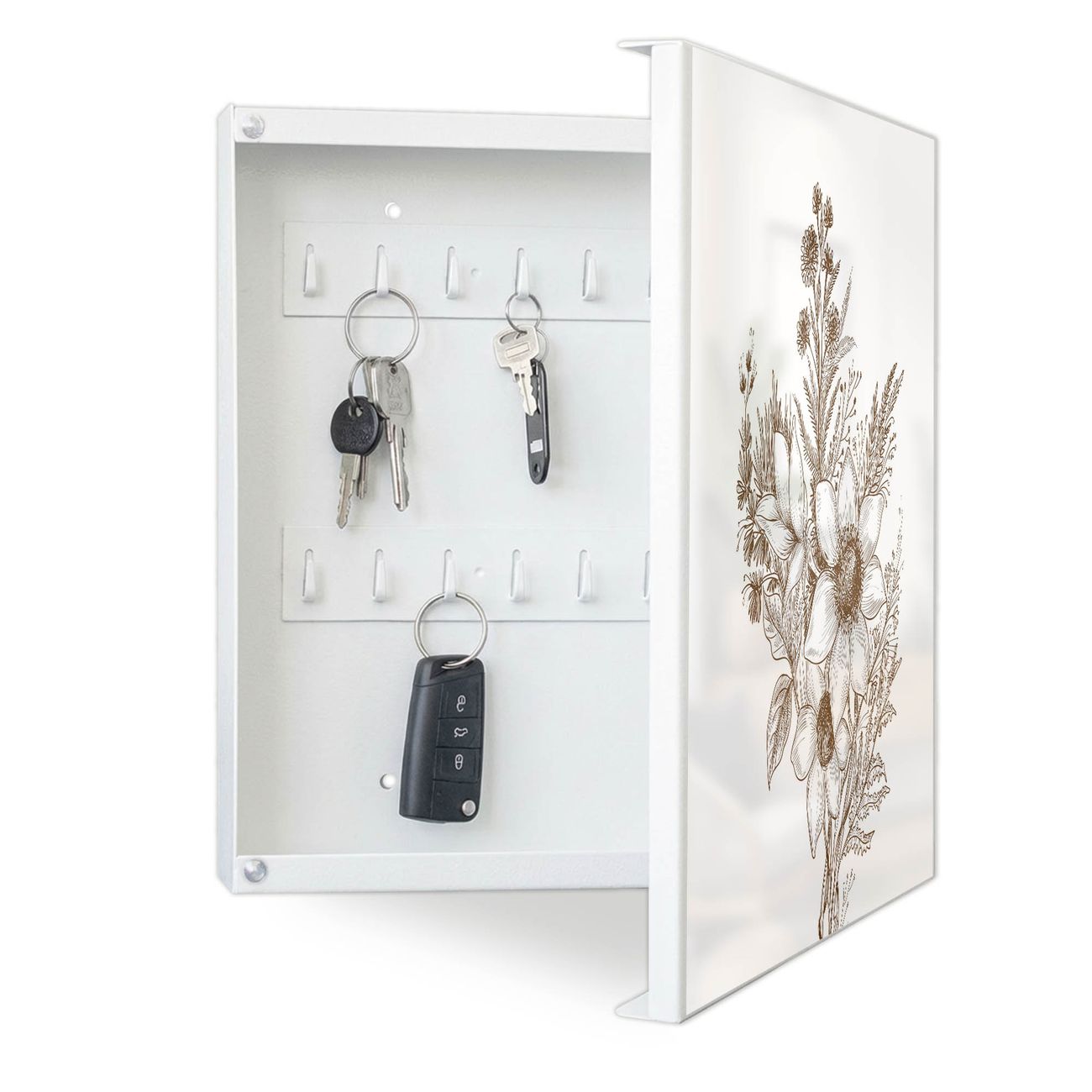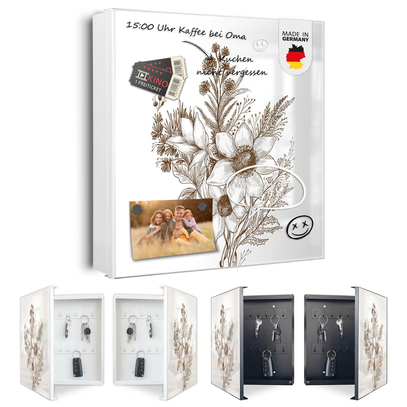 Bringe Ordnung und Eleganz in deinen Eingangsbereich mit dem banjado Schlüsselkasten Motiv Motiv Florale Zeichnung. Die moderne Schlüsselbox kombiniert funktionales Design mit hochwertiger Verarbeitung und wird so zu einem echten Hingucker in Flur, Büro oder Ferienwohnung. ✅ Stilvolle Schlüsselaufbewahrung mit Motiv Motiv Florale Zeichnung Der Design-Schlüsselkasten Motiv Motiv Florale Zeichnung bietet Platz für bis zu 32 Schlüssel, die auf 4 stabilen Reihen mit je 8 Haken übersichtlich verstaut werden. Mit seinen kompakten Maßen von 30 x 30 x 5 cm passt die Schlüsselbox perfekt auch in kleinere Räume. Der weiß lackierte Stahlkorpus mit rechts angeschlagenem Türscharnier harmoniert mit gedruckten Folie auf der Front und fügt sich nahtlos in jedes Wohnambiente ein. Ob als Schlüsselorganizer für Zuhause oder als praktische Lösung für Büros, Praxen und Gewerbe, der banjado Schlüsselkasten sorgt für Ordnung und Übersicht. Dank der magnetischen, mit Kreidestiften beschreibbaren Folie auf der Front kannst du Notizen anheften oder Termine direkt auf der Oberfläche festhalten. Die Schlüsselbox Motiv Motiv Florale Zeichnung zur Wandmontage wird inklusive Befestigungsmaterial geliefert und ist schnell angebracht. So hast du deine Schlüssel jederzeit griffbereit und zugleich stilvoll verstaut. Mit diesem banjado Schlüsselkasten Motiv Motiv Florale Zeichnung kombinierst du praktische Aufbewahrung mit stilvollem Wohndesign. Ob privat oder geschäftlich, die Schlüsselbox sorgt für mehr Ordnung, Übersicht und ein wohnliches Ambiente.Vorteile im Überblick