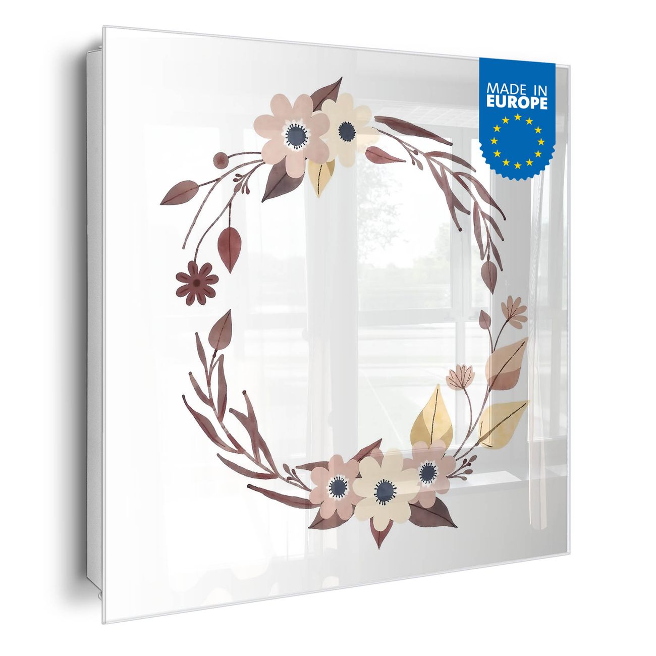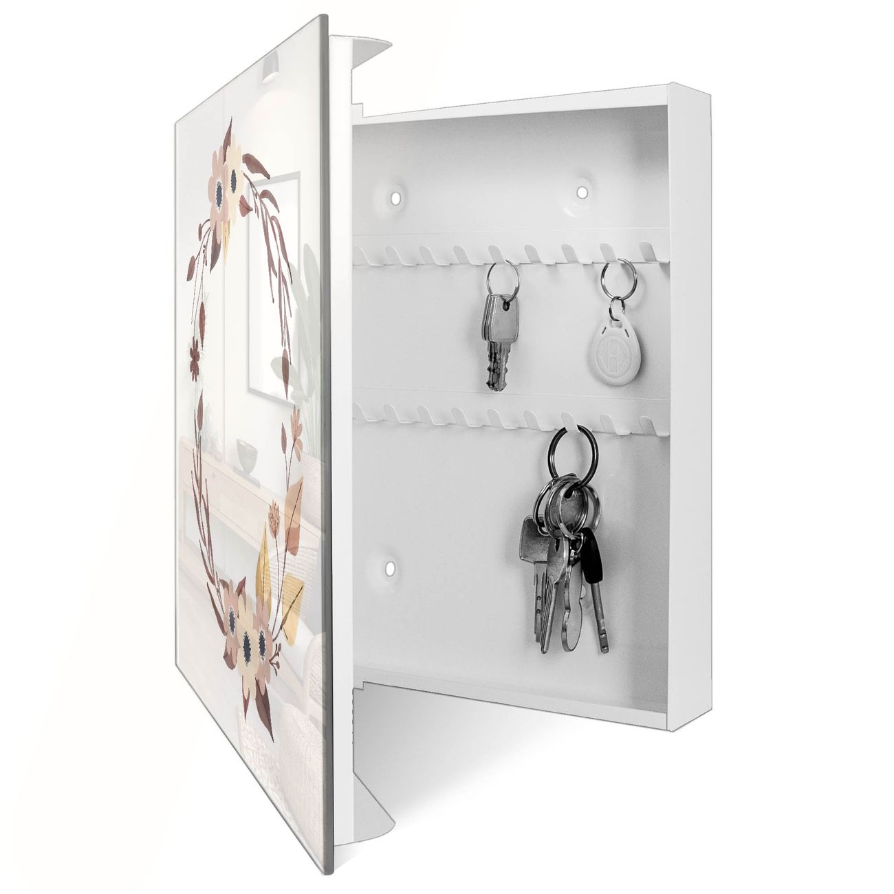 Bringe Ordnung und Eleganz in deinen Eingangsbereich mit dem banjado Schlüsselkasten Motiv Motiv Floraler Aquarellkranz. Die moderne Schlüsselbox kombiniert funktionales Design mit hochwertiger Verarbeitung und wird so zu einem echten Hingucker in Flur, Büro oder Ferienwohnung. ✅ Stilvolle Schlüsselaufbewahrung mit Glasfront im Motiv Motiv Floraler Aquarellkranz Der Design-Schlüsselkasten Motiv Motiv Floraler Aquarellkranz bietet Platz für bis zu 50 Schlüssel, die auf 5 stabilen Reihen mit je 10 Haken übersichtlich verstaut werden. Mit seinen kompakten Maßen von 30 x 30 x 5 cm passt die Schlüsselbox perfekt auch in kleinere Räume. Der weiß lackierte Stahlkorpus mit rechts angeschlagenem Türscharnier harmoniert mit der Glasfront und fügt sich nahtlos in jedes Wohnambiente ein. Ob als Schlüsselorganizer für Zuhause oder als praktische Lösung für Büros, Praxen und Gewerbe, der banjado Schlüsselkasten sorgt für Ordnung und Übersicht. Dank der magnetischen, mit Kreidestiften beschreibbaren Glasfront kannst du Notizen anheften oder Termine direkt auf der Oberfläche festhalten. Die Schlüsselbox Motiv Motiv Floraler Aquarellkranz zur Wandmontage wird inklusive Befestigungsmaterial geliefert und ist schnell angebracht. So hast du deine Schlüssel jederzeit griffbereit und zugleich stilvoll verstaut. Mit diesem banjado Schlüsselkasten Motiv Motiv Floraler Aquarellkranz kombinierst du praktische Aufbewahrung mit stilvollem Wohndesign. Ob privat oder geschäftlich, die Schlüsselbox sorgt für mehr Ordnung, Übersicht und ein wohnliches Ambiente.Vorteile im Überblick