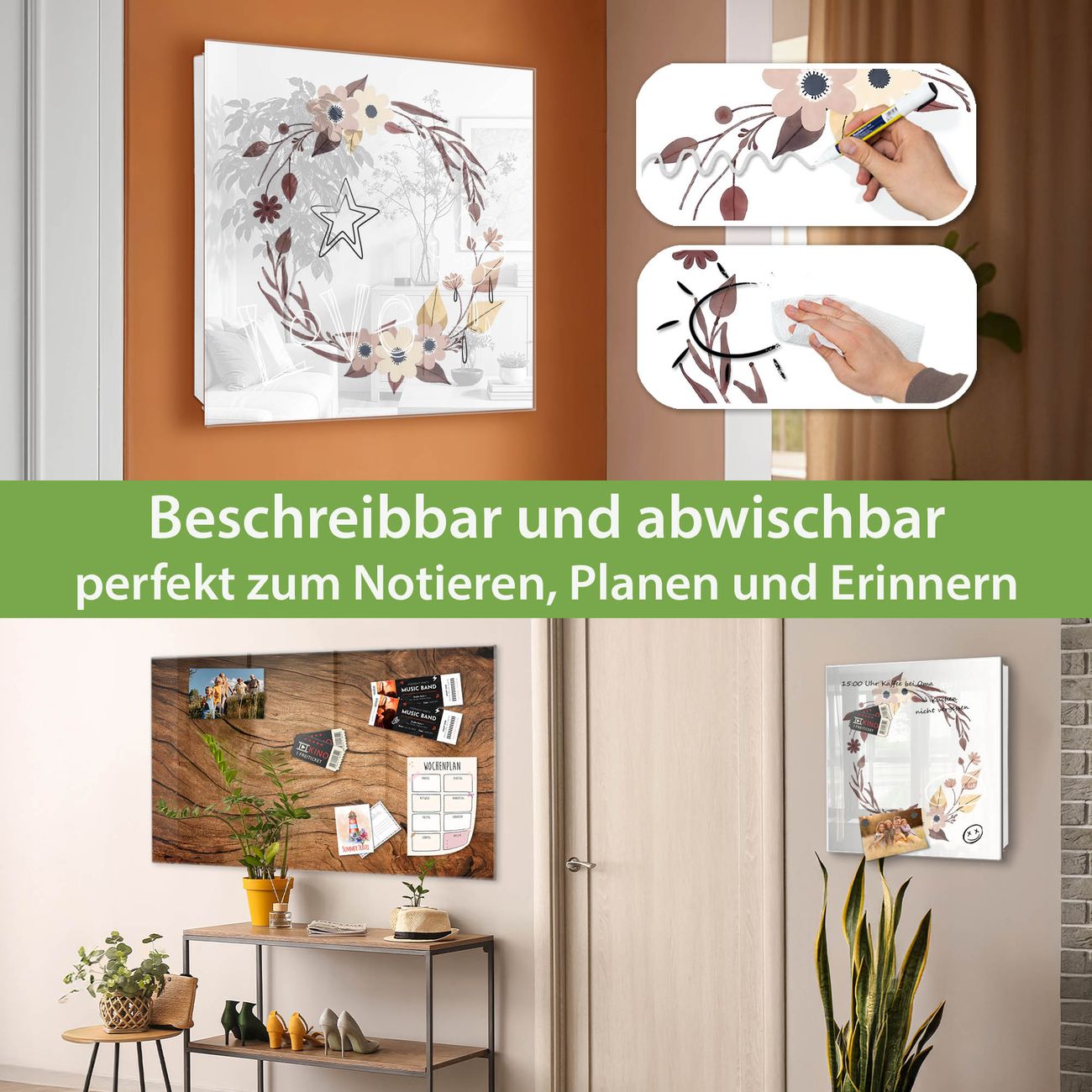 ✅ Magnetisch und mit Kreidestift beschreibbar, gehärtetes Glas, links angeschlagene TürOrdnung und Design in einem