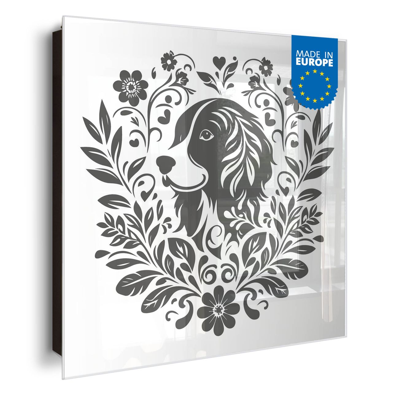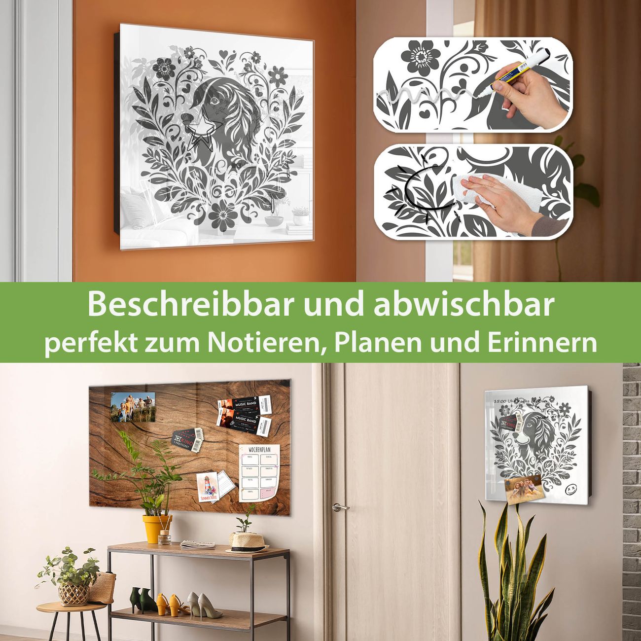 Bringe Ordnung und Eleganz in deinen Eingangsbereich mit dem banjado Schlüsselkasten Motiv Motiv Floraler Hund. Die moderne Schlüsselbox kombiniert funktionales Design mit hochwertiger Verarbeitung und wird so zu einem echten Hingucker in Flur, Büro oder Ferienwohnung. ✅ Stilvolle Schlüsselaufbewahrung mit Glasfront im Motiv Motiv Floraler Hund Der Design-Schlüsselkasten Motiv Motiv Floraler Hund bietet Platz für bis zu 50 Schlüssel, die auf 5 stabilen Reihen mit je 10 Haken übersichtlich verstaut werden. Mit seinen kompakten Maßen von 30 x 30 x 5 cm passt die Schlüsselbox perfekt auch in kleinere Räume. Der schwarz lackierte Stahlkorpus mit rechts angeschlagenem Türscharnier harmoniert mit der Glasfront und fügt sich nahtlos in jedes Wohnambiente ein. Ob als Schlüsselorganizer für Zuhause oder als praktische Lösung für Büros, Praxen und Gewerbe, der banjado Schlüsselkasten sorgt für Ordnung und Übersicht. Dank der magnetischen, mit Kreidestiften beschreibbaren Glasfront kannst du Notizen anheften oder Termine direkt auf der Oberfläche festhalten. Die Schlüsselbox Motiv Motiv Floraler Hund zur Wandmontage wird inklusive Befestigungsmaterial geliefert und ist schnell angebracht. So hast du deine Schlüssel jederzeit griffbereit und zugleich stilvoll verstaut. Mit diesem banjado Schlüsselkasten Motiv Motiv Floraler Hund kombinierst du praktische Aufbewahrung mit stilvollem Wohndesign. Ob privat oder geschäftlich, die Schlüsselbox sorgt für mehr Ordnung, Übersicht und ein wohnliches Ambiente.Vorteile im Überblick