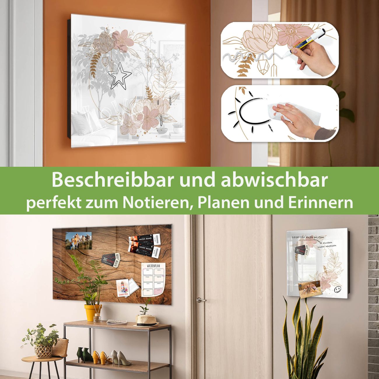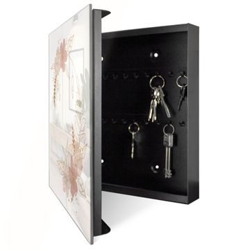 Bringe Ordnung und Eleganz in deinen Eingangsbereich mit dem banjado Schlüsselkasten Motiv Motiv Floraler Kranz. Die moderne Schlüsselbox kombiniert funktionales Design mit hochwertiger Verarbeitung und wird so zu einem echten Hingucker in Flur, Büro oder Ferienwohnung. ✅ Stilvolle Schlüsselaufbewahrung mit Glasfront im Motiv Motiv Floraler Kranz Der Design-Schlüsselkasten Motiv Motiv Floraler Kranz bietet Platz für bis zu 50 Schlüssel, die auf 5 stabilen Reihen mit je 10 Haken übersichtlich verstaut werden. Mit seinen kompakten Maßen von 30 x 30 x 5 cm passt die Schlüsselbox perfekt auch in kleinere Räume. Der schwarz lackierte Stahlkorpus mit rechts angeschlagenem Türscharnier harmoniert mit der Glasfront und fügt sich nahtlos in jedes Wohnambiente ein. Ob als Schlüsselorganizer für Zuhause oder als praktische Lösung für Büros, Praxen und Gewerbe, der banjado Schlüsselkasten sorgt für Ordnung und Übersicht. Dank der magnetischen, mit Kreidestiften beschreibbaren Glasfront kannst du Notizen anheften oder Termine direkt auf der Oberfläche festhalten. Die Schlüsselbox Motiv Motiv Floraler Kranz zur Wandmontage wird inklusive Befestigungsmaterial geliefert und ist schnell angebracht. So hast du deine Schlüssel jederzeit griffbereit und zugleich stilvoll verstaut. Mit diesem banjado Schlüsselkasten Motiv Motiv Floraler Kranz kombinierst du praktische Aufbewahrung mit stilvollem Wohndesign. Ob privat oder geschäftlich, die Schlüsselbox sorgt für mehr Ordnung, Übersicht und ein wohnliches Ambiente.Vorteile im Überblick