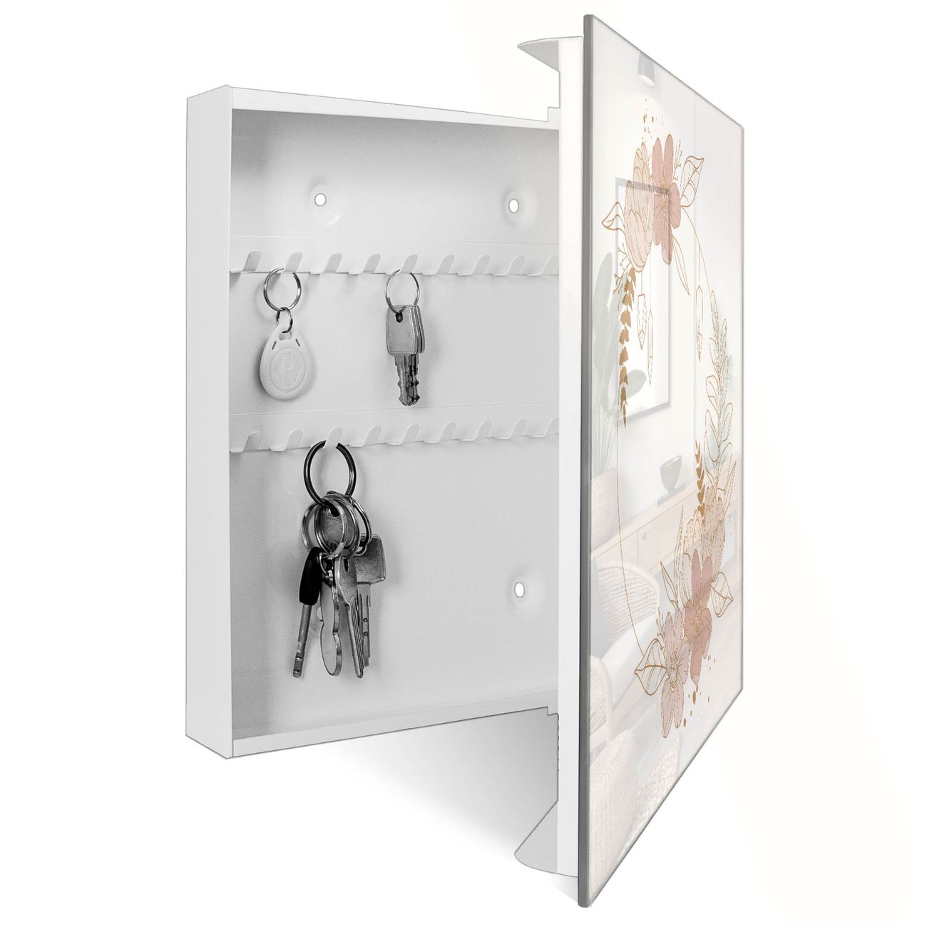 Bringe Ordnung und Eleganz in deinen Eingangsbereich mit dem banjado Schlüsselkasten Motiv Motiv Floraler Kranz. Die moderne Schlüsselbox kombiniert funktionales Design mit hochwertiger Verarbeitung und wird so zu einem echten Hingucker in Flur, Büro oder Ferienwohnung. ✅ Stilvolle Schlüsselaufbewahrung mit Glasfront im Motiv Motiv Floraler Kranz Der Design-Schlüsselkasten Motiv Motiv Floraler Kranz bietet Platz für bis zu 50 Schlüssel, die auf 5 stabilen Reihen mit je 10 Haken übersichtlich verstaut werden. Mit seinen kompakten Maßen von 30 x 30 x 5 cm passt die Schlüsselbox perfekt auch in kleinere Räume. Der weiß lackierte Stahlkorpus mit rechts angeschlagenem Türscharnier harmoniert mit der Glasfront und fügt sich nahtlos in jedes Wohnambiente ein. Ob als Schlüsselorganizer für Zuhause oder als praktische Lösung für Büros, Praxen und Gewerbe, der banjado Schlüsselkasten sorgt für Ordnung und Übersicht. Dank der magnetischen, mit Kreidestiften beschreibbaren Glasfront kannst du Notizen anheften oder Termine direkt auf der Oberfläche festhalten. Die Schlüsselbox Motiv Motiv Floraler Kranz zur Wandmontage wird inklusive Befestigungsmaterial geliefert und ist schnell angebracht. So hast du deine Schlüssel jederzeit griffbereit und zugleich stilvoll verstaut. Mit diesem banjado Schlüsselkasten Motiv Motiv Floraler Kranz kombinierst du praktische Aufbewahrung mit stilvollem Wohndesign. Ob privat oder geschäftlich, die Schlüsselbox sorgt für mehr Ordnung, Übersicht und ein wohnliches Ambiente.Vorteile im Überblick