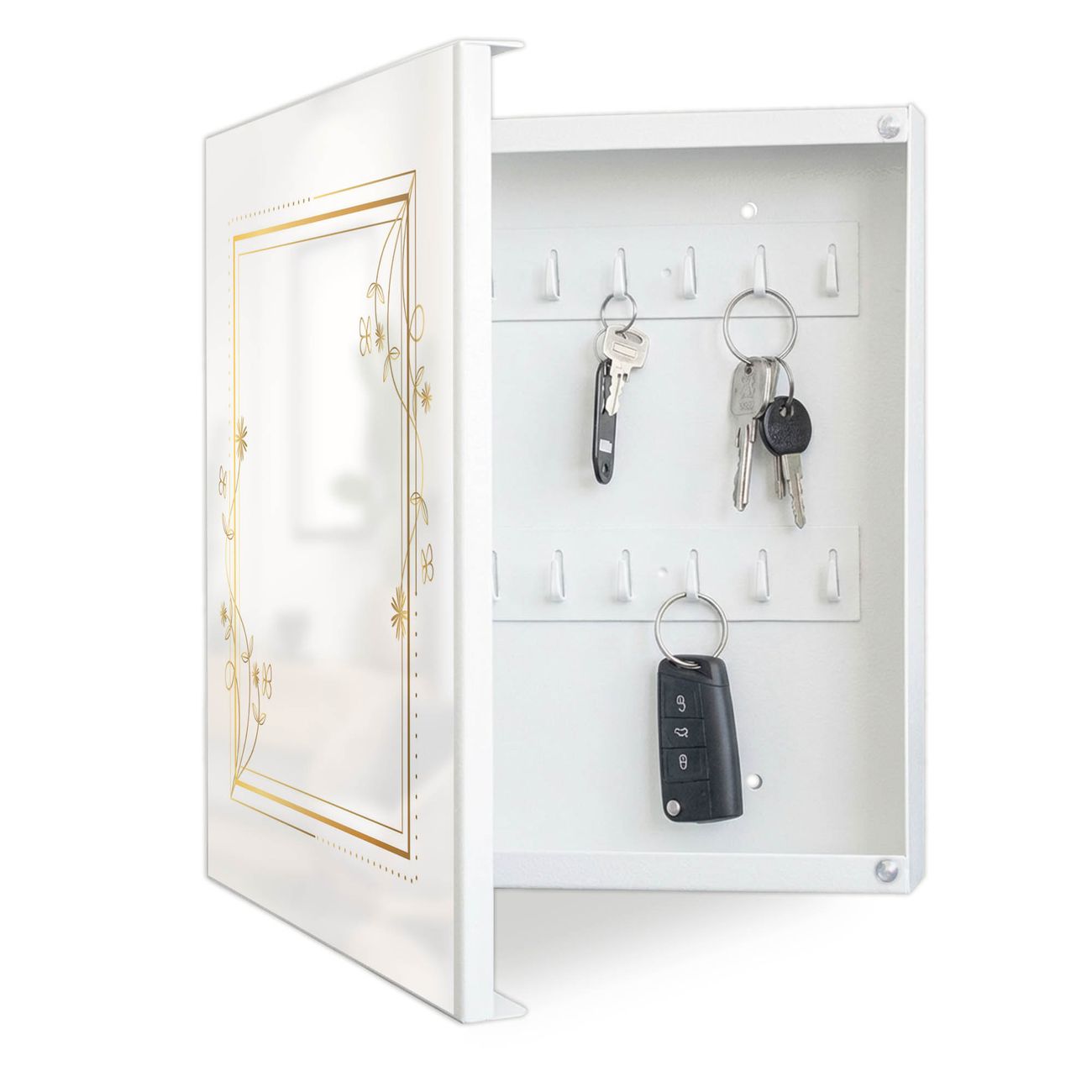 Bringe Ordnung und Eleganz in deinen Eingangsbereich mit dem banjado Schlüsselkasten Motiv Motiv Floraler Rahmen 2. Die moderne Schlüsselbox kombiniert funktionales Design mit hochwertiger Verarbeitung und wird so zu einem echten Hingucker in Flur, Büro oder Ferienwohnung. ✅ Stilvolle Schlüsselaufbewahrung mit Motiv Motiv Floraler Rahmen 2 Der Design-Schlüsselkasten Motiv Motiv Floraler Rahmen 2 bietet Platz für bis zu 32 Schlüssel, die auf 4 stabilen Reihen mit je 8 Haken übersichtlich verstaut werden. Mit seinen kompakten Maßen von 30 x 30 x 5 cm passt die Schlüsselbox perfekt auch in kleinere Räume. Der weiß lackierte Stahlkorpus mit links angeschlagenem Türscharnier harmoniert mit gedruckten Folie auf der Front und fügt sich nahtlos in jedes Wohnambiente ein. Ob als Schlüsselorganizer für Zuhause oder als praktische Lösung für Büros, Praxen und Gewerbe, der banjado Schlüsselkasten sorgt für Ordnung und Übersicht. Dank der magnetischen, mit Kreidestiften beschreibbaren Folie auf der Front kannst du Notizen anheften oder Termine direkt auf der Oberfläche festhalten. Die Schlüsselbox Motiv Motiv Floraler Rahmen 2 zur Wandmontage wird inklusive Befestigungsmaterial geliefert und ist schnell angebracht. So hast du deine Schlüssel jederzeit griffbereit und zugleich stilvoll verstaut. Mit diesem banjado Schlüsselkasten Motiv Motiv Floraler Rahmen 2 kombinierst du praktische Aufbewahrung mit stilvollem Wohndesign. Ob privat oder geschäftlich, die Schlüsselbox sorgt für mehr Ordnung, Übersicht und ein wohnliches Ambiente.Vorteile im Überblick
