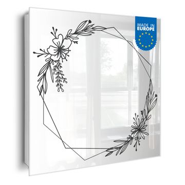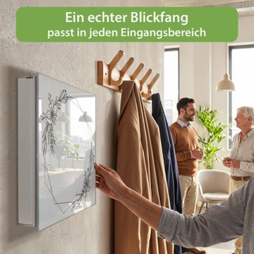 Bringe Ordnung und Eleganz in deinen Eingangsbereich mit dem banjado Schlüsselkasten Motiv Motiv Floraler Rahmen. Die moderne Schlüsselbox kombiniert funktionales Design mit hochwertiger Verarbeitung und wird so zu einem echten Hingucker in Flur, Büro oder Ferienwohnung. ✅ Stilvolle Schlüsselaufbewahrung mit Glasfront im Motiv Motiv Floraler Rahmen Der Design-Schlüsselkasten Motiv Motiv Floraler Rahmen bietet Platz für bis zu 50 Schlüssel, die auf 5 stabilen Reihen mit je 10 Haken übersichtlich verstaut werden. Mit seinen kompakten Maßen von 30 x 30 x 5 cm passt die Schlüsselbox perfekt auch in kleinere Räume. Der weiß lackierte Stahlkorpus mit rechts angeschlagenem Türscharnier harmoniert mit der Glasfront und fügt sich nahtlos in jedes Wohnambiente ein. Ob als Schlüsselorganizer für Zuhause oder als praktische Lösung für Büros, Praxen und Gewerbe, der banjado Schlüsselkasten sorgt für Ordnung und Übersicht. Dank der magnetischen, mit Kreidestiften beschreibbaren Glasfront kannst du Notizen anheften oder Termine direkt auf der Oberfläche festhalten. Die Schlüsselbox Motiv Motiv Floraler Rahmen zur Wandmontage wird inklusive Befestigungsmaterial geliefert und ist schnell angebracht. So hast du deine Schlüssel jederzeit griffbereit und zugleich stilvoll verstaut. Mit diesem banjado Schlüsselkasten Motiv Motiv Floraler Rahmen kombinierst du praktische Aufbewahrung mit stilvollem Wohndesign. Ob privat oder geschäftlich, die Schlüsselbox sorgt für mehr Ordnung, Übersicht und ein wohnliches Ambiente.Vorteile im Überblick