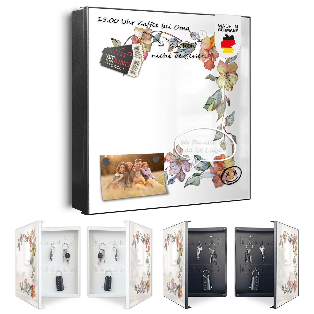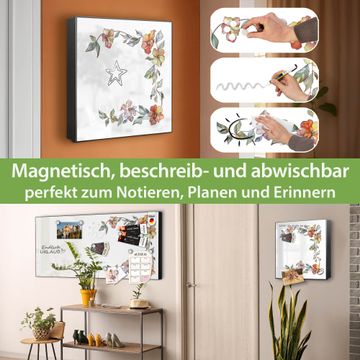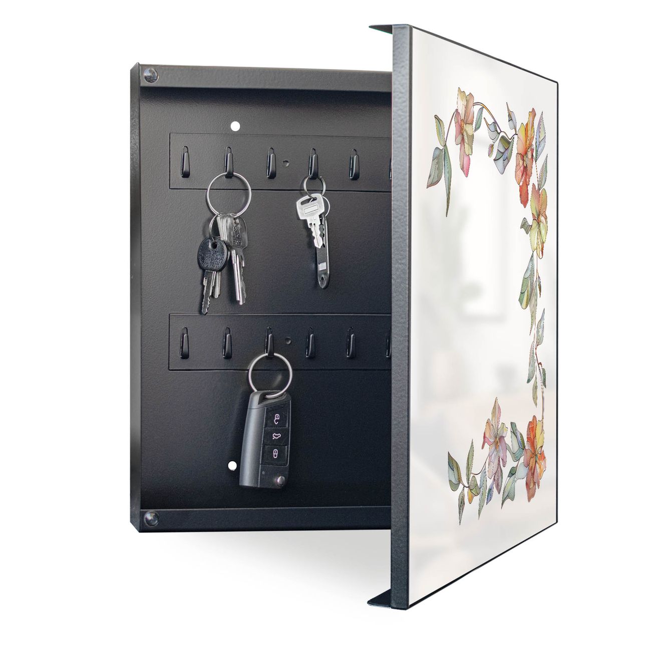 Bringe Ordnung und Eleganz in deinen Eingangsbereich mit dem banjado Schlüsselkasten Motiv Motiv Floraler Rahmen. Die moderne Schlüsselbox kombiniert funktionales Design mit hochwertiger Verarbeitung und wird so zu einem echten Hingucker in Flur, Büro oder Ferienwohnung. ✅ Stilvolle Schlüsselaufbewahrung mit Motiv Motiv Floraler Rahmen Der Design-Schlüsselkasten Motiv Motiv Floraler Rahmen bietet Platz für bis zu 32 Schlüssel, die auf 4 stabilen Reihen mit je 8 Haken übersichtlich verstaut werden. Mit seinen kompakten Maßen von 30 x 30 x 5 cm passt die Schlüsselbox perfekt auch in kleinere Räume. Der schwarz lackierte Stahlkorpus mit rechts angeschlagenem Türscharnier harmoniert mit gedruckten Folie auf der Front und fügt sich nahtlos in jedes Wohnambiente ein. Ob als Schlüsselorganizer für Zuhause oder als praktische Lösung für Büros, Praxen und Gewerbe, der banjado Schlüsselkasten sorgt für Ordnung und Übersicht. Dank der magnetischen, mit Kreidestiften beschreibbaren Folie auf der Front kannst du Notizen anheften oder Termine direkt auf der Oberfläche festhalten. Die Schlüsselbox Motiv Motiv Floraler Rahmen zur Wandmontage wird inklusive Befestigungsmaterial geliefert und ist schnell angebracht. So hast du deine Schlüssel jederzeit griffbereit und zugleich stilvoll verstaut. Mit diesem banjado Schlüsselkasten Motiv Motiv Floraler Rahmen kombinierst du praktische Aufbewahrung mit stilvollem Wohndesign. Ob privat oder geschäftlich, die Schlüsselbox sorgt für mehr Ordnung, Übersicht und ein wohnliches Ambiente.Vorteile im Überblick