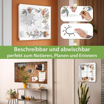 Bringe Ordnung und Eleganz in deinen Eingangsbereich mit dem banjado Schlüsselkasten Motiv Motiv Florales Kunstwerk. Die moderne Schlüsselbox kombiniert funktionales Design mit hochwertiger Verarbeitung und wird so zu einem echten Hingucker in Flur, Büro oder Ferienwohnung. ✅ Stilvolle Schlüsselaufbewahrung mit Glasfront im Motiv Motiv Florales Kunstwerk Der Design-Schlüsselkasten Motiv Motiv Florales Kunstwerk bietet Platz für bis zu 50 Schlüssel, die auf 5 stabilen Reihen mit je 10 Haken übersichtlich verstaut werden. Mit seinen kompakten Maßen von 30 x 30 x 5 cm passt die Schlüsselbox perfekt auch in kleinere Räume. Der weiß lackierte Stahlkorpus mit rechts angeschlagenem Türscharnier harmoniert mit der Glasfront und fügt sich nahtlos in jedes Wohnambiente ein. Ob als Schlüsselorganizer für Zuhause oder als praktische Lösung für Büros, Praxen und Gewerbe, der banjado Schlüsselkasten sorgt für Ordnung und Übersicht. Dank der magnetischen, mit Kreidestiften beschreibbaren Glasfront kannst du Notizen anheften oder Termine direkt auf der Oberfläche festhalten. Die Schlüsselbox Motiv Motiv Florales Kunstwerk zur Wandmontage wird inklusive Befestigungsmaterial geliefert und ist schnell angebracht. So hast du deine Schlüssel jederzeit griffbereit und zugleich stilvoll verstaut. Mit diesem banjado Schlüsselkasten Motiv Motiv Florales Kunstwerk kombinierst du praktische Aufbewahrung mit stilvollem Wohndesign. Ob privat oder geschäftlich, die Schlüsselbox sorgt für mehr Ordnung, Übersicht und ein wohnliches Ambiente.Vorteile im Überblick
