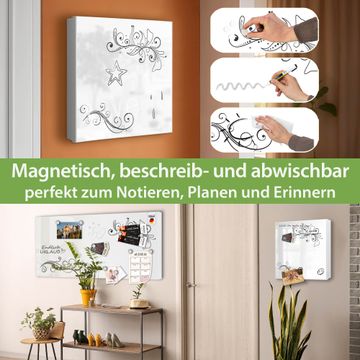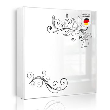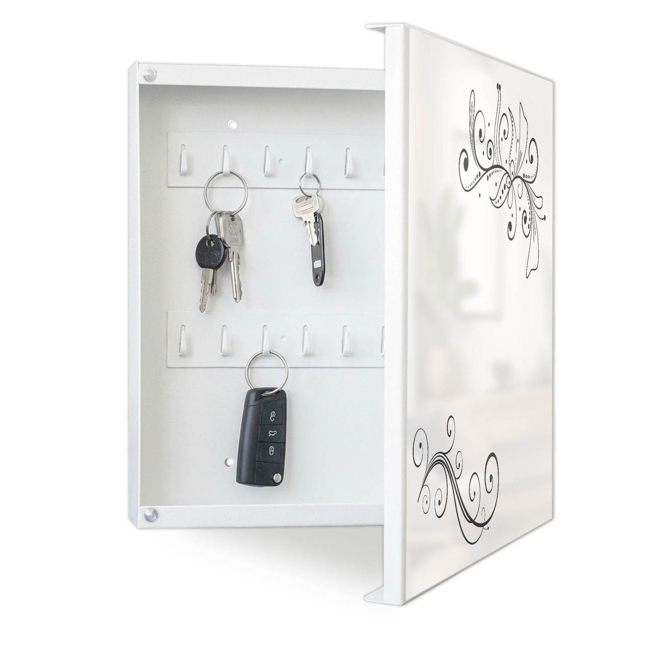 Bringe Ordnung und Eleganz in deinen Eingangsbereich mit dem banjado Schlüsselkasten Motiv Motiv Florales Ornament. Die moderne Schlüsselbox kombiniert funktionales Design mit hochwertiger Verarbeitung und wird so zu einem echten Hingucker in Flur, Büro oder Ferienwohnung. ✅ Stilvolle Schlüsselaufbewahrung mit Motiv Motiv Florales Ornament Der Design-Schlüsselkasten Motiv Motiv Florales Ornament bietet Platz für bis zu 32 Schlüssel, die auf 4 stabilen Reihen mit je 8 Haken übersichtlich verstaut werden. Mit seinen kompakten Maßen von 30 x 30 x 5 cm passt die Schlüsselbox perfekt auch in kleinere Räume. Der weiß lackierte Stahlkorpus mit rechts angeschlagenem Türscharnier harmoniert mit gedruckten Folie auf der Front und fügt sich nahtlos in jedes Wohnambiente ein. Ob als Schlüsselorganizer für Zuhause oder als praktische Lösung für Büros, Praxen und Gewerbe, der banjado Schlüsselkasten sorgt für Ordnung und Übersicht. Dank der magnetischen, mit Kreidestiften beschreibbaren Folie auf der Front kannst du Notizen anheften oder Termine direkt auf der Oberfläche festhalten. Die Schlüsselbox Motiv Motiv Florales Ornament zur Wandmontage wird inklusive Befestigungsmaterial geliefert und ist schnell angebracht. So hast du deine Schlüssel jederzeit griffbereit und zugleich stilvoll verstaut. Mit diesem banjado Schlüsselkasten Motiv Motiv Florales Ornament kombinierst du praktische Aufbewahrung mit stilvollem Wohndesign. Ob privat oder geschäftlich, die Schlüsselbox sorgt für mehr Ordnung, Übersicht und ein wohnliches Ambiente.Vorteile im Überblick