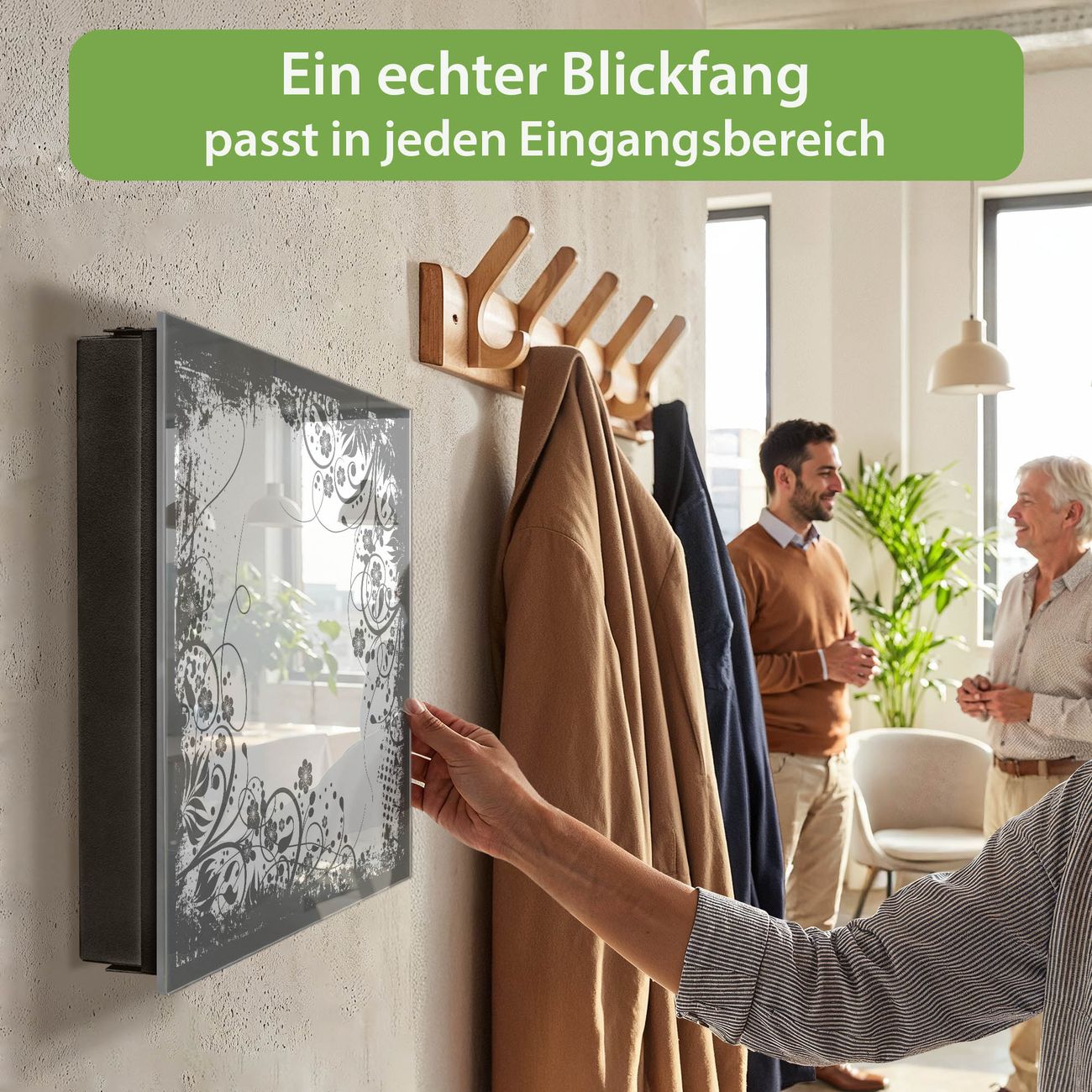 Bringe Ordnung und Eleganz in deinen Eingangsbereich mit dem banjado Schlüsselkasten Motiv Motiv Florales Schwarz-Weiß Muster. Die moderne Schlüsselbox kombiniert funktionales Design mit hochwertiger Verarbeitung und wird so zu einem echten Hingucker in Flur, Büro oder Ferienwohnung. ✅ Stilvolle Schlüsselaufbewahrung mit Glasfront im Motiv Motiv Florales Schwarz-Weiß Muster Der Design-Schlüsselkasten Motiv Motiv Florales Schwarz-Weiß Muster bietet Platz für bis zu 50 Schlüssel, die auf 5 stabilen Reihen mit je 10 Haken übersichtlich verstaut werden. Mit seinen kompakten Maßen von 30 x 30 x 5 cm passt die Schlüsselbox perfekt auch in kleinere Räume. Der schwarz lackierte Stahlkorpus mit rechts angeschlagenem Türscharnier harmoniert mit der Glasfront und fügt sich nahtlos in jedes Wohnambiente ein. Ob als Schlüsselorganizer für Zuhause oder als praktische Lösung für Büros, Praxen und Gewerbe, der banjado Schlüsselkasten sorgt für Ordnung und Übersicht. Dank der magnetischen, mit Kreidestiften beschreibbaren Glasfront kannst du Notizen anheften oder Termine direkt auf der Oberfläche festhalten. Die Schlüsselbox Motiv Motiv Florales Schwarz-Weiß Muster zur Wandmontage wird inklusive Befestigungsmaterial geliefert und ist schnell angebracht. So hast du deine Schlüssel jederzeit griffbereit und zugleich stilvoll verstaut. Mit diesem banjado Schlüsselkasten Motiv Motiv Florales Schwarz-Weiß Muster kombinierst du praktische Aufbewahrung mit stilvollem Wohndesign. Ob privat oder geschäftlich, die Schlüsselbox sorgt für mehr Ordnung, Übersicht und ein wohnliches Ambiente.Vorteile im Überblick