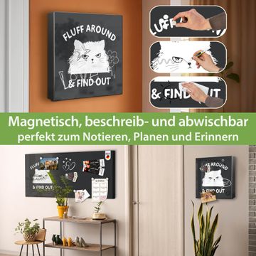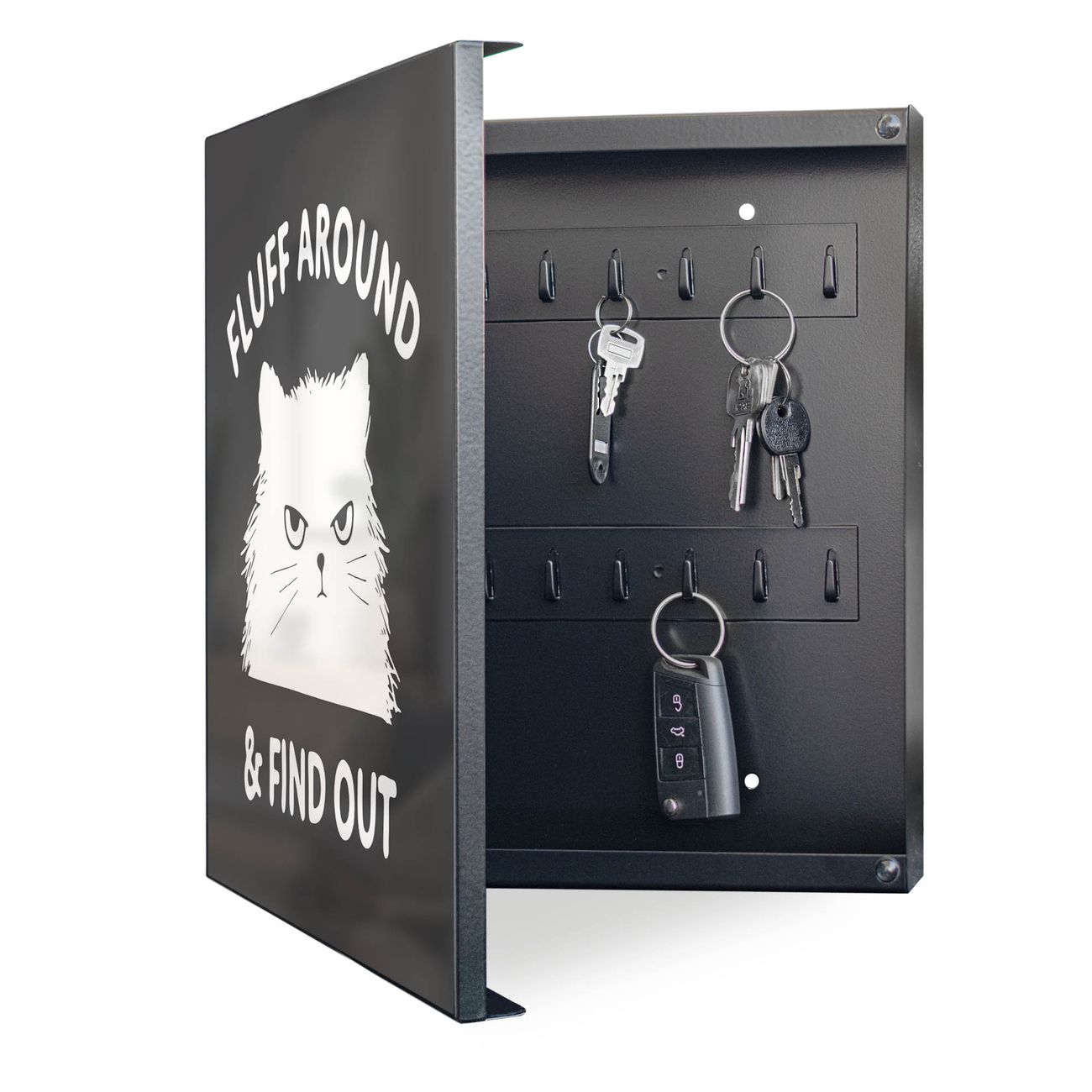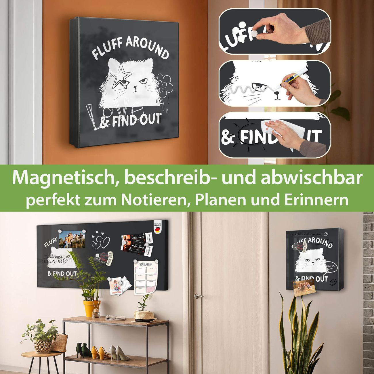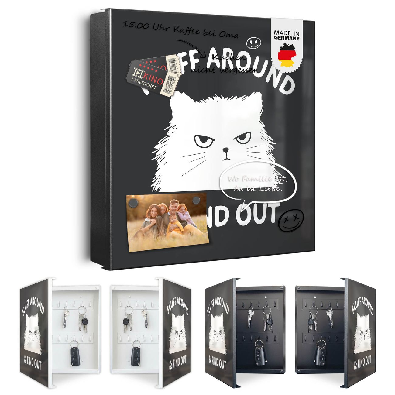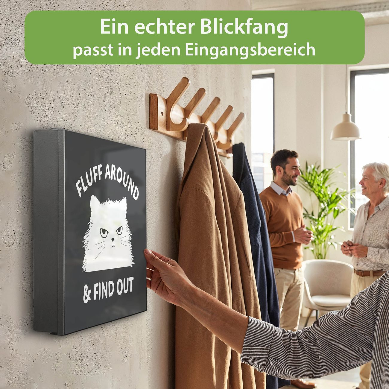 Bringe Ordnung und Eleganz in deinen Eingangsbereich mit dem banjado Schlüsselkasten Motiv Motiv Fluff Around Cat. Die moderne Schlüsselbox kombiniert funktionales Design mit hochwertiger Verarbeitung und wird so zu einem echten Hingucker in Flur, Büro oder Ferienwohnung. ✅ Stilvolle Schlüsselaufbewahrung mit Motiv Motiv Fluff Around Cat Der Design-Schlüsselkasten Motiv Motiv Fluff Around Cat bietet Platz für bis zu 32 Schlüssel, die auf 4 stabilen Reihen mit je 8 Haken übersichtlich verstaut werden. Mit seinen kompakten Maßen von 30 x 30 x 5 cm passt die Schlüsselbox perfekt auch in kleinere Räume. Der schwarz lackierte Stahlkorpus mit links angeschlagenem Türscharnier harmoniert mit gedruckten Folie auf der Front und fügt sich nahtlos in jedes Wohnambiente ein. Ob als Schlüsselorganizer für Zuhause oder als praktische Lösung für Büros, Praxen und Gewerbe, der banjado Schlüsselkasten sorgt für Ordnung und Übersicht. Dank der magnetischen, mit Kreidestiften beschreibbaren Folie auf der Front kannst du Notizen anheften oder Termine direkt auf der Oberfläche festhalten. Die Schlüsselbox Motiv Motiv Fluff Around Cat zur Wandmontage wird inklusive Befestigungsmaterial geliefert und ist schnell angebracht. So hast du deine Schlüssel jederzeit griffbereit und zugleich stilvoll verstaut. Mit diesem banjado Schlüsselkasten Motiv Motiv Fluff Around Cat kombinierst du praktische Aufbewahrung mit stilvollem Wohndesign. Ob privat oder geschäftlich, die Schlüsselbox sorgt für mehr Ordnung, Übersicht und ein wohnliches Ambiente.Vorteile im Überblick