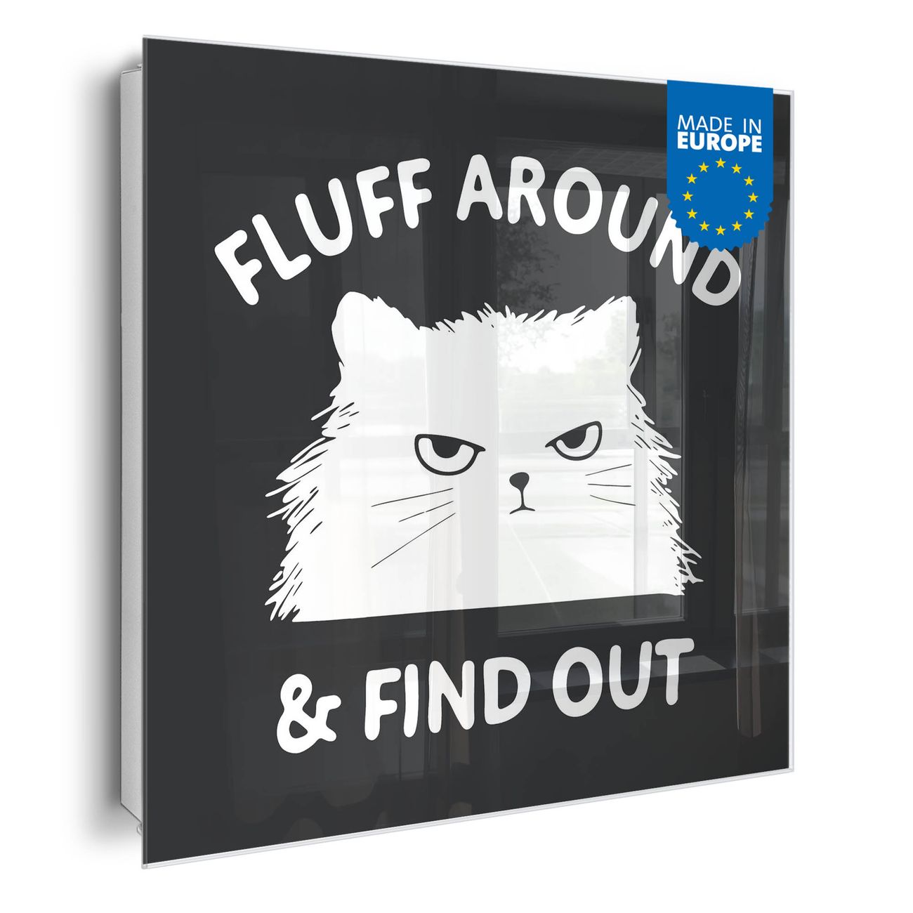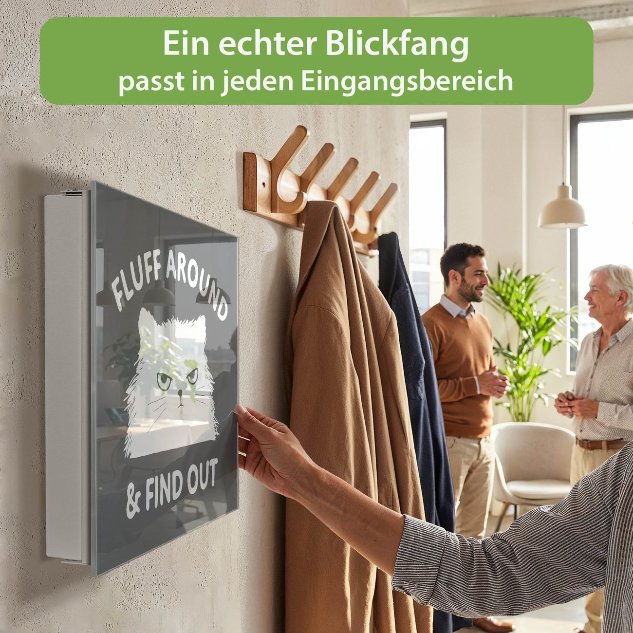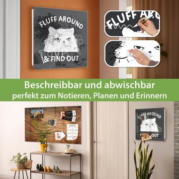 Bringe Ordnung und Eleganz in deinen Eingangsbereich mit dem banjado Schlüsselkasten Motiv Motiv Fluff Around Cat. Die moderne Schlüsselbox kombiniert funktionales Design mit hochwertiger Verarbeitung und wird so zu einem echten Hingucker in Flur, Büro oder Ferienwohnung. ✅ Stilvolle Schlüsselaufbewahrung mit Glasfront im Motiv Motiv Fluff Around Cat Der Design-Schlüsselkasten Motiv Motiv Fluff Around Cat bietet Platz für bis zu 50 Schlüssel, die auf 5 stabilen Reihen mit je 10 Haken übersichtlich verstaut werden. Mit seinen kompakten Maßen von 30 x 30 x 5 cm passt die Schlüsselbox perfekt auch in kleinere Räume. Der weiß lackierte Stahlkorpus mit rechts angeschlagenem Türscharnier harmoniert mit der Glasfront und fügt sich nahtlos in jedes Wohnambiente ein. Ob als Schlüsselorganizer für Zuhause oder als praktische Lösung für Büros, Praxen und Gewerbe, der banjado Schlüsselkasten sorgt für Ordnung und Übersicht. Dank der magnetischen, mit Kreidestiften beschreibbaren Glasfront kannst du Notizen anheften oder Termine direkt auf der Oberfläche festhalten. Die Schlüsselbox Motiv Motiv Fluff Around Cat zur Wandmontage wird inklusive Befestigungsmaterial geliefert und ist schnell angebracht. So hast du deine Schlüssel jederzeit griffbereit und zugleich stilvoll verstaut. Mit diesem banjado Schlüsselkasten Motiv Motiv Fluff Around Cat kombinierst du praktische Aufbewahrung mit stilvollem Wohndesign. Ob privat oder geschäftlich, die Schlüsselbox sorgt für mehr Ordnung, Übersicht und ein wohnliches Ambiente.Vorteile im Überblick