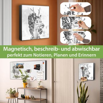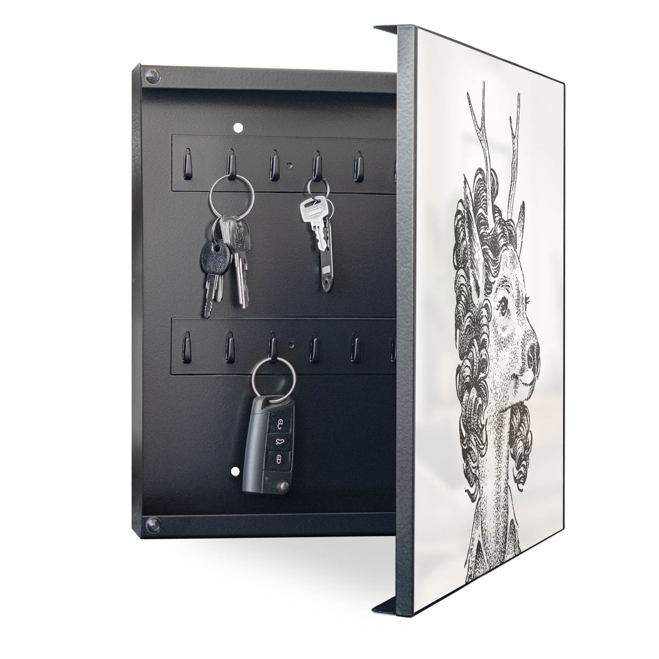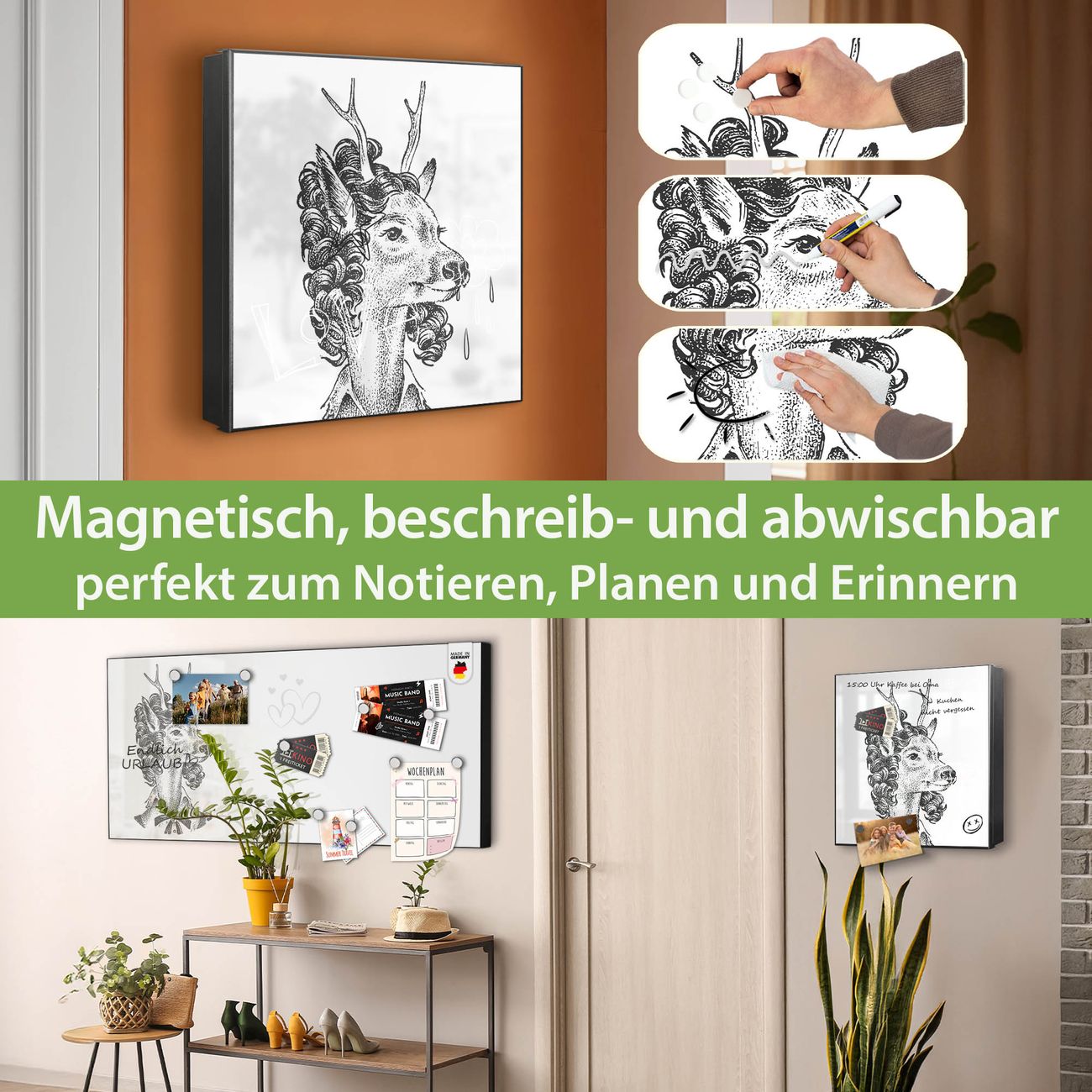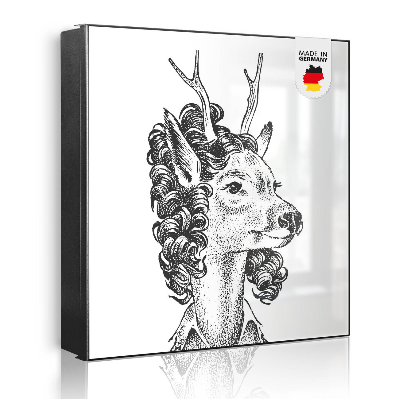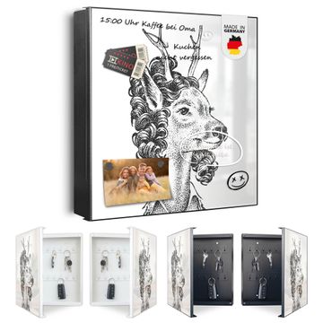 Bringe Ordnung und Eleganz in deinen Eingangsbereich mit dem banjado Schlüsselkasten Motiv Motiv Frau Hirsch 2. Die moderne Schlüsselbox kombiniert funktionales Design mit hochwertiger Verarbeitung und wird so zu einem echten Hingucker in Flur, Büro oder Ferienwohnung. ✅ Stilvolle Schlüsselaufbewahrung mit Motiv Motiv Frau Hirsch 2 Der Design-Schlüsselkasten Motiv Motiv Frau Hirsch 2 bietet Platz für bis zu 32 Schlüssel, die auf 4 stabilen Reihen mit je 8 Haken übersichtlich verstaut werden. Mit seinen kompakten Maßen von 30 x 30 x 5 cm passt die Schlüsselbox perfekt auch in kleinere Räume. Der schwarz lackierte Stahlkorpus mit rechts angeschlagenem Türscharnier harmoniert mit gedruckten Folie auf der Front und fügt sich nahtlos in jedes Wohnambiente ein. Ob als Schlüsselorganizer für Zuhause oder als praktische Lösung für Büros, Praxen und Gewerbe, der banjado Schlüsselkasten sorgt für Ordnung und Übersicht. Dank der magnetischen, mit Kreidestiften beschreibbaren Folie auf der Front kannst du Notizen anheften oder Termine direkt auf der Oberfläche festhalten. Die Schlüsselbox Motiv Motiv Frau Hirsch 2 zur Wandmontage wird inklusive Befestigungsmaterial geliefert und ist schnell angebracht. So hast du deine Schlüssel jederzeit griffbereit und zugleich stilvoll verstaut. Mit diesem banjado Schlüsselkasten Motiv Motiv Frau Hirsch 2 kombinierst du praktische Aufbewahrung mit stilvollem Wohndesign. Ob privat oder geschäftlich, die Schlüsselbox sorgt für mehr Ordnung, Übersicht und ein wohnliches Ambiente.Vorteile im Überblick