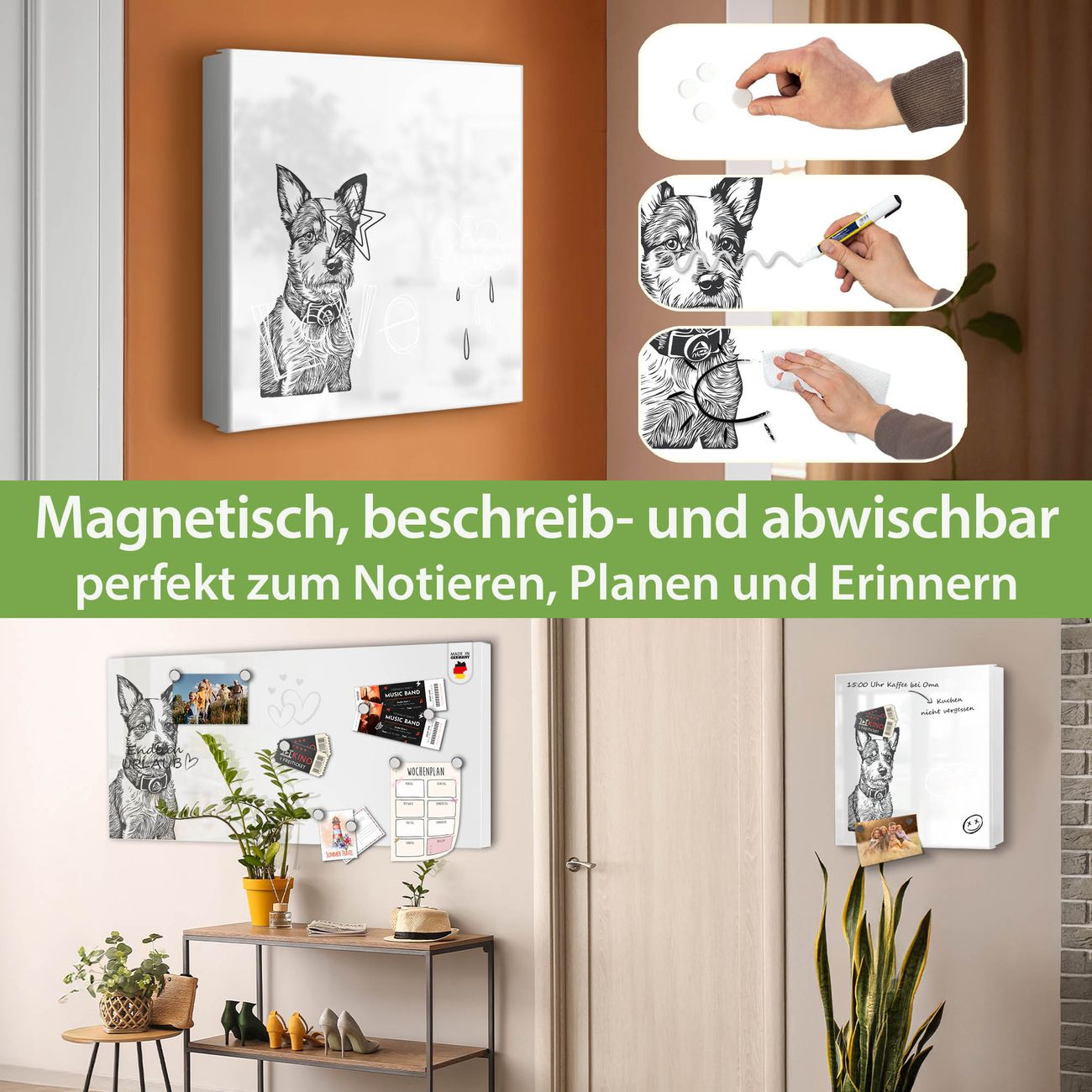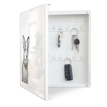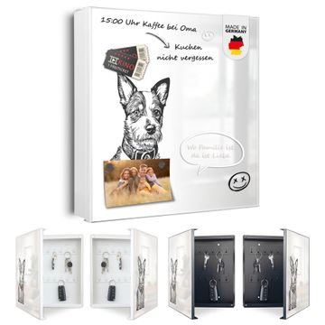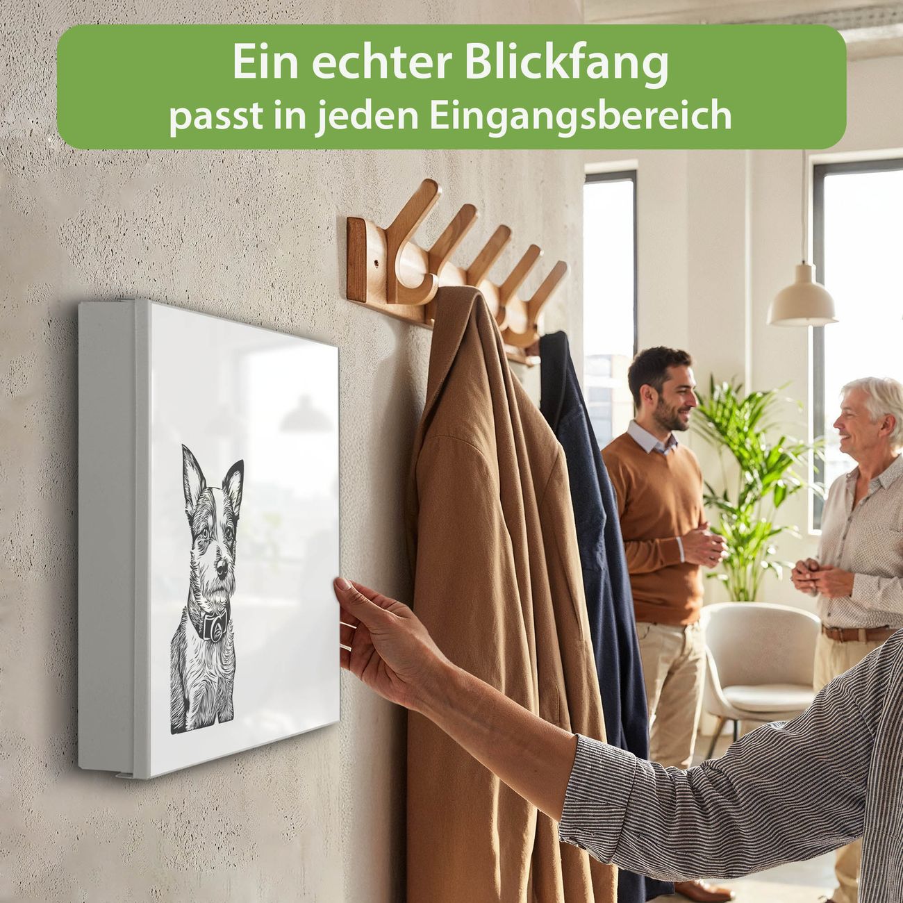 Bringe Ordnung und Eleganz in deinen Eingangsbereich mit dem banjado Schlüsselkasten Motiv Motiv Hundeskizze 2. Die moderne Schlüsselbox kombiniert funktionales Design mit hochwertiger Verarbeitung und wird so zu einem echten Hingucker in Flur, Büro oder Ferienwohnung. ✅ Stilvolle Schlüsselaufbewahrung mit Motiv Motiv Hundeskizze 2 Der Design-Schlüsselkasten Motiv Motiv Hundeskizze 2 bietet Platz für bis zu 32 Schlüssel, die auf 4 stabilen Reihen mit je 8 Haken übersichtlich verstaut werden. Mit seinen kompakten Maßen von 30 x 30 x 5 cm passt die Schlüsselbox perfekt auch in kleinere Räume. Der weiß lackierte Stahlkorpus mit links angeschlagenem Türscharnier harmoniert mit gedruckten Folie auf der Front und fügt sich nahtlos in jedes Wohnambiente ein. Ob als Schlüsselorganizer für Zuhause oder als praktische Lösung für Büros, Praxen und Gewerbe, der banjado Schlüsselkasten sorgt für Ordnung und Übersicht. Dank der magnetischen, mit Kreidestiften beschreibbaren Folie auf der Front kannst du Notizen anheften oder Termine direkt auf der Oberfläche festhalten. Die Schlüsselbox Motiv Motiv Hundeskizze 2 zur Wandmontage wird inklusive Befestigungsmaterial geliefert und ist schnell angebracht. So hast du deine Schlüssel jederzeit griffbereit und zugleich stilvoll verstaut. Mit diesem banjado Schlüsselkasten Motiv Motiv Hundeskizze 2 kombinierst du praktische Aufbewahrung mit stilvollem Wohndesign. Ob privat oder geschäftlich, die Schlüsselbox sorgt für mehr Ordnung, Übersicht und ein wohnliches Ambiente.Vorteile im Überblick