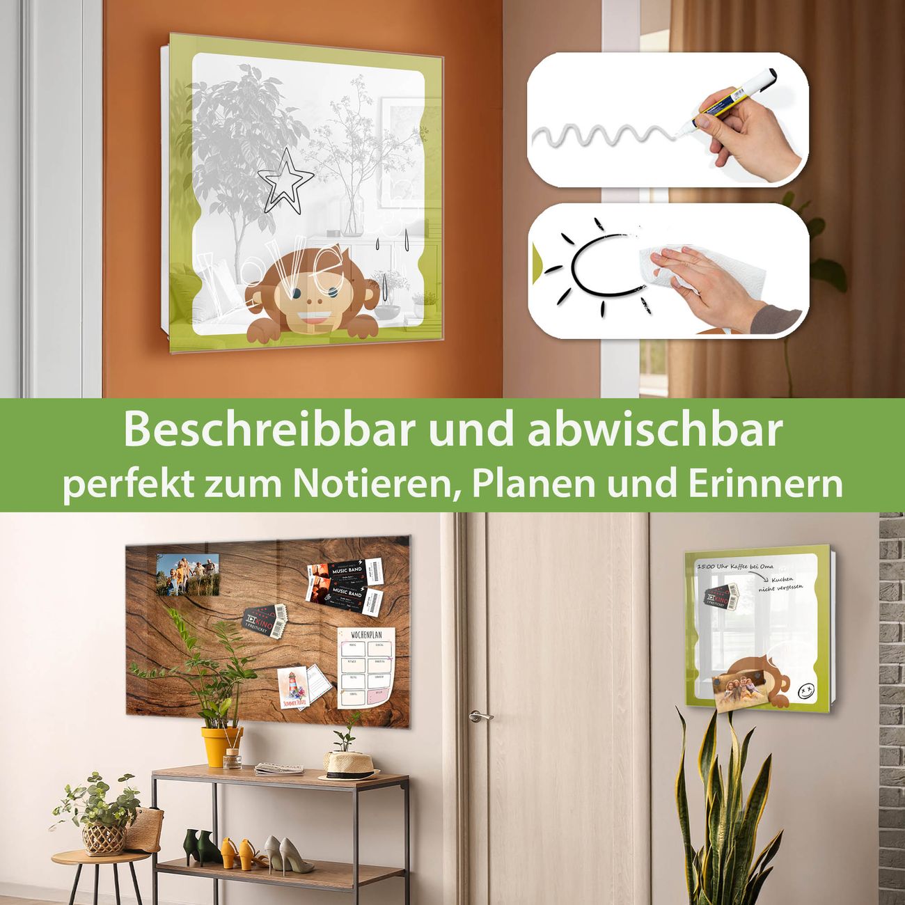 Bringe Ordnung und Eleganz in deinen Eingangsbereich mit dem banjado Schlüsselkasten Motiv Motiv Fröhlicher Affe. Die moderne Schlüsselbox kombiniert funktionales Design mit hochwertiger Verarbeitung und wird so zu einem echten Hingucker in Flur, Büro oder Ferienwohnung. ✅ Stilvolle Schlüsselaufbewahrung mit Glasfront im Motiv Motiv Fröhlicher Affe Der Design-Schlüsselkasten Motiv Motiv Fröhlicher Affe bietet Platz für bis zu 50 Schlüssel, die auf 5 stabilen Reihen mit je 10 Haken übersichtlich verstaut werden. Mit seinen kompakten Maßen von 30 x 30 x 5 cm passt die Schlüsselbox perfekt auch in kleinere Räume. Der weiß lackierte Stahlkorpus mit rechts angeschlagenem Türscharnier harmoniert mit der Glasfront und fügt sich nahtlos in jedes Wohnambiente ein. Ob als Schlüsselorganizer für Zuhause oder als praktische Lösung für Büros, Praxen und Gewerbe, der banjado Schlüsselkasten sorgt für Ordnung und Übersicht. Dank der magnetischen, mit Kreidestiften beschreibbaren Glasfront kannst du Notizen anheften oder Termine direkt auf der Oberfläche festhalten. Die Schlüsselbox Motiv Motiv Fröhlicher Affe zur Wandmontage wird inklusive Befestigungsmaterial geliefert und ist schnell angebracht. So hast du deine Schlüssel jederzeit griffbereit und zugleich stilvoll verstaut. Mit diesem banjado Schlüsselkasten Motiv Motiv Fröhlicher Affe kombinierst du praktische Aufbewahrung mit stilvollem Wohndesign. Ob privat oder geschäftlich, die Schlüsselbox sorgt für mehr Ordnung, Übersicht und ein wohnliches Ambiente.Vorteile im Überblick