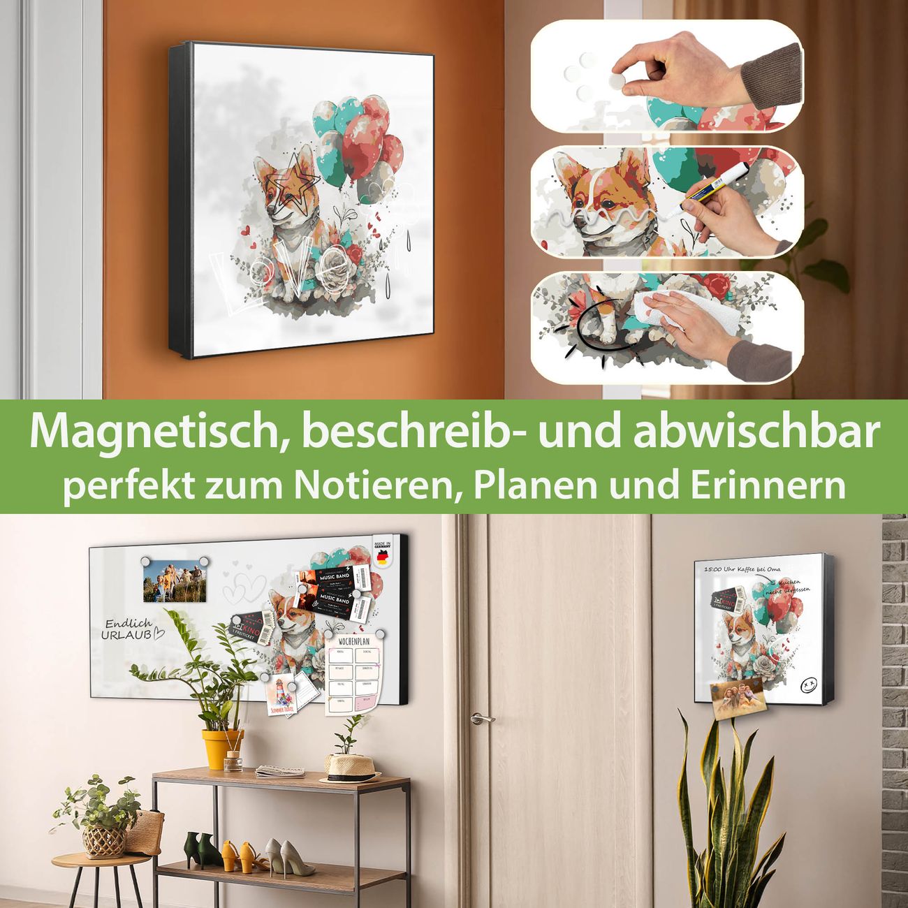Bringe Ordnung und Eleganz in deinen Eingangsbereich mit dem banjado Schlüsselkasten Motiv Motiv Corgi mit Ballons Aquarell. Die moderne Schlüsselbox kombiniert funktionales Design mit hochwertiger Verarbeitung und wird so zu einem echten Hingucker in Flur, Büro oder Ferienwohnung. ✅ Stilvolle Schlüsselaufbewahrung mit Motiv Motiv Corgi mit Ballons Aquarell Der Design-Schlüsselkasten Motiv Motiv Corgi mit Ballons Aquarell bietet Platz für bis zu 32 Schlüssel, die auf 4 stabilen Reihen mit je 8 Haken übersichtlich verstaut werden. Mit seinen kompakten Maßen von 30 x 30 x 5 cm passt die Schlüsselbox perfekt auch in kleinere Räume. Der schwarz lackierte Stahlkorpus mit rechts angeschlagenem Türscharnier harmoniert mit gedruckten Folie auf der Front und fügt sich nahtlos in jedes Wohnambiente ein. Ob als Schlüsselorganizer für Zuhause oder als praktische Lösung für Büros, Praxen und Gewerbe, der banjado Schlüsselkasten sorgt für Ordnung und Übersicht. Dank der magnetischen, mit Kreidestiften beschreibbaren Folie auf der Front kannst du Notizen anheften oder Termine direkt auf der Oberfläche festhalten. Die Schlüsselbox Motiv Motiv Corgi mit Ballons Aquarell zur Wandmontage wird inklusive Befestigungsmaterial geliefert und ist schnell angebracht. So hast du deine Schlüssel jederzeit griffbereit und zugleich stilvoll verstaut. Mit diesem banjado Schlüsselkasten Motiv Motiv Corgi mit Ballons Aquarell kombinierst du praktische Aufbewahrung mit stilvollem Wohndesign. Ob privat oder geschäftlich, die Schlüsselbox sorgt für mehr Ordnung, Übersicht und ein wohnliches Ambiente.Vorteile im Überblick