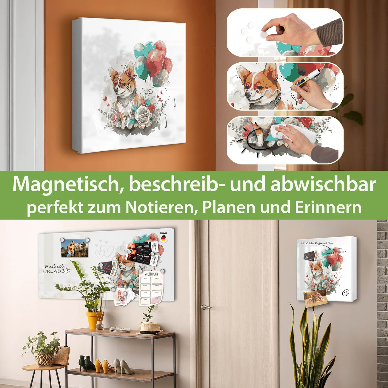 Bringe Ordnung und Eleganz in deinen Eingangsbereich mit dem banjado Schlüsselkasten Motiv Motiv Corgi mit Ballons Aquarell. Die moderne Schlüsselbox kombiniert funktionales Design mit hochwertiger Verarbeitung und wird so zu einem echten Hingucker in Flur, Büro oder Ferienwohnung. ✅ Stilvolle Schlüsselaufbewahrung mit Motiv Motiv Corgi mit Ballons Aquarell Der Design-Schlüsselkasten Motiv Motiv Corgi mit Ballons Aquarell bietet Platz für bis zu 32 Schlüssel, die auf 4 stabilen Reihen mit je 8 Haken übersichtlich verstaut werden. Mit seinen kompakten Maßen von 30 x 30 x 5 cm passt die Schlüsselbox perfekt auch in kleinere Räume. Der weiß lackierte Stahlkorpus mit rechts angeschlagenem Türscharnier harmoniert mit gedruckten Folie auf der Front und fügt sich nahtlos in jedes Wohnambiente ein. Ob als Schlüsselorganizer für Zuhause oder als praktische Lösung für Büros, Praxen und Gewerbe, der banjado Schlüsselkasten sorgt für Ordnung und Übersicht. Dank der magnetischen, mit Kreidestiften beschreibbaren Folie auf der Front kannst du Notizen anheften oder Termine direkt auf der Oberfläche festhalten. Die Schlüsselbox Motiv Motiv Corgi mit Ballons Aquarell zur Wandmontage wird inklusive Befestigungsmaterial geliefert und ist schnell angebracht. So hast du deine Schlüssel jederzeit griffbereit und zugleich stilvoll verstaut. Mit diesem banjado Schlüsselkasten Motiv Motiv Corgi mit Ballons Aquarell kombinierst du praktische Aufbewahrung mit stilvollem Wohndesign. Ob privat oder geschäftlich, die Schlüsselbox sorgt für mehr Ordnung, Übersicht und ein wohnliches Ambiente.Vorteile im Überblick