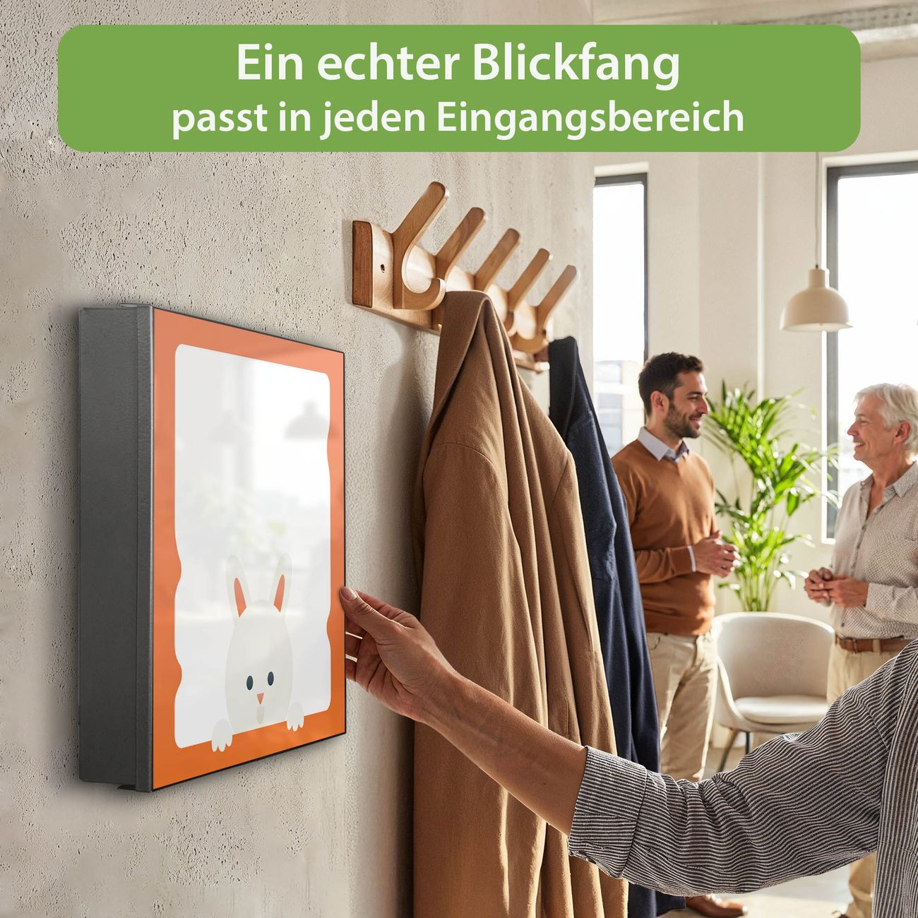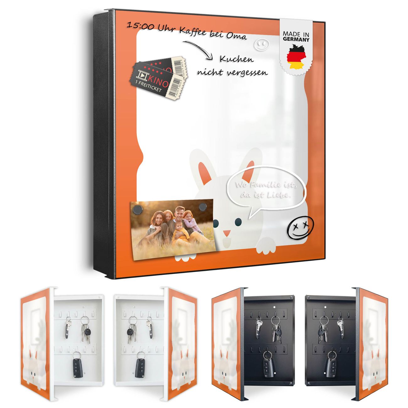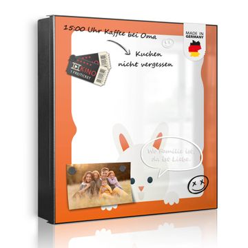 Bringe Ordnung und Eleganz in deinen Eingangsbereich mit dem banjado Schlüsselkasten Motiv Motiv Fröhlicher Hase. Die moderne Schlüsselbox kombiniert funktionales Design mit hochwertiger Verarbeitung und wird so zu einem echten Hingucker in Flur, Büro oder Ferienwohnung. ✅ Stilvolle Schlüsselaufbewahrung mit Motiv Motiv Fröhlicher Hase Der Design-Schlüsselkasten Motiv Motiv Fröhlicher Hase bietet Platz für bis zu 32 Schlüssel, die auf 4 stabilen Reihen mit je 8 Haken übersichtlich verstaut werden. Mit seinen kompakten Maßen von 30 x 30 x 5 cm passt die Schlüsselbox perfekt auch in kleinere Räume. Der schwarz lackierte Stahlkorpus mit links angeschlagenem Türscharnier harmoniert mit gedruckten Folie auf der Front und fügt sich nahtlos in jedes Wohnambiente ein. Ob als Schlüsselorganizer für Zuhause oder als praktische Lösung für Büros, Praxen und Gewerbe, der banjado Schlüsselkasten sorgt für Ordnung und Übersicht. Dank der magnetischen, mit Kreidestiften beschreibbaren Folie auf der Front kannst du Notizen anheften oder Termine direkt auf der Oberfläche festhalten. Die Schlüsselbox Motiv Motiv Fröhlicher Hase zur Wandmontage wird inklusive Befestigungsmaterial geliefert und ist schnell angebracht. So hast du deine Schlüssel jederzeit griffbereit und zugleich stilvoll verstaut. Mit diesem banjado Schlüsselkasten Motiv Motiv Fröhlicher Hase kombinierst du praktische Aufbewahrung mit stilvollem Wohndesign. Ob privat oder geschäftlich, die Schlüsselbox sorgt für mehr Ordnung, Übersicht und ein wohnliches Ambiente.Vorteile im Überblick