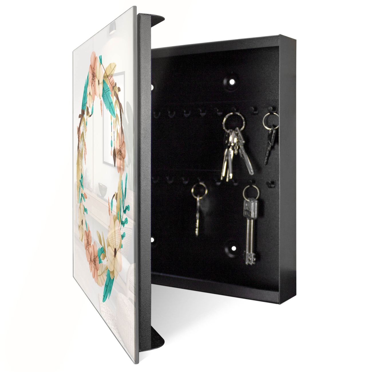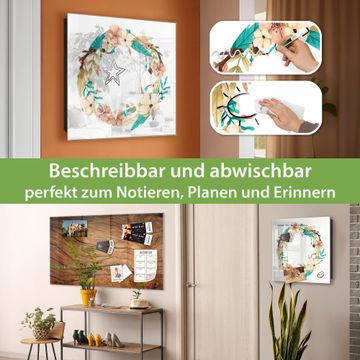 Bringe Ordnung und Eleganz in deinen Eingangsbereich mit dem banjado Schlüsselkasten Motiv Motiv Frühlingsblütenkranz. Die moderne Schlüsselbox kombiniert funktionales Design mit hochwertiger Verarbeitung und wird so zu einem echten Hingucker in Flur, Büro oder Ferienwohnung. ✅ Stilvolle Schlüsselaufbewahrung mit Glasfront im Motiv Motiv Frühlingsblütenkranz Der Design-Schlüsselkasten Motiv Motiv Frühlingsblütenkranz bietet Platz für bis zu 50 Schlüssel, die auf 5 stabilen Reihen mit je 10 Haken übersichtlich verstaut werden. Mit seinen kompakten Maßen von 30 x 30 x 5 cm passt die Schlüsselbox perfekt auch in kleinere Räume. Der schwarz lackierte Stahlkorpus mit rechts angeschlagenem Türscharnier harmoniert mit der Glasfront und fügt sich nahtlos in jedes Wohnambiente ein. Ob als Schlüsselorganizer für Zuhause oder als praktische Lösung für Büros, Praxen und Gewerbe, der banjado Schlüsselkasten sorgt für Ordnung und Übersicht. Dank der magnetischen, mit Kreidestiften beschreibbaren Glasfront kannst du Notizen anheften oder Termine direkt auf der Oberfläche festhalten. Die Schlüsselbox Motiv Motiv Frühlingsblütenkranz zur Wandmontage wird inklusive Befestigungsmaterial geliefert und ist schnell angebracht. So hast du deine Schlüssel jederzeit griffbereit und zugleich stilvoll verstaut. Mit diesem banjado Schlüsselkasten Motiv Motiv Frühlingsblütenkranz kombinierst du praktische Aufbewahrung mit stilvollem Wohndesign. Ob privat oder geschäftlich, die Schlüsselbox sorgt für mehr Ordnung, Übersicht und ein wohnliches Ambiente.Vorteile im Überblick