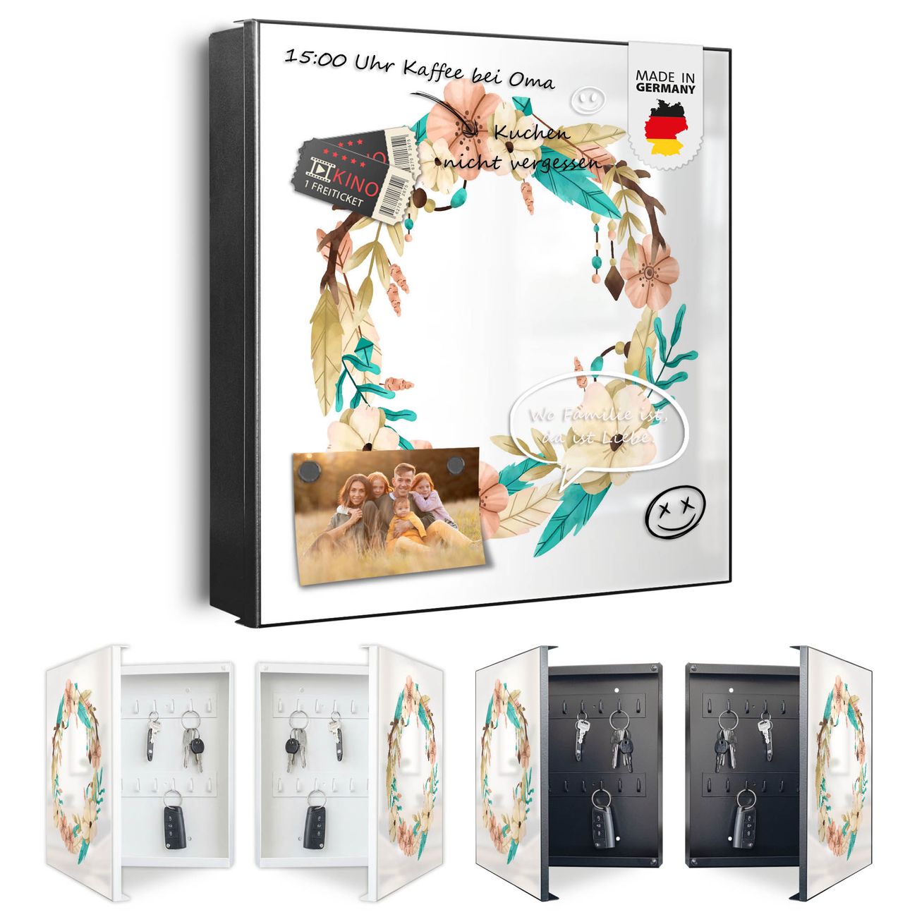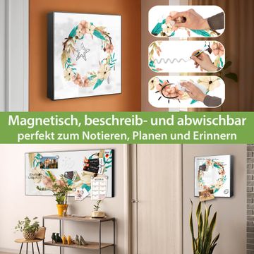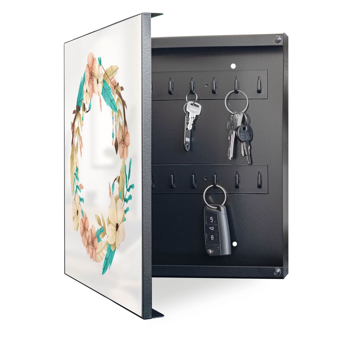 Bringe Ordnung und Eleganz in deinen Eingangsbereich mit dem banjado Schlüsselkasten Motiv Motiv Frühlingsblütenkranz. Die moderne Schlüsselbox kombiniert funktionales Design mit hochwertiger Verarbeitung und wird so zu einem echten Hingucker in Flur, Büro oder Ferienwohnung. ✅ Stilvolle Schlüsselaufbewahrung mit Motiv Motiv Frühlingsblütenkranz Der Design-Schlüsselkasten Motiv Motiv Frühlingsblütenkranz bietet Platz für bis zu 32 Schlüssel, die auf 4 stabilen Reihen mit je 8 Haken übersichtlich verstaut werden. Mit seinen kompakten Maßen von 30 x 30 x 5 cm passt die Schlüsselbox perfekt auch in kleinere Räume. Der schwarz lackierte Stahlkorpus mit links angeschlagenem Türscharnier harmoniert mit gedruckten Folie auf der Front und fügt sich nahtlos in jedes Wohnambiente ein. Ob als Schlüsselorganizer für Zuhause oder als praktische Lösung für Büros, Praxen und Gewerbe, der banjado Schlüsselkasten sorgt für Ordnung und Übersicht. Dank der magnetischen, mit Kreidestiften beschreibbaren Folie auf der Front kannst du Notizen anheften oder Termine direkt auf der Oberfläche festhalten. Die Schlüsselbox Motiv Motiv Frühlingsblütenkranz zur Wandmontage wird inklusive Befestigungsmaterial geliefert und ist schnell angebracht. So hast du deine Schlüssel jederzeit griffbereit und zugleich stilvoll verstaut. Mit diesem banjado Schlüsselkasten Motiv Motiv Frühlingsblütenkranz kombinierst du praktische Aufbewahrung mit stilvollem Wohndesign. Ob privat oder geschäftlich, die Schlüsselbox sorgt für mehr Ordnung, Übersicht und ein wohnliches Ambiente.Vorteile im Überblick