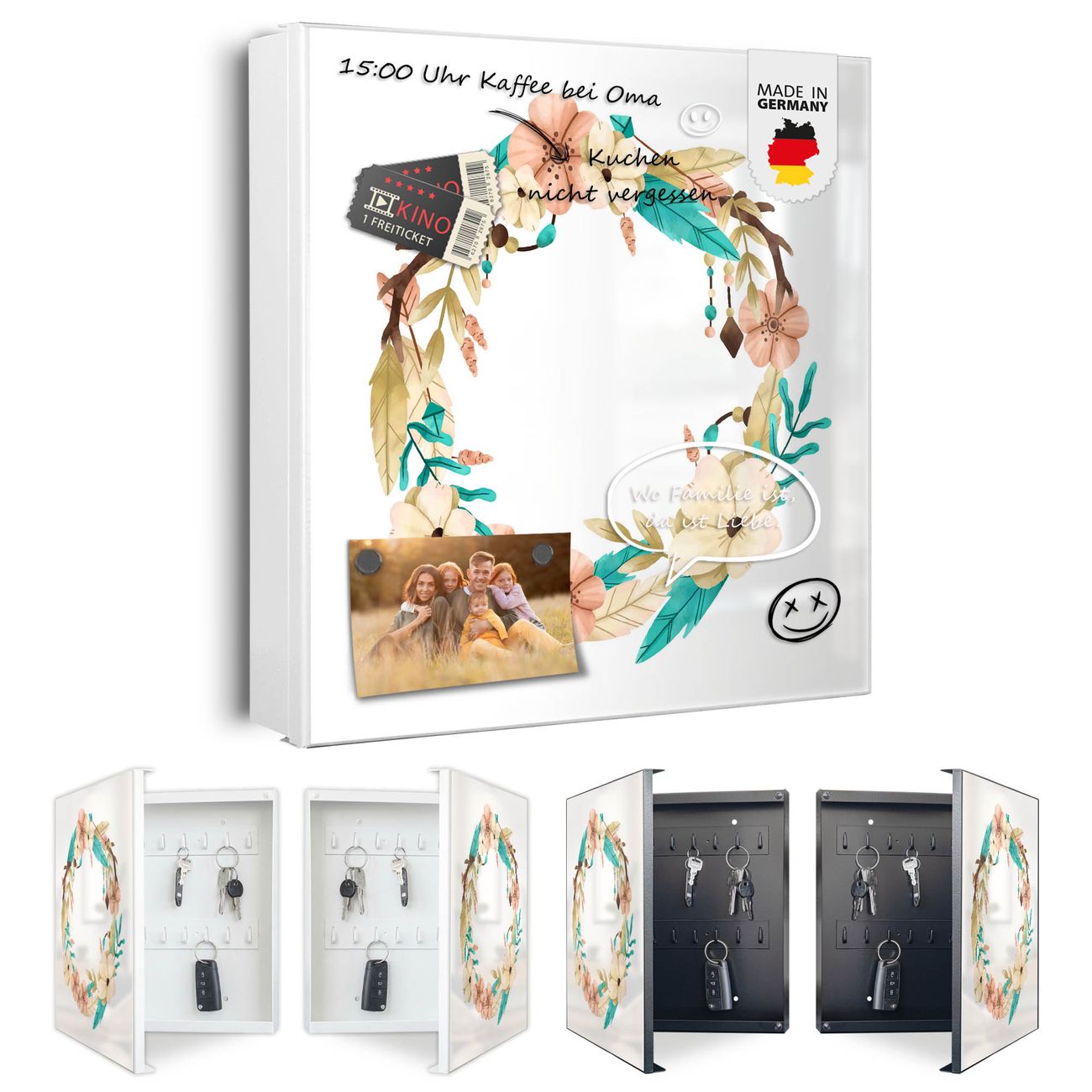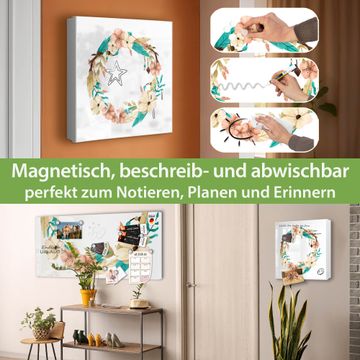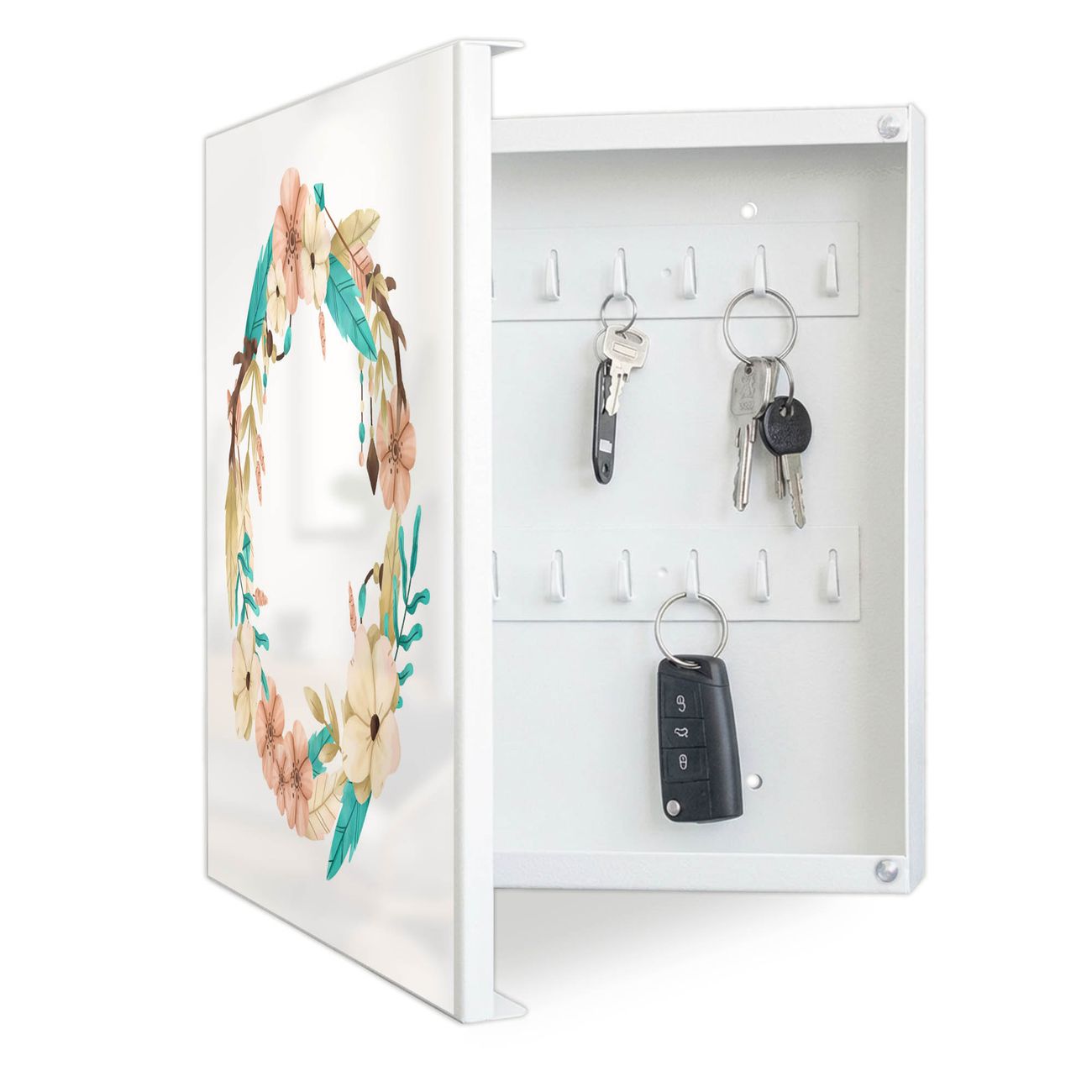 Bringe Ordnung und Eleganz in deinen Eingangsbereich mit dem banjado Schlüsselkasten Motiv Motiv Frühlingsblütenkranz. Die moderne Schlüsselbox kombiniert funktionales Design mit hochwertiger Verarbeitung und wird so zu einem echten Hingucker in Flur, Büro oder Ferienwohnung. ✅ Stilvolle Schlüsselaufbewahrung mit Motiv Motiv Frühlingsblütenkranz Der Design-Schlüsselkasten Motiv Motiv Frühlingsblütenkranz bietet Platz für bis zu 32 Schlüssel, die auf 4 stabilen Reihen mit je 8 Haken übersichtlich verstaut werden. Mit seinen kompakten Maßen von 30 x 30 x 5 cm passt die Schlüsselbox perfekt auch in kleinere Räume. Der weiß lackierte Stahlkorpus mit links angeschlagenem Türscharnier harmoniert mit gedruckten Folie auf der Front und fügt sich nahtlos in jedes Wohnambiente ein. Ob als Schlüsselorganizer für Zuhause oder als praktische Lösung für Büros, Praxen und Gewerbe, der banjado Schlüsselkasten sorgt für Ordnung und Übersicht. Dank der magnetischen, mit Kreidestiften beschreibbaren Folie auf der Front kannst du Notizen anheften oder Termine direkt auf der Oberfläche festhalten. Die Schlüsselbox Motiv Motiv Frühlingsblütenkranz zur Wandmontage wird inklusive Befestigungsmaterial geliefert und ist schnell angebracht. So hast du deine Schlüssel jederzeit griffbereit und zugleich stilvoll verstaut. Mit diesem banjado Schlüsselkasten Motiv Motiv Frühlingsblütenkranz kombinierst du praktische Aufbewahrung mit stilvollem Wohndesign. Ob privat oder geschäftlich, die Schlüsselbox sorgt für mehr Ordnung, Übersicht und ein wohnliches Ambiente.Vorteile im Überblick