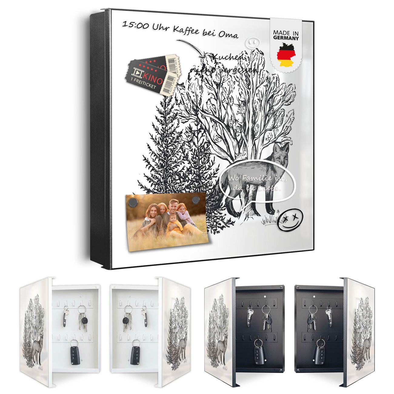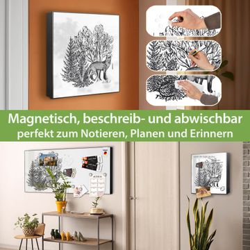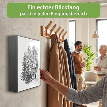 Bringe Ordnung und Eleganz in deinen Eingangsbereich mit dem banjado Schlüsselkasten Motiv Motiv Fuchs in Schwarz-Weiß. Die moderne Schlüsselbox kombiniert funktionales Design mit hochwertiger Verarbeitung und wird so zu einem echten Hingucker in Flur, Büro oder Ferienwohnung. ✅ Stilvolle Schlüsselaufbewahrung mit Motiv Motiv Fuchs in Schwarz-Weiß Der Design-Schlüsselkasten Motiv Motiv Fuchs in Schwarz-Weiß bietet Platz für bis zu 32 Schlüssel, die auf 4 stabilen Reihen mit je 8 Haken übersichtlich verstaut werden. Mit seinen kompakten Maßen von 30 x 30 x 5 cm passt die Schlüsselbox perfekt auch in kleinere Räume. Der schwarz lackierte Stahlkorpus mit links angeschlagenem Türscharnier harmoniert mit gedruckten Folie auf der Front und fügt sich nahtlos in jedes Wohnambiente ein. Ob als Schlüsselorganizer für Zuhause oder als praktische Lösung für Büros, Praxen und Gewerbe, der banjado Schlüsselkasten sorgt für Ordnung und Übersicht. Dank der magnetischen, mit Kreidestiften beschreibbaren Folie auf der Front kannst du Notizen anheften oder Termine direkt auf der Oberfläche festhalten. Die Schlüsselbox Motiv Motiv Fuchs in Schwarz-Weiß zur Wandmontage wird inklusive Befestigungsmaterial geliefert und ist schnell angebracht. So hast du deine Schlüssel jederzeit griffbereit und zugleich stilvoll verstaut. Mit diesem banjado Schlüsselkasten Motiv Motiv Fuchs in Schwarz-Weiß kombinierst du praktische Aufbewahrung mit stilvollem Wohndesign. Ob privat oder geschäftlich, die Schlüsselbox sorgt für mehr Ordnung, Übersicht und ein wohnliches Ambiente.Vorteile im Überblick