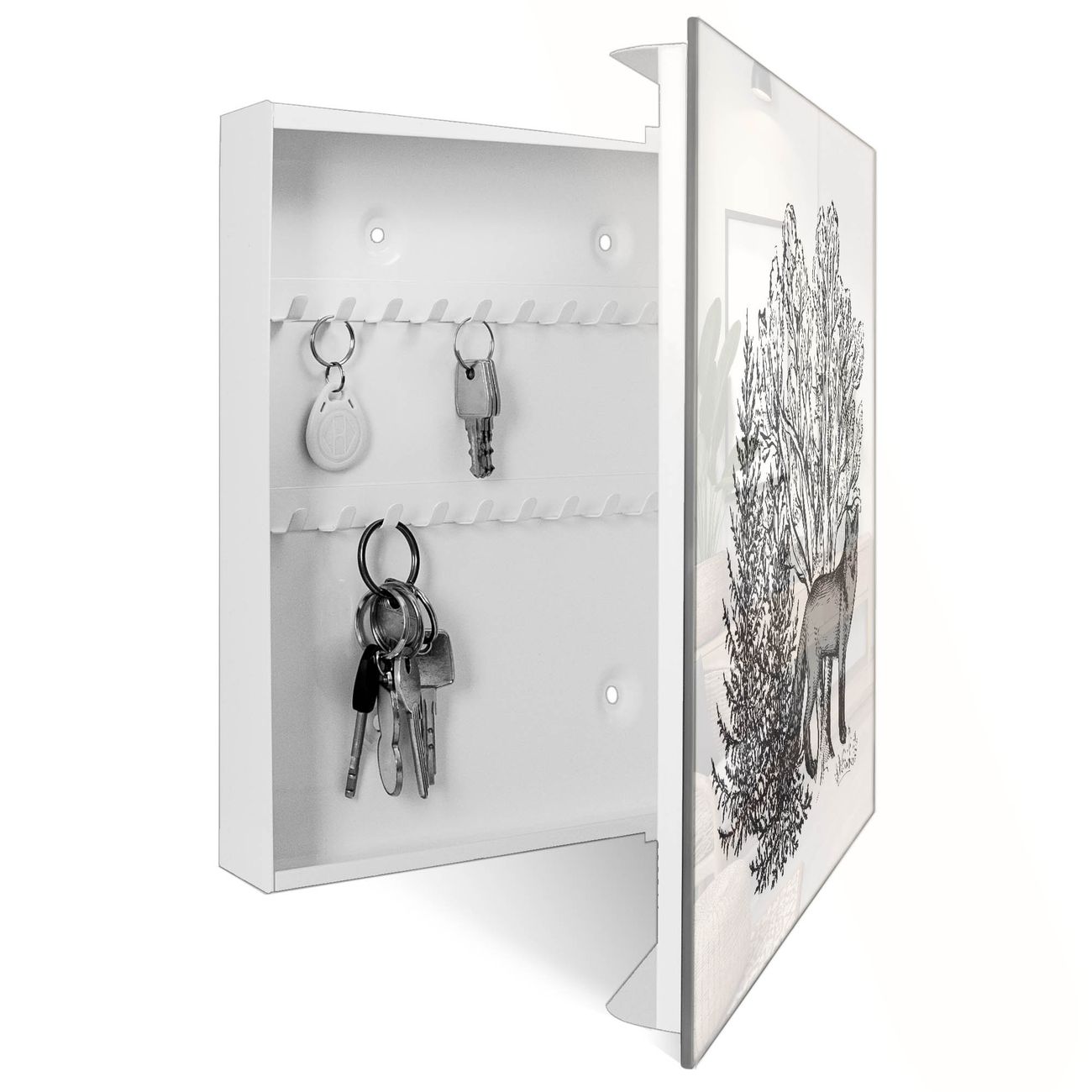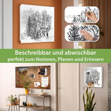 Bringe Ordnung und Eleganz in deinen Eingangsbereich mit dem banjado Schlüsselkasten Motiv Motiv Fuchs im Wald. Die moderne Schlüsselbox kombiniert funktionales Design mit hochwertiger Verarbeitung und wird so zu einem echten Hingucker in Flur, Büro oder Ferienwohnung. ✅ Stilvolle Schlüsselaufbewahrung mit Glasfront im Motiv Motiv Fuchs im Wald Der Design-Schlüsselkasten Motiv Motiv Fuchs im Wald bietet Platz für bis zu 50 Schlüssel, die auf 5 stabilen Reihen mit je 10 Haken übersichtlich verstaut werden. Mit seinen kompakten Maßen von 30 x 30 x 5 cm passt die Schlüsselbox perfekt auch in kleinere Räume. Der weiß lackierte Stahlkorpus mit rechts angeschlagenem Türscharnier harmoniert mit der Glasfront und fügt sich nahtlos in jedes Wohnambiente ein. Ob als Schlüsselorganizer für Zuhause oder als praktische Lösung für Büros, Praxen und Gewerbe, der banjado Schlüsselkasten sorgt für Ordnung und Übersicht. Dank der magnetischen, mit Kreidestiften beschreibbaren Glasfront kannst du Notizen anheften oder Termine direkt auf der Oberfläche festhalten. Die Schlüsselbox Motiv Motiv Fuchs im Wald zur Wandmontage wird inklusive Befestigungsmaterial geliefert und ist schnell angebracht. So hast du deine Schlüssel jederzeit griffbereit und zugleich stilvoll verstaut. Mit diesem banjado Schlüsselkasten Motiv Motiv Fuchs im Wald kombinierst du praktische Aufbewahrung mit stilvollem Wohndesign. Ob privat oder geschäftlich, die Schlüsselbox sorgt für mehr Ordnung, Übersicht und ein wohnliches Ambiente.Vorteile im Überblick
