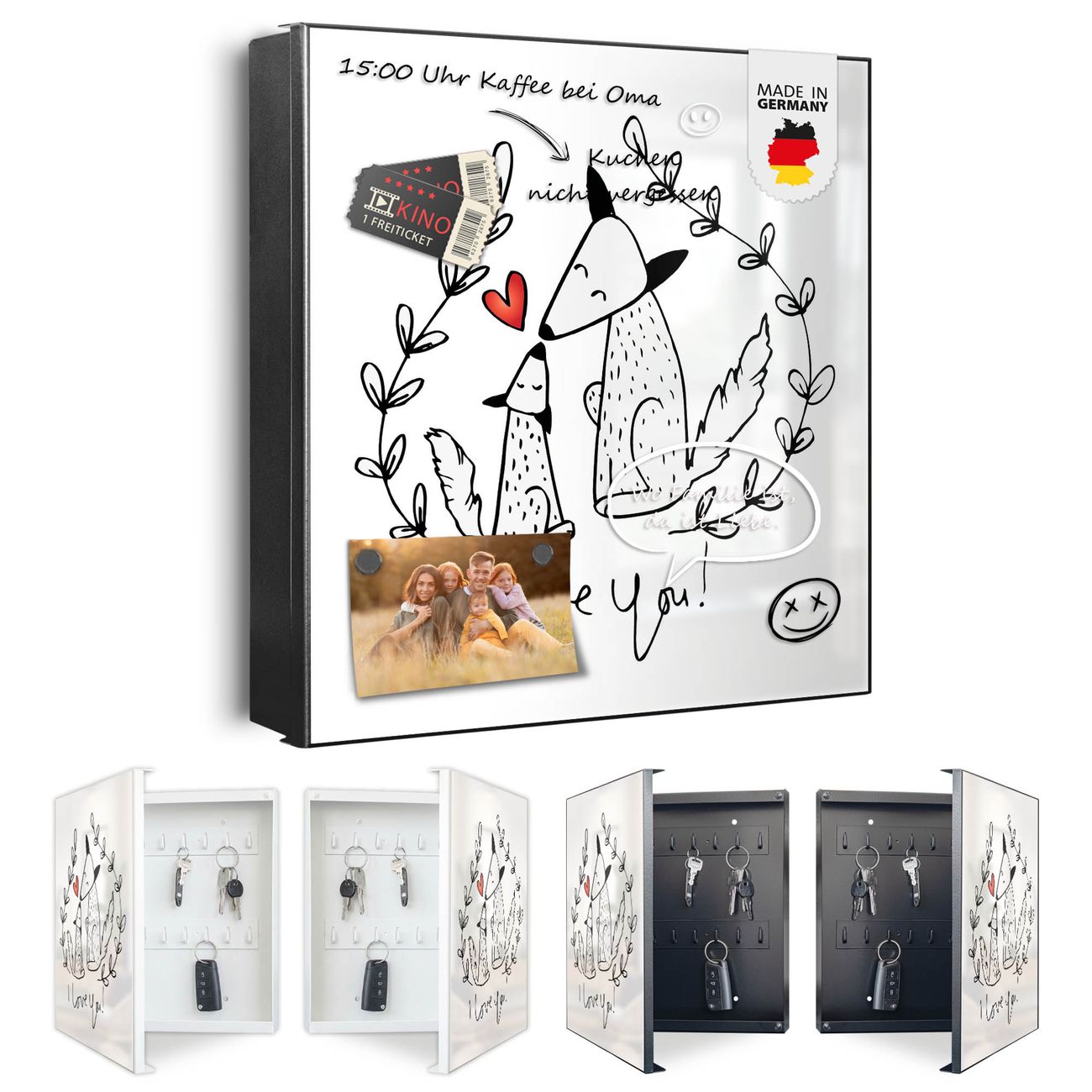 Bringe Ordnung und Eleganz in deinen Eingangsbereich mit dem banjado Schlüsselkasten Motiv Motiv Fuchsliebe. Die moderne Schlüsselbox kombiniert funktionales Design mit hochwertiger Verarbeitung und wird so zu einem echten Hingucker in Flur, Büro oder Ferienwohnung. ✅ Stilvolle Schlüsselaufbewahrung mit Motiv Motiv Fuchsliebe Der Design-Schlüsselkasten Motiv Motiv Fuchsliebe bietet Platz für bis zu 32 Schlüssel, die auf 4 stabilen Reihen mit je 8 Haken übersichtlich verstaut werden. Mit seinen kompakten Maßen von 30 x 30 x 5 cm passt die Schlüsselbox perfekt auch in kleinere Räume. Der schwarz lackierte Stahlkorpus mit links angeschlagenem Türscharnier harmoniert mit gedruckten Folie auf der Front und fügt sich nahtlos in jedes Wohnambiente ein. Ob als Schlüsselorganizer für Zuhause oder als praktische Lösung für Büros, Praxen und Gewerbe, der banjado Schlüsselkasten sorgt für Ordnung und Übersicht. Dank der magnetischen, mit Kreidestiften beschreibbaren Folie auf der Front kannst du Notizen anheften oder Termine direkt auf der Oberfläche festhalten. Die Schlüsselbox Motiv Motiv Fuchsliebe zur Wandmontage wird inklusive Befestigungsmaterial geliefert und ist schnell angebracht. So hast du deine Schlüssel jederzeit griffbereit und zugleich stilvoll verstaut. Mit diesem banjado Schlüsselkasten Motiv Motiv Fuchsliebe kombinierst du praktische Aufbewahrung mit stilvollem Wohndesign. Ob privat oder geschäftlich, die Schlüsselbox sorgt für mehr Ordnung, Übersicht und ein wohnliches Ambiente.Vorteile im Überblick