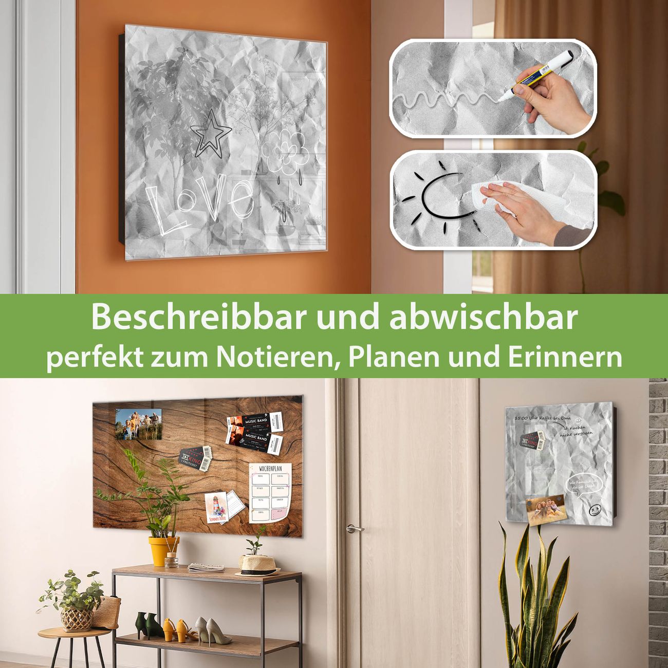 Bringe Ordnung und Eleganz in deinen Eingangsbereich mit dem banjado Schlüsselkasten Motiv Geknittertes Papier Grau. Die moderne Schlüsselbox kombiniert funktionales Design mit hochwertiger Verarbeitung und wird so zu einem echten Hingucker in Flur, Büro oder Ferienwohnung. ✅ Stilvolle Schlüsselaufbewahrung mit Glasfront im Motiv Motiv Geknittertes Papier Grau Der Design-Schlüsselkasten Motiv Geknittertes Papier Grau bietet Platz für bis zu 50 Schlüssel, die auf 5 stabilen Reihen mit je 10 Haken übersichtlich verstaut werden. Mit seinen kompakten Maßen von 30 x 30 x 5 cm passt die Schlüsselbox perfekt auch in kleinere Räume. Der schwarz lackierte Stahlkorpus mit rechts angeschlagenem Türscharnier harmoniert mit der Glasfront und fügt sich nahtlos in jedes Wohnambiente ein. Ob als Schlüsselorganizer für Zuhause oder als praktische Lösung für Büros, Praxen und Gewerbe, der banjado Schlüsselkasten sorgt für Ordnung und Übersicht. Dank der magnetischen, mit Kreidestiften beschreibbaren Glasfront kannst du Notizen anheften oder Termine direkt auf der Oberfläche festhalten. Die Schlüsselbox Motiv Geknittertes Papier Grau zur Wandmontage wird inklusive Befestigungsmaterial geliefert und ist schnell angebracht. So hast du deine Schlüssel jederzeit griffbereit und zugleich stilvoll verstaut. Mit diesem banjado Schlüsselkasten Motiv Geknittertes Papier Grau kombinierst du praktische Aufbewahrung mit stilvollem Wohndesign. Ob privat oder geschäftlich, die Schlüsselbox sorgt für mehr Ordnung, Übersicht und ein wohnliches Ambiente.Vorteile im Überblick