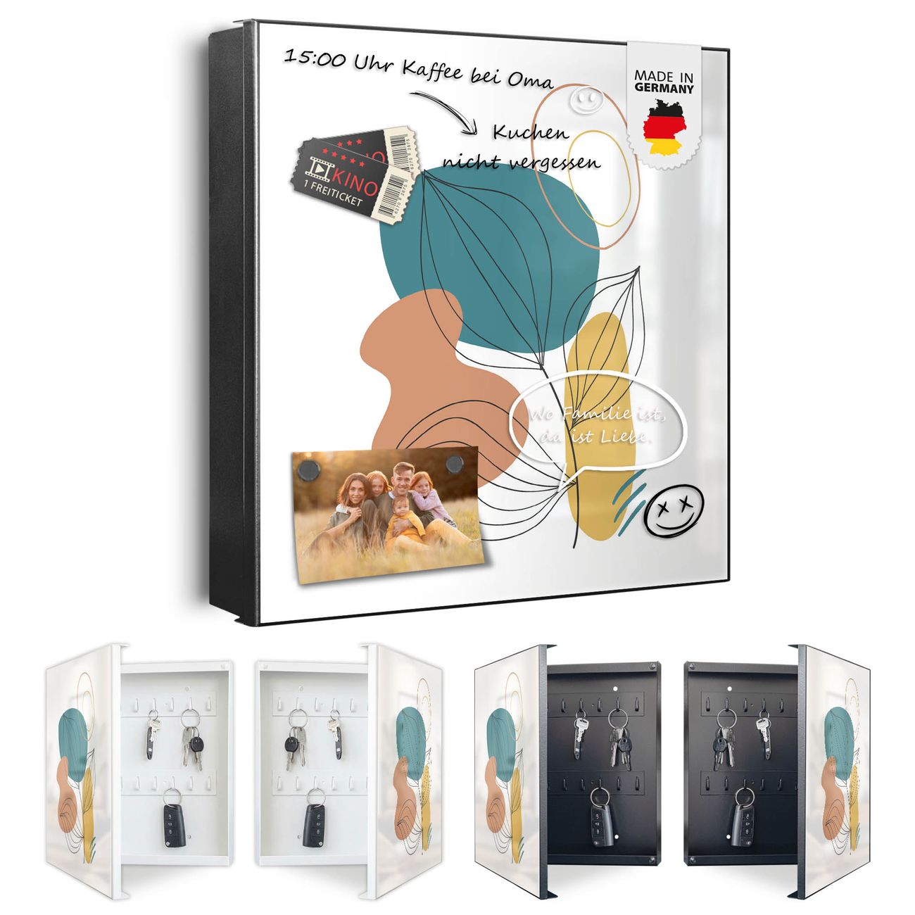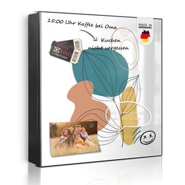 Bringe Ordnung und Eleganz in deinen Eingangsbereich mit dem banjado Schlüsselkasten Motiv Motiv Geometrische Blätter Lineart. Die moderne Schlüsselbox kombiniert funktionales Design mit hochwertiger Verarbeitung und wird so zu einem echten Hingucker in Flur, Büro oder Ferienwohnung. ✅ Stilvolle Schlüsselaufbewahrung mit Motiv Motiv Geometrische Blätter Lineart Der Design-Schlüsselkasten Motiv Motiv Geometrische Blätter Lineart bietet Platz für bis zu 32 Schlüssel, die auf 4 stabilen Reihen mit je 8 Haken übersichtlich verstaut werden. Mit seinen kompakten Maßen von 30 x 30 x 5 cm passt die Schlüsselbox perfekt auch in kleinere Räume. Der schwarz lackierte Stahlkorpus mit links angeschlagenem Türscharnier harmoniert mit gedruckten Folie auf der Front und fügt sich nahtlos in jedes Wohnambiente ein. Ob als Schlüsselorganizer für Zuhause oder als praktische Lösung für Büros, Praxen und Gewerbe, der banjado Schlüsselkasten sorgt für Ordnung und Übersicht. Dank der magnetischen, mit Kreidestiften beschreibbaren Folie auf der Front kannst du Notizen anheften oder Termine direkt auf der Oberfläche festhalten. Die Schlüsselbox Motiv Motiv Geometrische Blätter Lineart zur Wandmontage wird inklusive Befestigungsmaterial geliefert und ist schnell angebracht. So hast du deine Schlüssel jederzeit griffbereit und zugleich stilvoll verstaut. Mit diesem banjado Schlüsselkasten Motiv Motiv Geometrische Blätter Lineart kombinierst du praktische Aufbewahrung mit stilvollem Wohndesign. Ob privat oder geschäftlich, die Schlüsselbox sorgt für mehr Ordnung, Übersicht und ein wohnliches Ambiente.Vorteile im Überblick