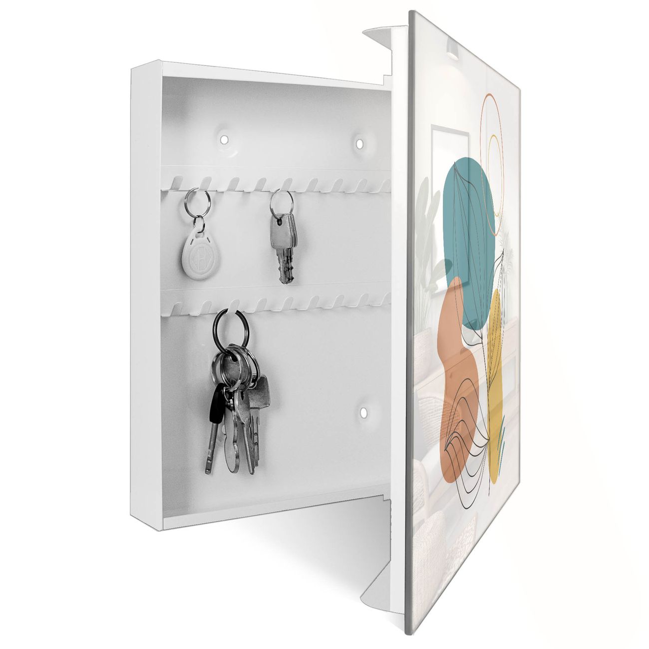 Bringe Ordnung und Eleganz in deinen Eingangsbereich mit dem banjado Schlüsselkasten Motiv Motiv Geometrische Blätter. Die moderne Schlüsselbox kombiniert funktionales Design mit hochwertiger Verarbeitung und wird so zu einem echten Hingucker in Flur, Büro oder Ferienwohnung. ✅ Stilvolle Schlüsselaufbewahrung mit Glasfront im Motiv Motiv Geometrische Blätter Der Design-Schlüsselkasten Motiv Motiv Geometrische Blätter bietet Platz für bis zu 50 Schlüssel, die auf 5 stabilen Reihen mit je 10 Haken übersichtlich verstaut werden. Mit seinen kompakten Maßen von 30 x 30 x 5 cm passt die Schlüsselbox perfekt auch in kleinere Räume. Der weiß lackierte Stahlkorpus mit rechts angeschlagenem Türscharnier harmoniert mit der Glasfront und fügt sich nahtlos in jedes Wohnambiente ein. Ob als Schlüsselorganizer für Zuhause oder als praktische Lösung für Büros, Praxen und Gewerbe, der banjado Schlüsselkasten sorgt für Ordnung und Übersicht. Dank der magnetischen, mit Kreidestiften beschreibbaren Glasfront kannst du Notizen anheften oder Termine direkt auf der Oberfläche festhalten. Die Schlüsselbox Motiv Motiv Geometrische Blätter zur Wandmontage wird inklusive Befestigungsmaterial geliefert und ist schnell angebracht. So hast du deine Schlüssel jederzeit griffbereit und zugleich stilvoll verstaut. Mit diesem banjado Schlüsselkasten Motiv Motiv Geometrische Blätter kombinierst du praktische Aufbewahrung mit stilvollem Wohndesign. Ob privat oder geschäftlich, die Schlüsselbox sorgt für mehr Ordnung, Übersicht und ein wohnliches Ambiente.Vorteile im Überblick