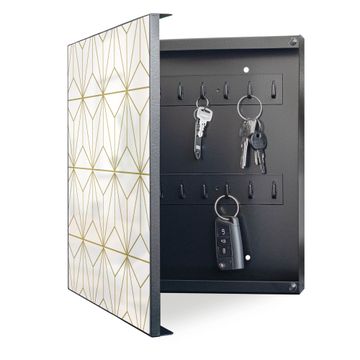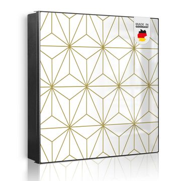 Bringe Ordnung und Eleganz in deinen Eingangsbereich mit dem banjado Schlüsselkasten Motiv Motiv Asanoha Muster. Die moderne Schlüsselbox kombiniert funktionales Design mit hochwertiger Verarbeitung und wird so zu einem echten Hingucker in Flur, Büro oder Ferienwohnung. ✅ Stilvolle Schlüsselaufbewahrung mit Motiv Motiv Asanoha Muster Der Design-Schlüsselkasten Motiv Motiv Asanoha Muster bietet Platz für bis zu 32 Schlüssel, die auf 4 stabilen Reihen mit je 8 Haken übersichtlich verstaut werden. Mit seinen kompakten Maßen von 30 x 30 x 5 cm passt die Schlüsselbox perfekt auch in kleinere Räume. Der schwarz lackierte Stahlkorpus mit links angeschlagenem Türscharnier harmoniert mit gedruckten Folie auf der Front und fügt sich nahtlos in jedes Wohnambiente ein. Ob als Schlüsselorganizer für Zuhause oder als praktische Lösung für Büros, Praxen und Gewerbe, der banjado Schlüsselkasten sorgt für Ordnung und Übersicht. Dank der magnetischen, mit Kreidestiften beschreibbaren Folie auf der Front kannst du Notizen anheften oder Termine direkt auf der Oberfläche festhalten. Die Schlüsselbox Motiv Motiv Asanoha Muster zur Wandmontage wird inklusive Befestigungsmaterial geliefert und ist schnell angebracht. So hast du deine Schlüssel jederzeit griffbereit und zugleich stilvoll verstaut. Mit diesem banjado Schlüsselkasten Motiv Motiv Asanoha Muster kombinierst du praktische Aufbewahrung mit stilvollem Wohndesign. Ob privat oder geschäftlich, die Schlüsselbox sorgt für mehr Ordnung, Übersicht und ein wohnliches Ambiente.Vorteile im Überblick