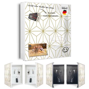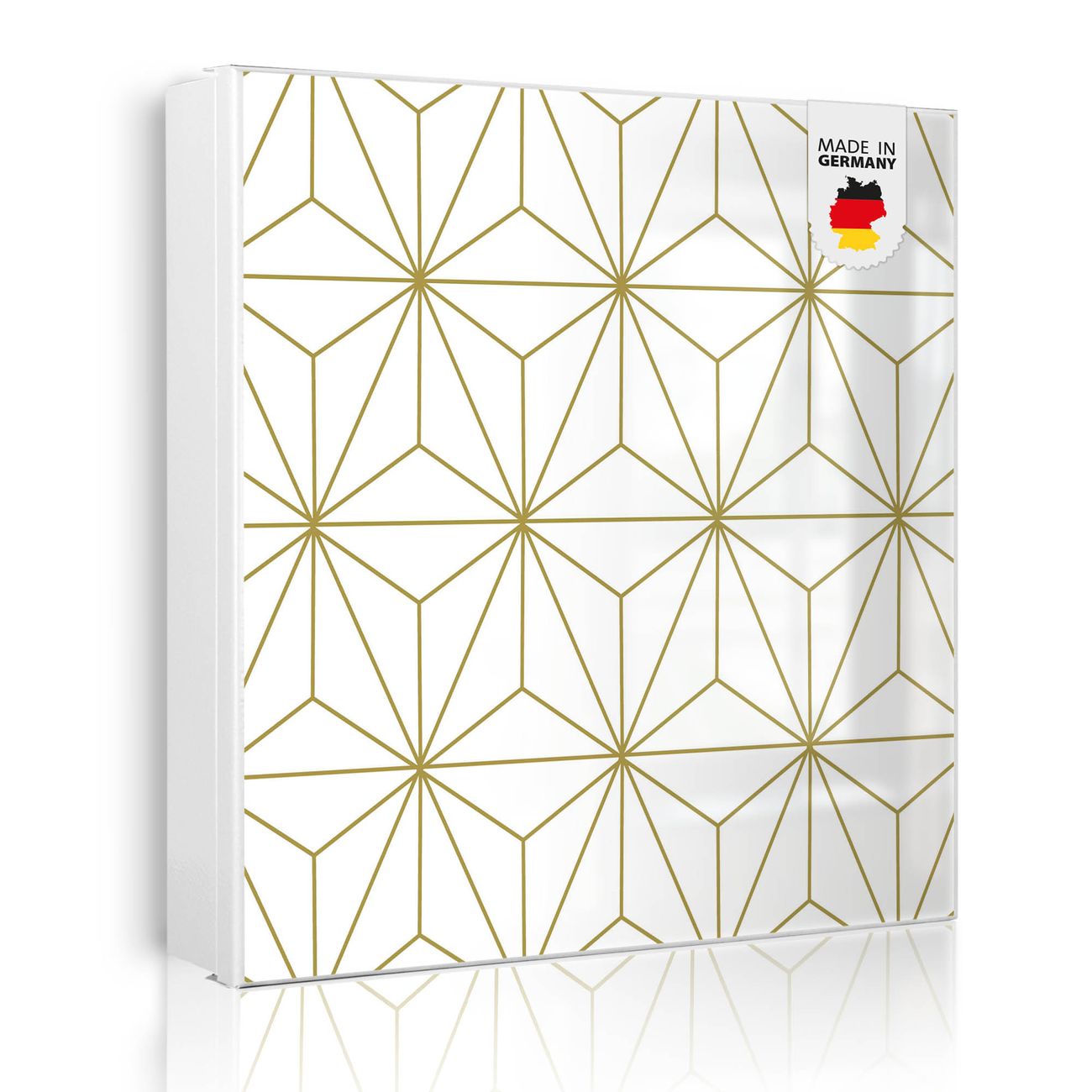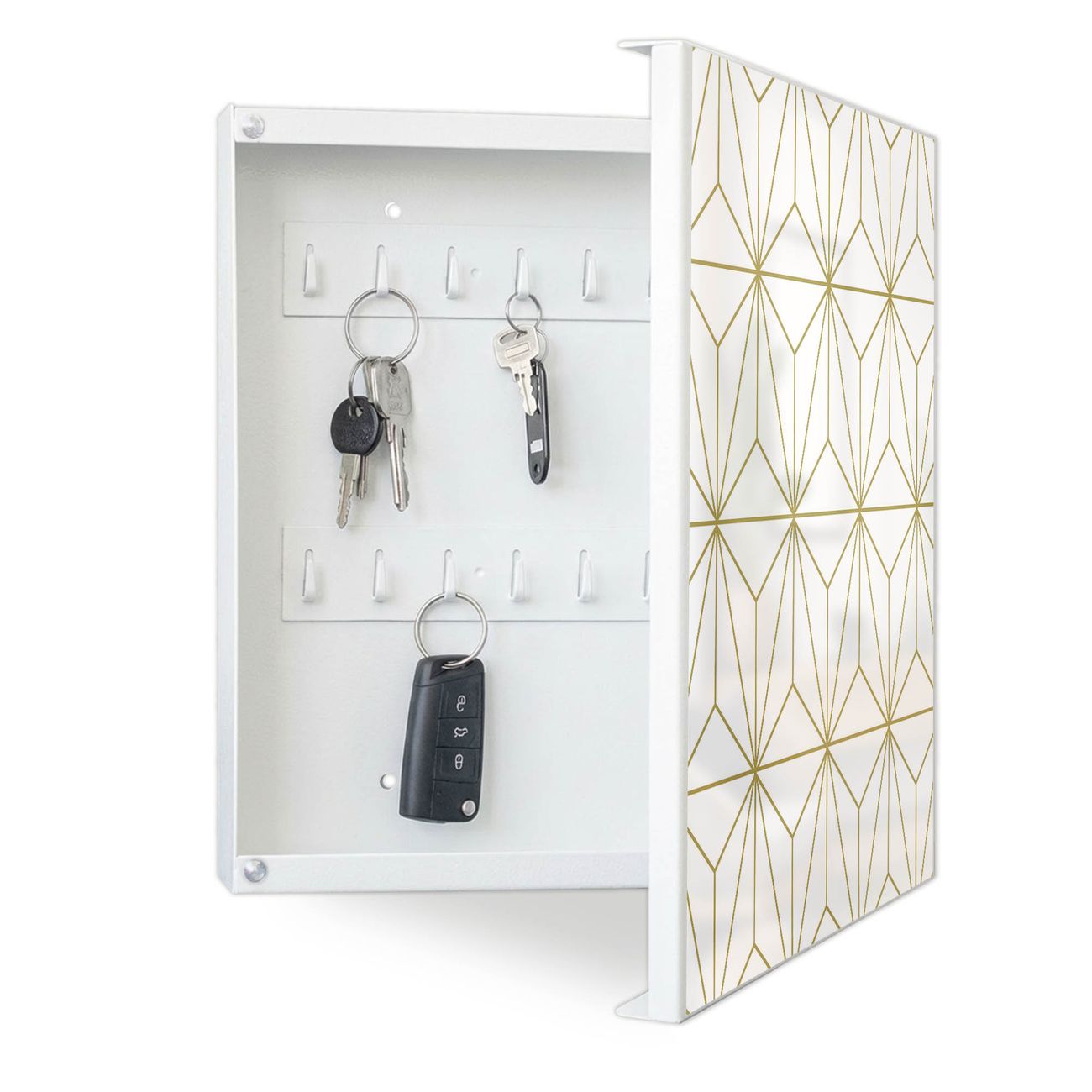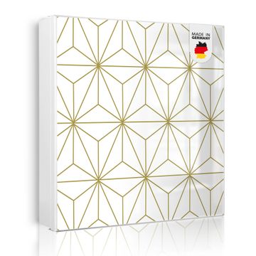 Bringe Ordnung und Eleganz in deinen Eingangsbereich mit dem banjado Schlüsselkasten Motiv Motiv Asanoha Muster. Die moderne Schlüsselbox kombiniert funktionales Design mit hochwertiger Verarbeitung und wird so zu einem echten Hingucker in Flur, Büro oder Ferienwohnung. ✅ Stilvolle Schlüsselaufbewahrung mit Motiv Motiv Asanoha Muster Der Design-Schlüsselkasten Motiv Motiv Asanoha Muster bietet Platz für bis zu 32 Schlüssel, die auf 4 stabilen Reihen mit je 8 Haken übersichtlich verstaut werden. Mit seinen kompakten Maßen von 30 x 30 x 5 cm passt die Schlüsselbox perfekt auch in kleinere Räume. Der weiß lackierte Stahlkorpus mit rechts angeschlagenem Türscharnier harmoniert mit gedruckten Folie auf der Front und fügt sich nahtlos in jedes Wohnambiente ein. Ob als Schlüsselorganizer für Zuhause oder als praktische Lösung für Büros, Praxen und Gewerbe, der banjado Schlüsselkasten sorgt für Ordnung und Übersicht. Dank der magnetischen, mit Kreidestiften beschreibbaren Folie auf der Front kannst du Notizen anheften oder Termine direkt auf der Oberfläche festhalten. Die Schlüsselbox Motiv Motiv Asanoha Muster zur Wandmontage wird inklusive Befestigungsmaterial geliefert und ist schnell angebracht. So hast du deine Schlüssel jederzeit griffbereit und zugleich stilvoll verstaut. Mit diesem banjado Schlüsselkasten Motiv Motiv Asanoha Muster kombinierst du praktische Aufbewahrung mit stilvollem Wohndesign. Ob privat oder geschäftlich, die Schlüsselbox sorgt für mehr Ordnung, Übersicht und ein wohnliches Ambiente.Vorteile im Überblick