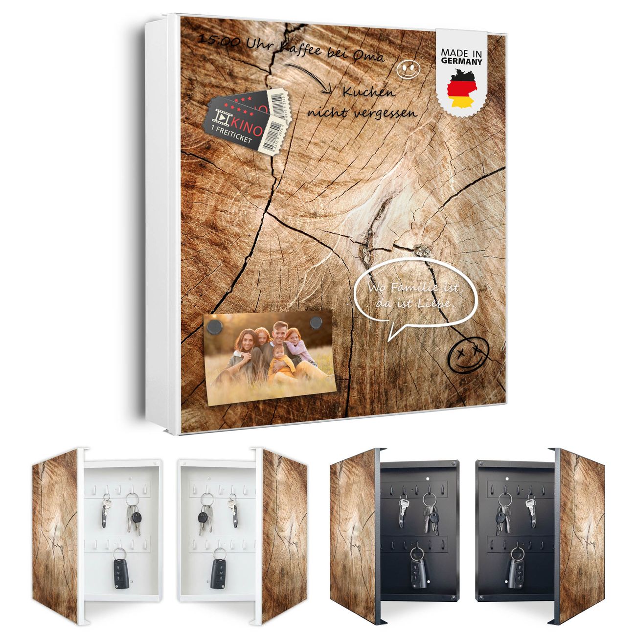 Bringe Ordnung und Eleganz in deinen Eingangsbereich mit dem banjado Schlüsselkasten Motiv Motiv Getrocknetes Holz. Die moderne Schlüsselbox kombiniert funktionales Design mit hochwertiger Verarbeitung und wird so zu einem echten Hingucker in Flur, Büro oder Ferienwohnung. ✅ Stilvolle Schlüsselaufbewahrung mit Motiv Motiv Getrocknetes Holz Der Design-Schlüsselkasten Motiv Motiv Getrocknetes Holz bietet Platz für bis zu 32 Schlüssel, die auf 4 stabilen Reihen mit je 8 Haken übersichtlich verstaut werden. Mit seinen kompakten Maßen von 30 x 30 x 5 cm passt die Schlüsselbox perfekt auch in kleinere Räume. Der weiß lackierte Stahlkorpus mit rechts angeschlagenem Türscharnier harmoniert mit gedruckten Folie auf der Front und fügt sich nahtlos in jedes Wohnambiente ein. Ob als Schlüsselorganizer für Zuhause oder als praktische Lösung für Büros, Praxen und Gewerbe, der banjado Schlüsselkasten sorgt für Ordnung und Übersicht. Dank der magnetischen, mit Kreidestiften beschreibbaren Folie auf der Front kannst du Notizen anheften oder Termine direkt auf der Oberfläche festhalten. Die Schlüsselbox Motiv Motiv Getrocknetes Holz zur Wandmontage wird inklusive Befestigungsmaterial geliefert und ist schnell angebracht. So hast du deine Schlüssel jederzeit griffbereit und zugleich stilvoll verstaut. Mit diesem banjado Schlüsselkasten Motiv Motiv Getrocknetes Holz kombinierst du praktische Aufbewahrung mit stilvollem Wohndesign. Ob privat oder geschäftlich, die Schlüsselbox sorgt für mehr Ordnung, Übersicht und ein wohnliches Ambiente.Vorteile im Überblick