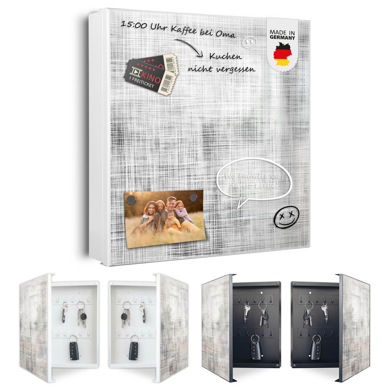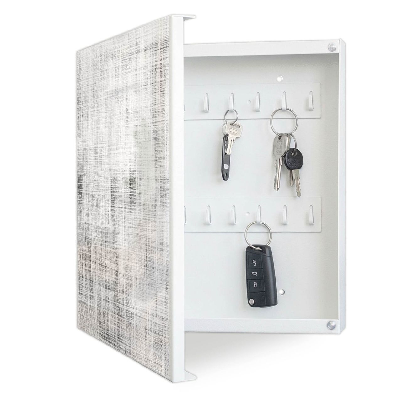 Bringe Ordnung und Eleganz in deinen Eingangsbereich mit dem banjado Schlüsselkasten Motiv Motiv Gewebtes Gitter Grau. Die moderne Schlüsselbox kombiniert funktionales Design mit hochwertiger Verarbeitung und wird so zu einem echten Hingucker in Flur, Büro oder Ferienwohnung. ✅ Stilvolle Schlüsselaufbewahrung mit Motiv Motiv Gewebtes Gitter Grau Der Design-Schlüsselkasten Motiv Motiv Gewebtes Gitter Grau bietet Platz für bis zu 32 Schlüssel, die auf 4 stabilen Reihen mit je 8 Haken übersichtlich verstaut werden. Mit seinen kompakten Maßen von 30 x 30 x 5 cm passt die Schlüsselbox perfekt auch in kleinere Räume. Der weiß lackierte Stahlkorpus mit links angeschlagenem Türscharnier harmoniert mit gedruckten Folie auf der Front und fügt sich nahtlos in jedes Wohnambiente ein. Ob als Schlüsselorganizer für Zuhause oder als praktische Lösung für Büros, Praxen und Gewerbe, der banjado Schlüsselkasten sorgt für Ordnung und Übersicht. Dank der magnetischen, mit Kreidestiften beschreibbaren Folie auf der Front kannst du Notizen anheften oder Termine direkt auf der Oberfläche festhalten. Die Schlüsselbox Motiv Motiv Gewebtes Gitter Grau zur Wandmontage wird inklusive Befestigungsmaterial geliefert und ist schnell angebracht. So hast du deine Schlüssel jederzeit griffbereit und zugleich stilvoll verstaut. Mit diesem banjado Schlüsselkasten Motiv Motiv Gewebtes Gitter Grau kombinierst du praktische Aufbewahrung mit stilvollem Wohndesign. Ob privat oder geschäftlich, die Schlüsselbox sorgt für mehr Ordnung, Übersicht und ein wohnliches Ambiente.Vorteile im Überblick