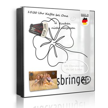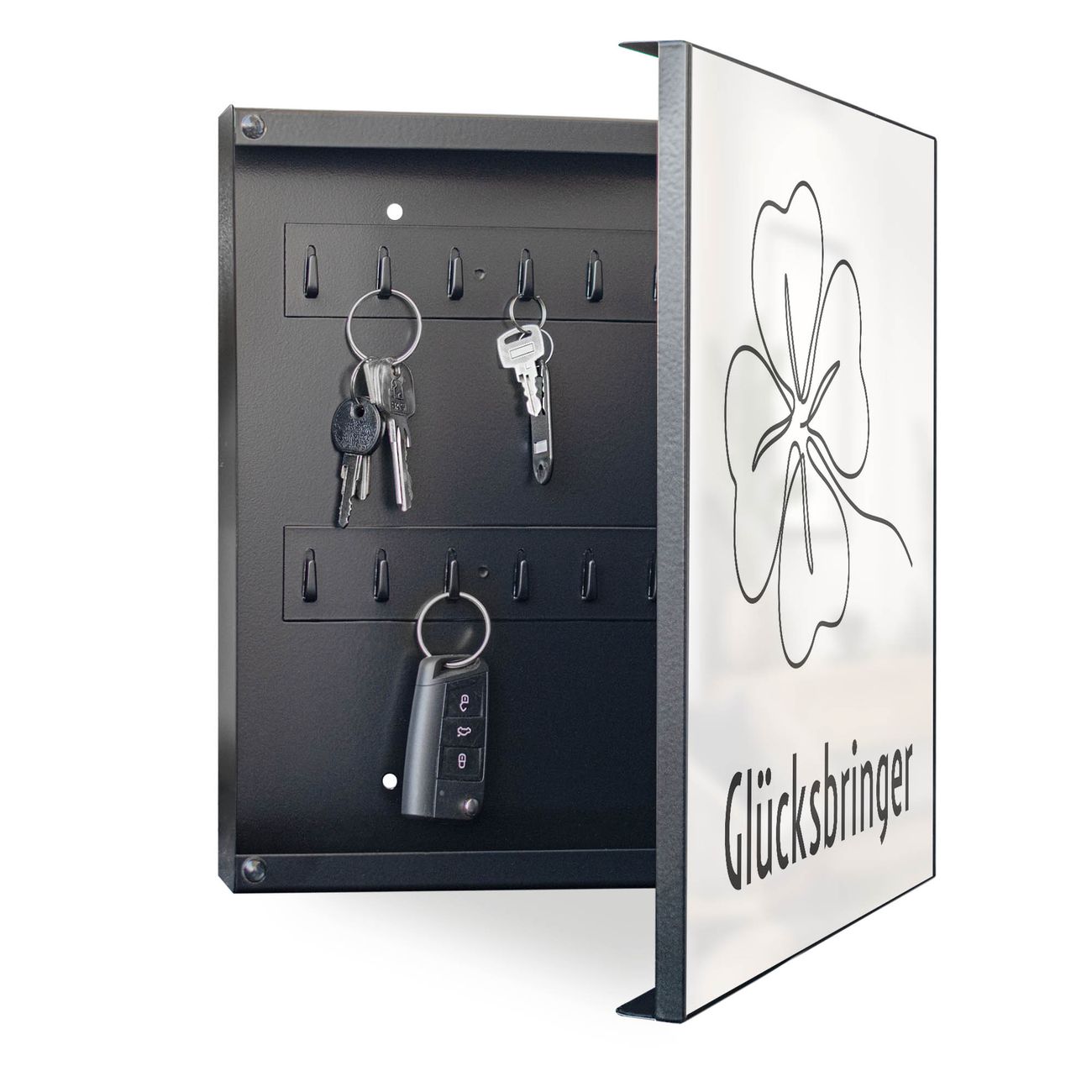 Bringe Ordnung und Eleganz in deinen Eingangsbereich mit dem banjado Schlüsselkasten Motiv Motiv Glücksbringer Kleeblatt 2. Die moderne Schlüsselbox kombiniert funktionales Design mit hochwertiger Verarbeitung und wird so zu einem echten Hingucker in Flur, Büro oder Ferienwohnung. ✅ Stilvolle Schlüsselaufbewahrung mit Motiv Motiv Glücksbringer Kleeblatt 2 Der Design-Schlüsselkasten Motiv Motiv Glücksbringer Kleeblatt 2 bietet Platz für bis zu 32 Schlüssel, die auf 4 stabilen Reihen mit je 8 Haken übersichtlich verstaut werden. Mit seinen kompakten Maßen von 30 x 30 x 5 cm passt die Schlüsselbox perfekt auch in kleinere Räume. Der schwarz lackierte Stahlkorpus mit rechts angeschlagenem Türscharnier harmoniert mit gedruckten Folie auf der Front und fügt sich nahtlos in jedes Wohnambiente ein. Ob als Schlüsselorganizer für Zuhause oder als praktische Lösung für Büros, Praxen und Gewerbe, der banjado Schlüsselkasten sorgt für Ordnung und Übersicht. Dank der magnetischen, mit Kreidestiften beschreibbaren Folie auf der Front kannst du Notizen anheften oder Termine direkt auf der Oberfläche festhalten. Die Schlüsselbox Motiv Motiv Glücksbringer Kleeblatt 2 zur Wandmontage wird inklusive Befestigungsmaterial geliefert und ist schnell angebracht. So hast du deine Schlüssel jederzeit griffbereit und zugleich stilvoll verstaut. Mit diesem banjado Schlüsselkasten Motiv Motiv Glücksbringer Kleeblatt 2 kombinierst du praktische Aufbewahrung mit stilvollem Wohndesign. Ob privat oder geschäftlich, die Schlüsselbox sorgt für mehr Ordnung, Übersicht und ein wohnliches Ambiente.Vorteile im Überblick