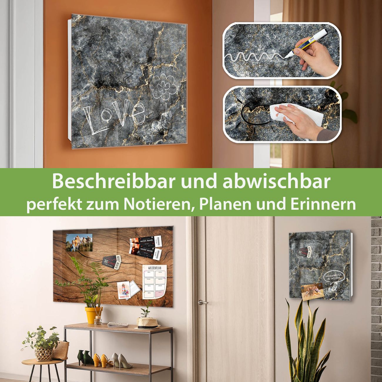 Bringe Ordnung und Eleganz in deinen Eingangsbereich mit dem banjado Schlüsselkasten Motiv grauer Marmor mit Gold 2. Die moderne Schlüsselbox kombiniert funktionales Design mit hochwertiger Verarbeitung und wird so zu einem echten Hingucker in Flur, Büro oder Ferienwohnung. ✅ Stilvolle Schlüsselaufbewahrung mit Glasfront im Motiv Motiv grauer Marmor mit Gold 2 Der Design-Schlüsselkasten Motiv grauer Marmor mit Gold 2 bietet Platz für bis zu 50 Schlüssel, die auf 5 stabilen Reihen mit je 10 Haken übersichtlich verstaut werden. Mit seinen kompakten Maßen von 30 x 30 x 5 cm passt die Schlüsselbox perfekt auch in kleinere Räume. Der weiß lackierte Stahlkorpus mit rechts angeschlagenem Türscharnier harmoniert mit der Glasfront und fügt sich nahtlos in jedes Wohnambiente ein. Ob als Schlüsselorganizer für Zuhause oder als praktische Lösung für Büros, Praxen und Gewerbe, der banjado Schlüsselkasten sorgt für Ordnung und Übersicht. Dank der magnetischen, mit Kreidestiften beschreibbaren Glasfront kannst du Notizen anheften oder Termine direkt auf der Oberfläche festhalten. Die Schlüsselbox Motiv grauer Marmor mit Gold 2 zur Wandmontage wird inklusive Befestigungsmaterial geliefert und ist schnell angebracht. So hast du deine Schlüssel jederzeit griffbereit und zugleich stilvoll verstaut. Mit diesem banjado Schlüsselkasten Motiv grauer Marmor mit Gold 2 kombinierst du praktische Aufbewahrung mit stilvollem Wohndesign. Ob privat oder geschäftlich, die Schlüsselbox sorgt für mehr Ordnung, Übersicht und ein wohnliches Ambiente.Vorteile im Überblick