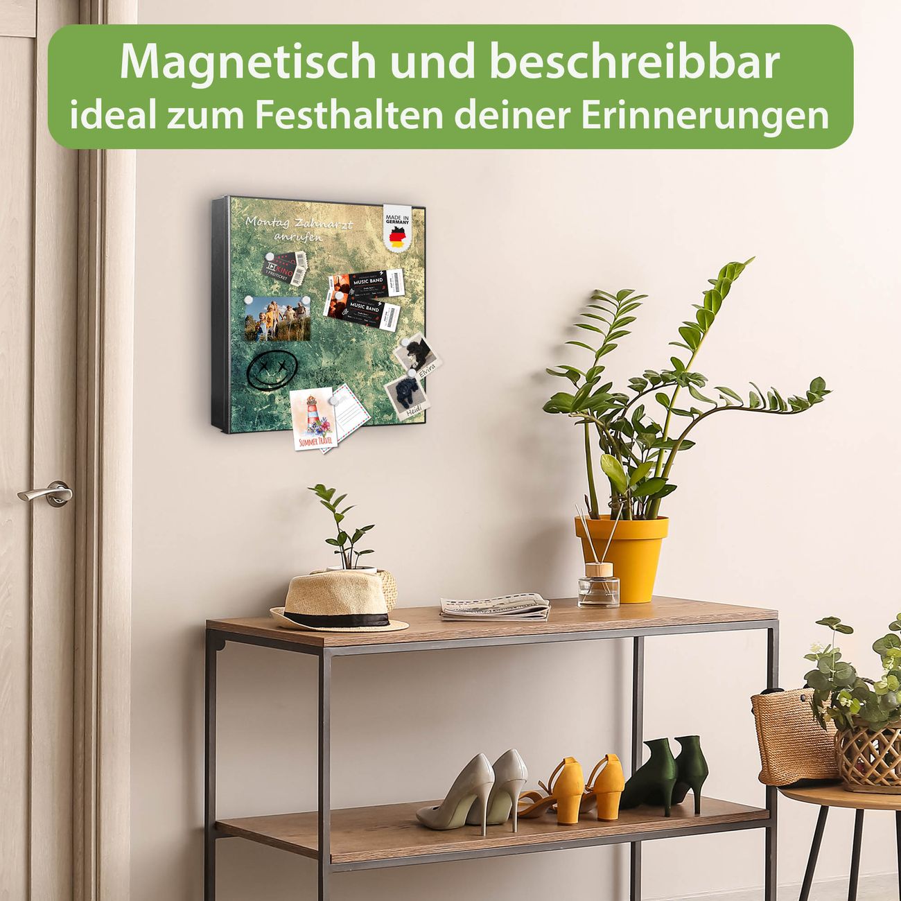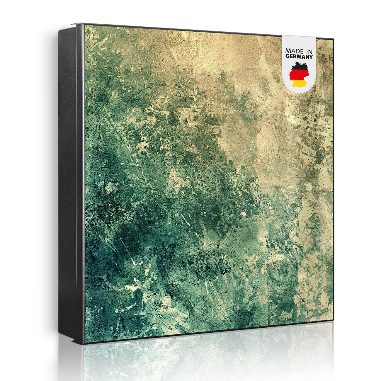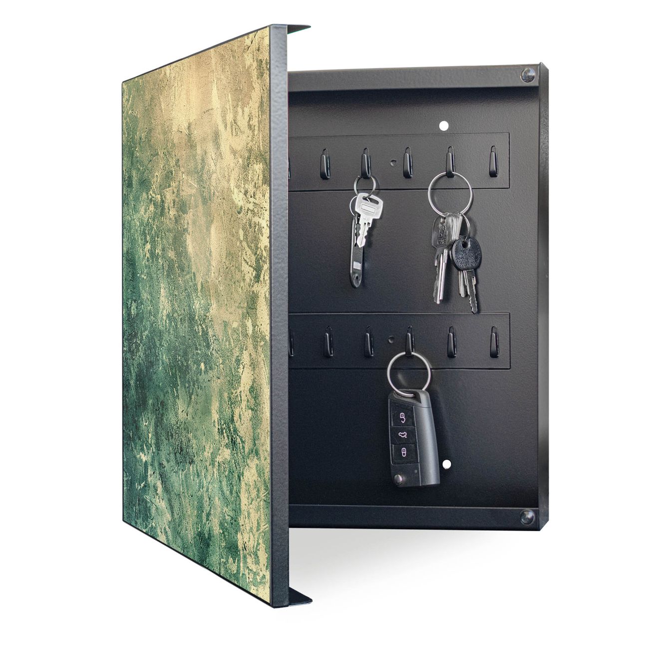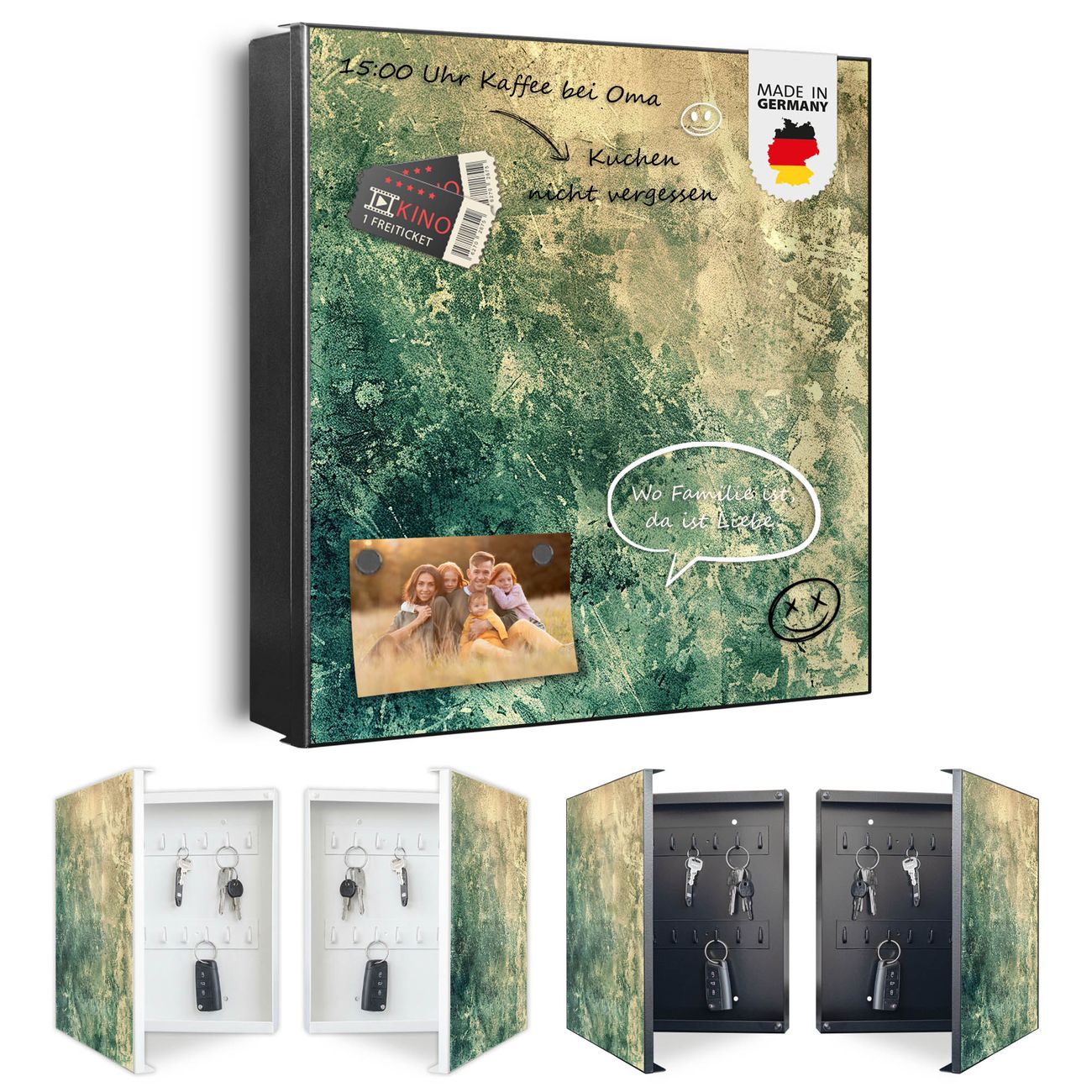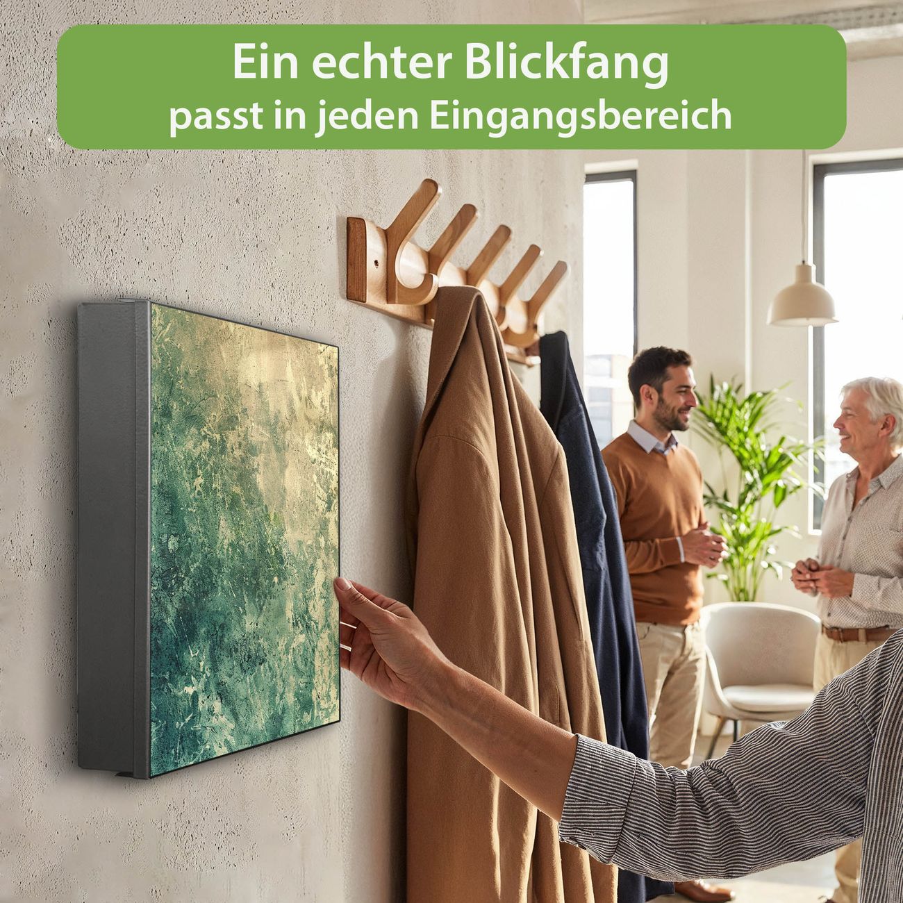 Bringe Ordnung und Eleganz in deinen Eingangsbereich mit dem banjado Schlüsselkasten Motiv Motiv Grüne Patina. Die moderne Schlüsselbox kombiniert funktionales Design mit hochwertiger Verarbeitung und wird so zu einem echten Hingucker in Flur, Büro oder Ferienwohnung. ✅ Stilvolle Schlüsselaufbewahrung mit Motiv Motiv Grüne Patina Der Design-Schlüsselkasten Motiv Motiv Grüne Patina bietet Platz für bis zu 32 Schlüssel, die auf 4 stabilen Reihen mit je 8 Haken übersichtlich verstaut werden. Mit seinen kompakten Maßen von 30 x 30 x 5 cm passt die Schlüsselbox perfekt auch in kleinere Räume. Der schwarz lackierte Stahlkorpus mit links angeschlagenem Türscharnier harmoniert mit gedruckten Folie auf der Front und fügt sich nahtlos in jedes Wohnambiente ein. Ob als Schlüsselorganizer für Zuhause oder als praktische Lösung für Büros, Praxen und Gewerbe, der banjado Schlüsselkasten sorgt für Ordnung und Übersicht. Dank der magnetischen, mit Kreidestiften beschreibbaren Folie auf der Front kannst du Notizen anheften oder Termine direkt auf der Oberfläche festhalten. Die Schlüsselbox Motiv Motiv Grüne Patina zur Wandmontage wird inklusive Befestigungsmaterial geliefert und ist schnell angebracht. So hast du deine Schlüssel jederzeit griffbereit und zugleich stilvoll verstaut. Mit diesem banjado Schlüsselkasten Motiv Motiv Grüne Patina kombinierst du praktische Aufbewahrung mit stilvollem Wohndesign. Ob privat oder geschäftlich, die Schlüsselbox sorgt für mehr Ordnung, Übersicht und ein wohnliches Ambiente.Vorteile im Überblick