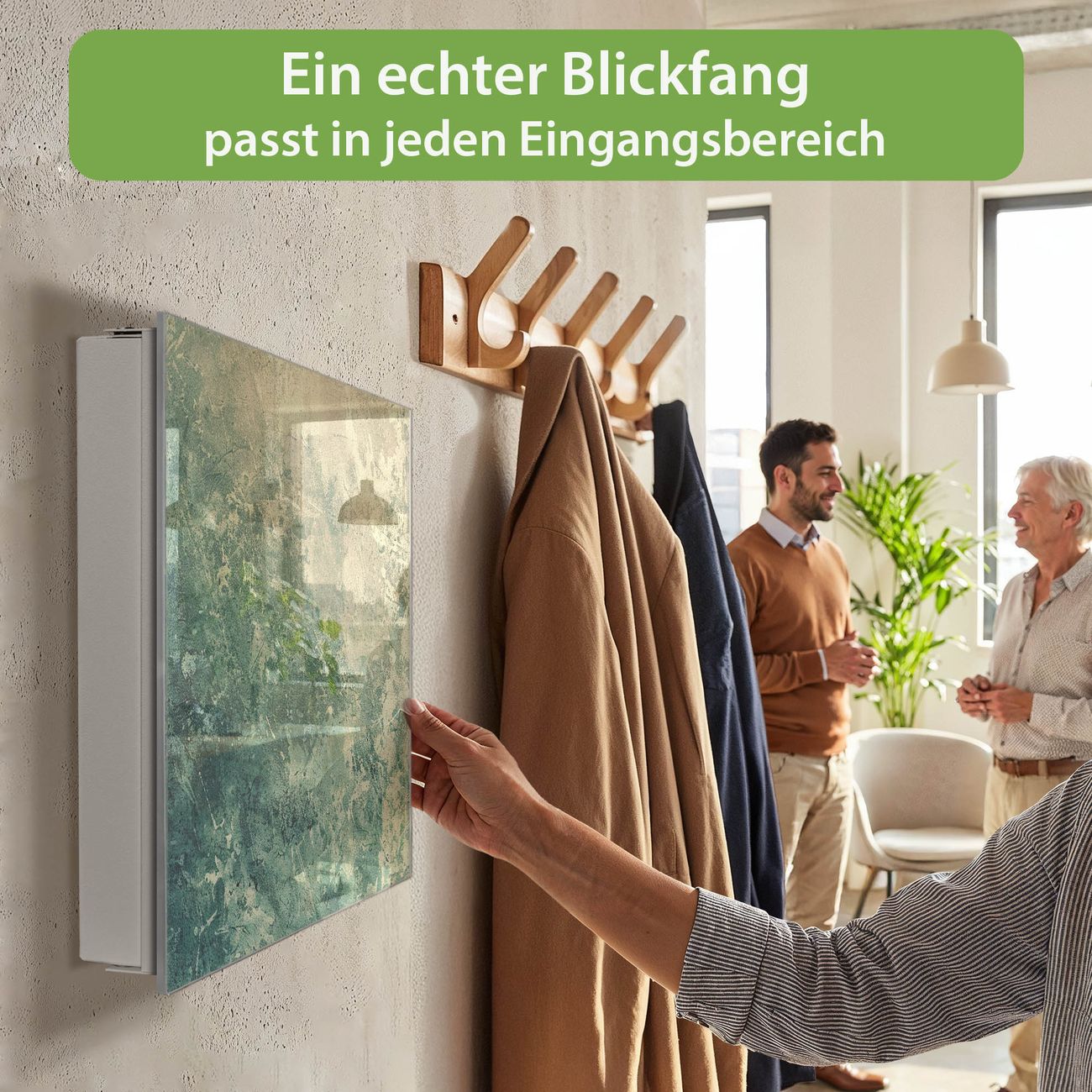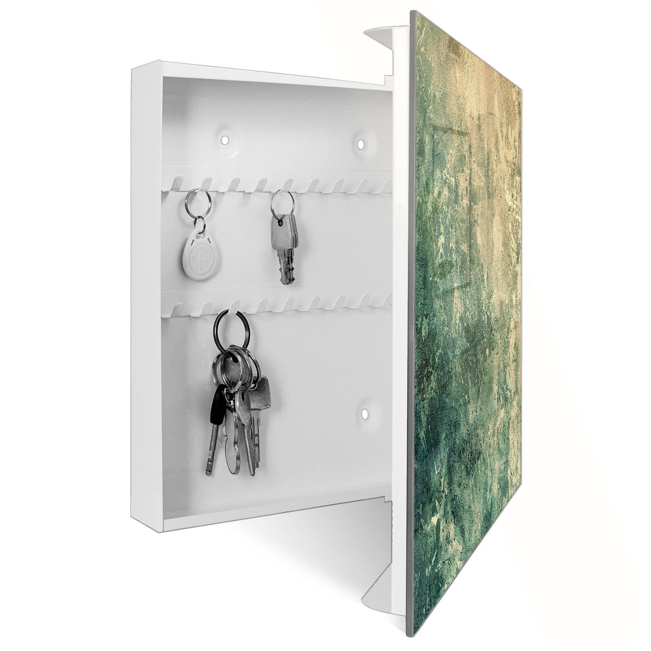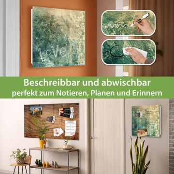 Bringe Ordnung und Eleganz in deinen Eingangsbereich mit dem banjado Schlüsselkasten Motiv Grüne Patina. Die moderne Schlüsselbox kombiniert funktionales Design mit hochwertiger Verarbeitung und wird so zu einem echten Hingucker in Flur, Büro oder Ferienwohnung. ✅ Stilvolle Schlüsselaufbewahrung mit Glasfront im Motiv Motiv Grüne Patina Der Design-Schlüsselkasten Motiv Grüne Patina bietet Platz für bis zu 50 Schlüssel, die auf 5 stabilen Reihen mit je 10 Haken übersichtlich verstaut werden. Mit seinen kompakten Maßen von 30 x 30 x 5 cm passt die Schlüsselbox perfekt auch in kleinere Räume. Der weiß lackierte Stahlkorpus mit rechts angeschlagenem Türscharnier harmoniert mit der Glasfront und fügt sich nahtlos in jedes Wohnambiente ein. Ob als Schlüsselorganizer für Zuhause oder als praktische Lösung für Büros, Praxen und Gewerbe, der banjado Schlüsselkasten sorgt für Ordnung und Übersicht. Dank der magnetischen, mit Kreidestiften beschreibbaren Glasfront kannst du Notizen anheften oder Termine direkt auf der Oberfläche festhalten. Die Schlüsselbox Motiv Grüne Patina zur Wandmontage wird inklusive Befestigungsmaterial geliefert und ist schnell angebracht. So hast du deine Schlüssel jederzeit griffbereit und zugleich stilvoll verstaut. Mit diesem banjado Schlüsselkasten Motiv Grüne Patina kombinierst du praktische Aufbewahrung mit stilvollem Wohndesign. Ob privat oder geschäftlich, die Schlüsselbox sorgt für mehr Ordnung, Übersicht und ein wohnliches Ambiente.Vorteile im Überblick