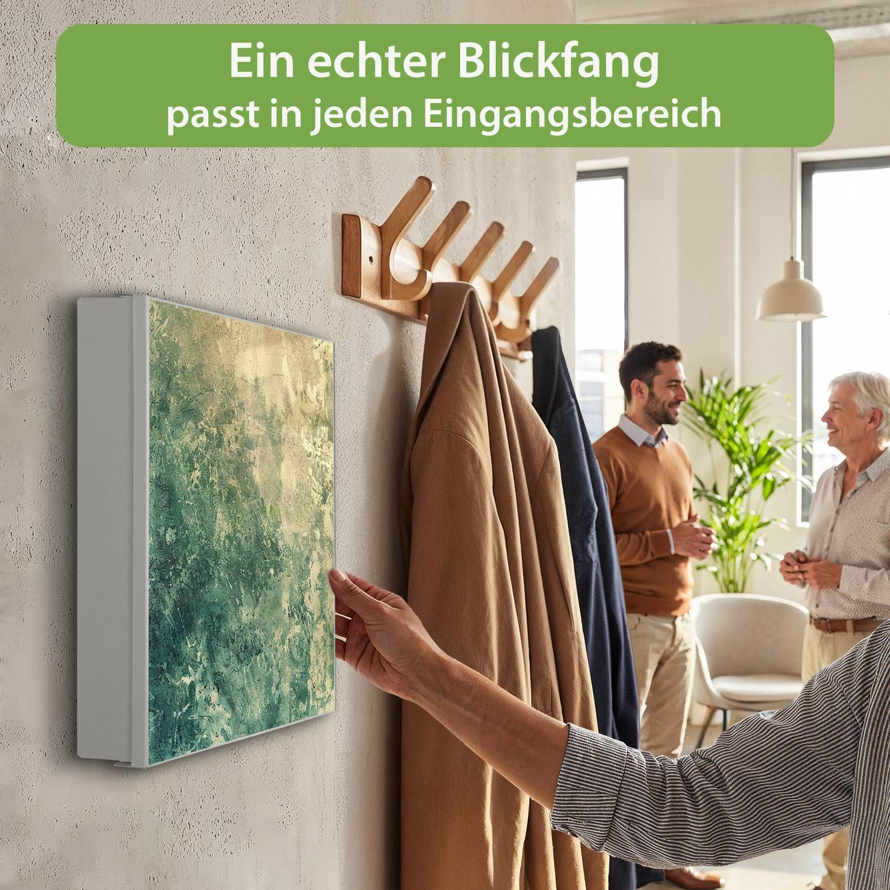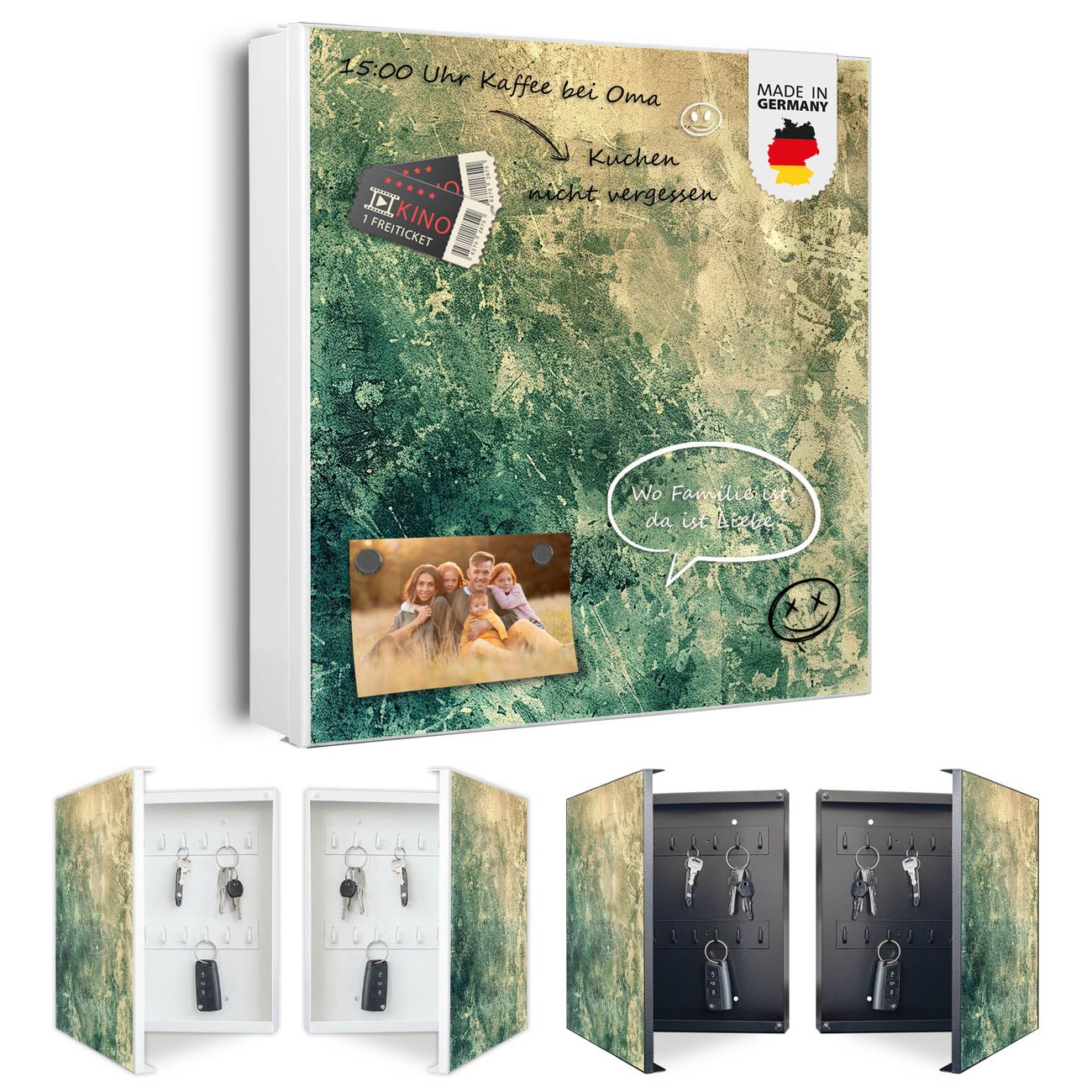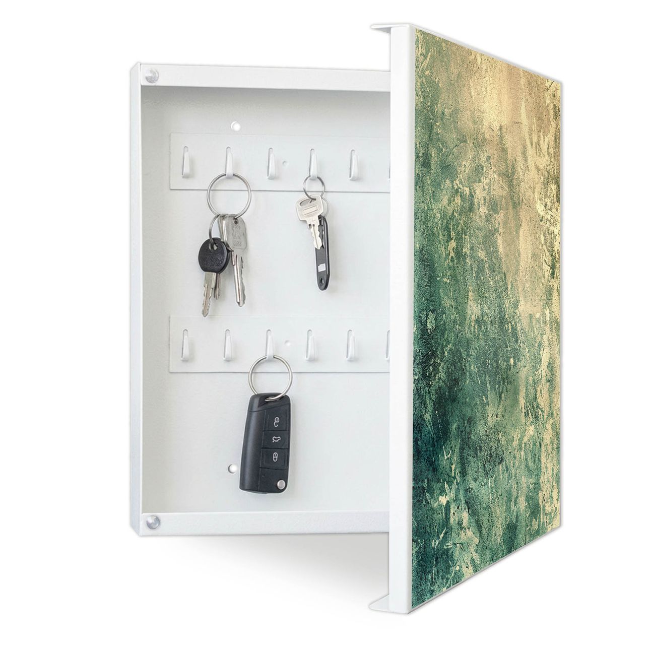Bringe Ordnung und Eleganz in deinen Eingangsbereich mit dem banjado Schlüsselkasten Motiv Motiv Grüne Patina. Die moderne Schlüsselbox kombiniert funktionales Design mit hochwertiger Verarbeitung und wird so zu einem echten Hingucker in Flur, Büro oder Ferienwohnung. ✅ Stilvolle Schlüsselaufbewahrung mit Motiv Motiv Grüne Patina Der Design-Schlüsselkasten Motiv Motiv Grüne Patina bietet Platz für bis zu 32 Schlüssel, die auf 4 stabilen Reihen mit je 8 Haken übersichtlich verstaut werden. Mit seinen kompakten Maßen von 30 x 30 x 5 cm passt die Schlüsselbox perfekt auch in kleinere Räume. Der weiß lackierte Stahlkorpus mit rechts angeschlagenem Türscharnier harmoniert mit gedruckten Folie auf der Front und fügt sich nahtlos in jedes Wohnambiente ein. Ob als Schlüsselorganizer für Zuhause oder als praktische Lösung für Büros, Praxen und Gewerbe, der banjado Schlüsselkasten sorgt für Ordnung und Übersicht. Dank der magnetischen, mit Kreidestiften beschreibbaren Folie auf der Front kannst du Notizen anheften oder Termine direkt auf der Oberfläche festhalten. Die Schlüsselbox Motiv Motiv Grüne Patina zur Wandmontage wird inklusive Befestigungsmaterial geliefert und ist schnell angebracht. So hast du deine Schlüssel jederzeit griffbereit und zugleich stilvoll verstaut. Mit diesem banjado Schlüsselkasten Motiv Motiv Grüne Patina kombinierst du praktische Aufbewahrung mit stilvollem Wohndesign. Ob privat oder geschäftlich, die Schlüsselbox sorgt für mehr Ordnung, Übersicht und ein wohnliches Ambiente.Vorteile im Überblick