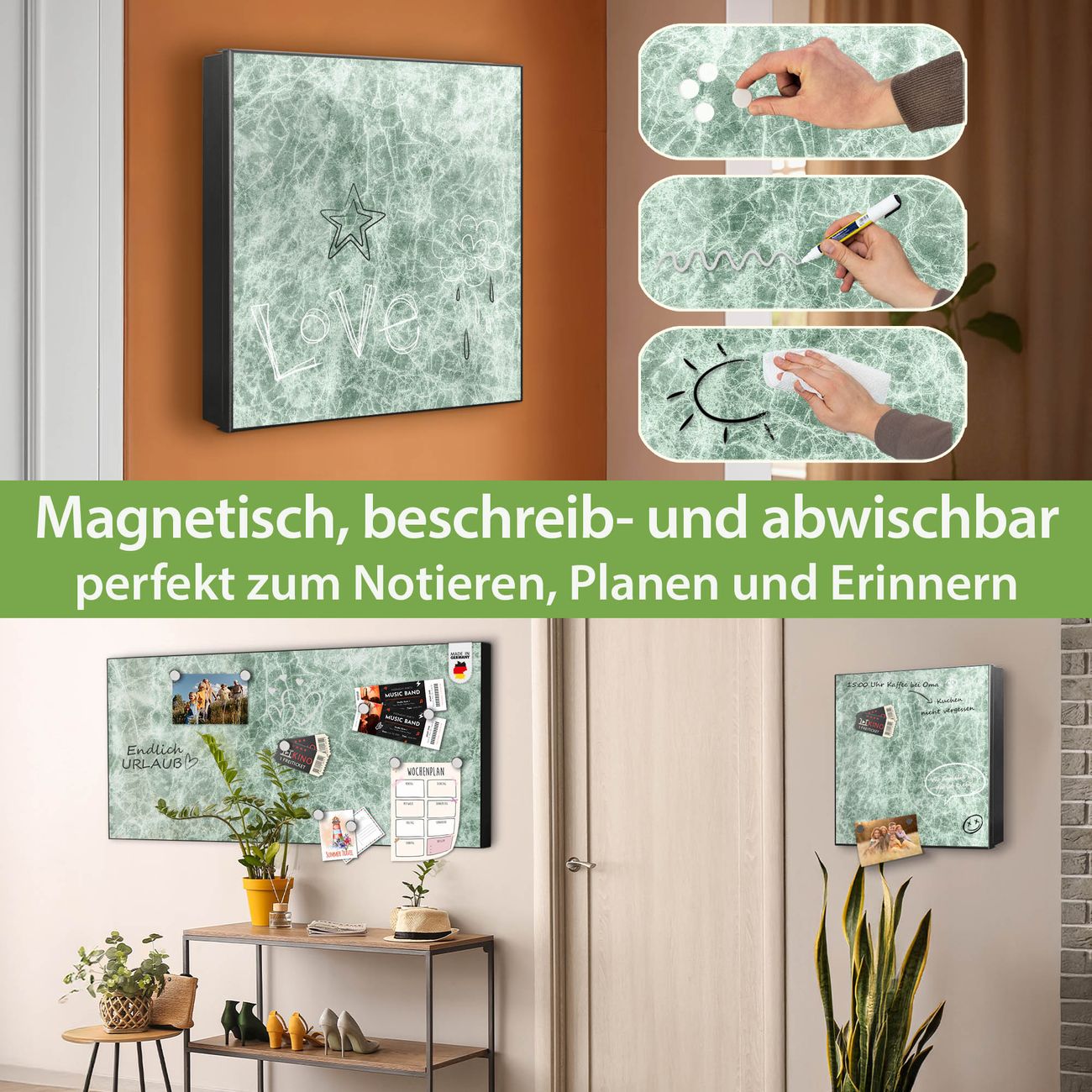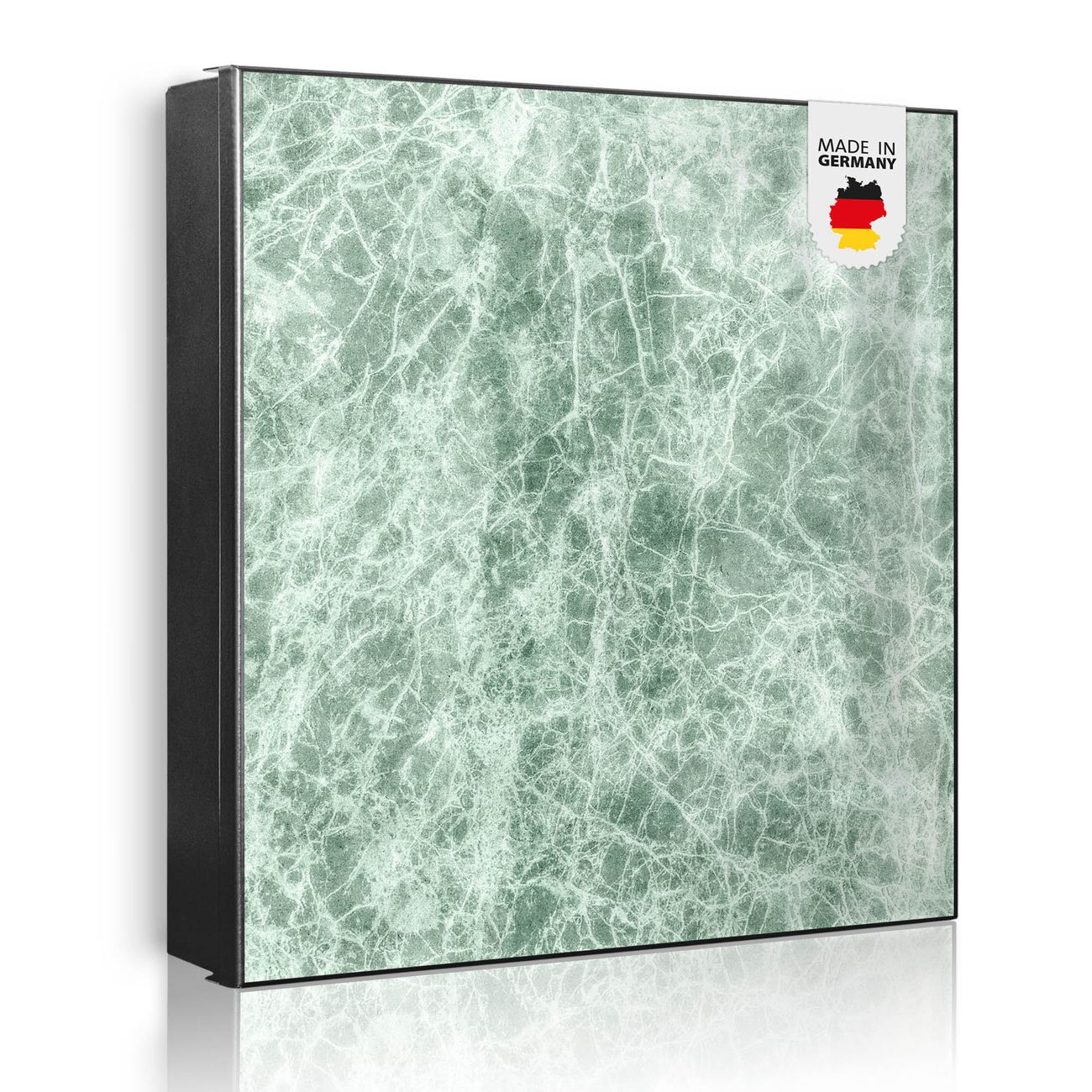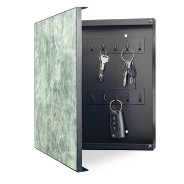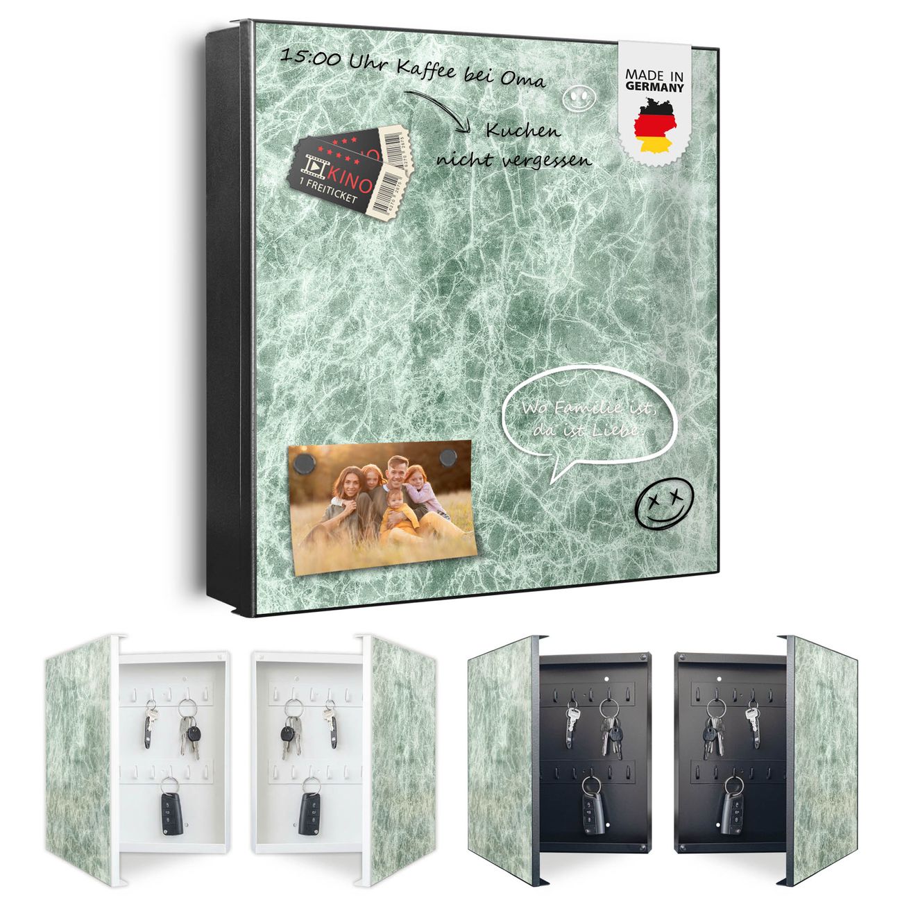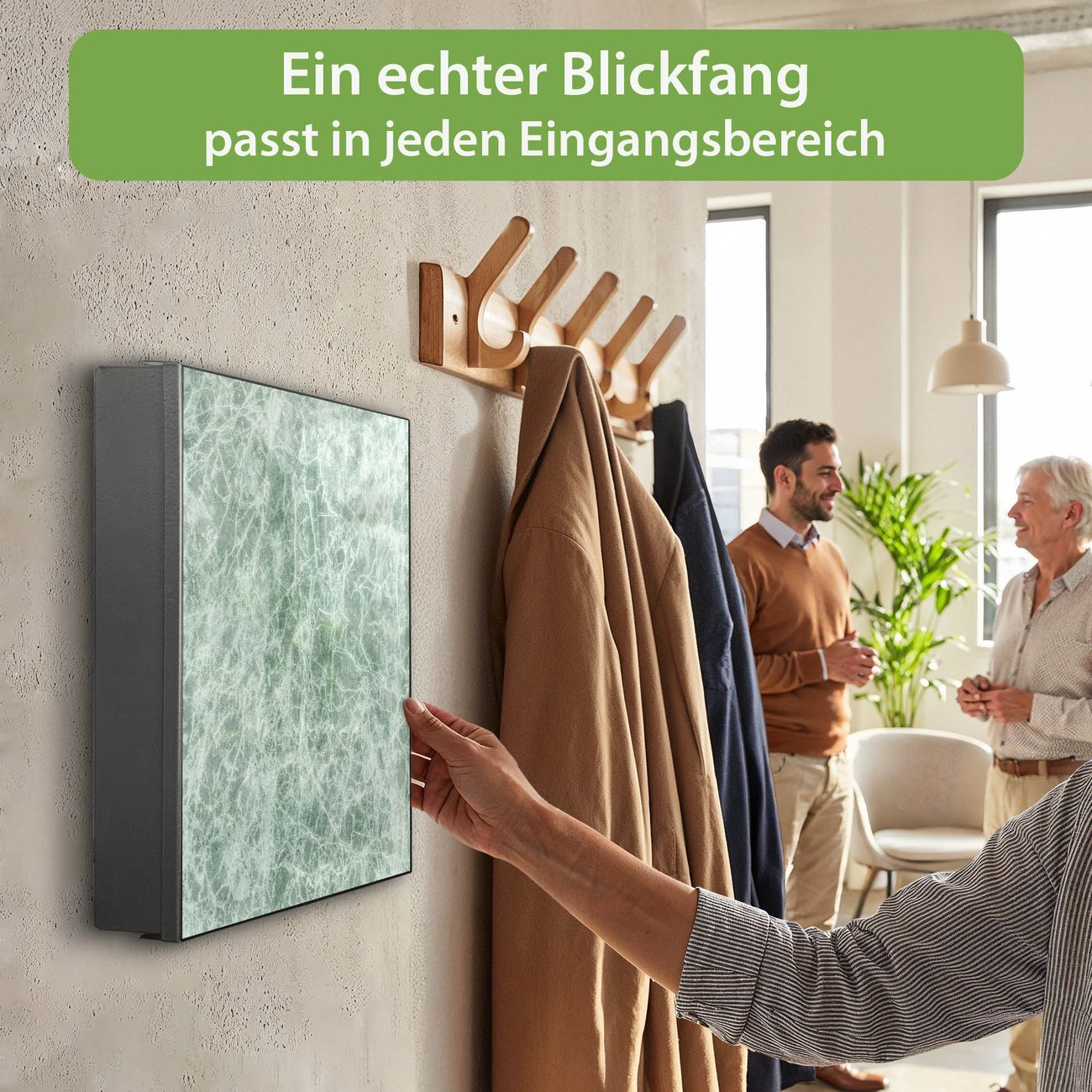 Bringe Ordnung und Eleganz in deinen Eingangsbereich mit dem banjado Schlüsselkasten Motiv Motiv Grüner Marmor 1. Die moderne Schlüsselbox kombiniert funktionales Design mit hochwertiger Verarbeitung und wird so zu einem echten Hingucker in Flur, Büro oder Ferienwohnung. ✅ Stilvolle Schlüsselaufbewahrung mit Motiv Motiv Grüner Marmor 1 Der Design-Schlüsselkasten Motiv Motiv Grüner Marmor 1 bietet Platz für bis zu 32 Schlüssel, die auf 4 stabilen Reihen mit je 8 Haken übersichtlich verstaut werden. Mit seinen kompakten Maßen von 30 x 30 x 5 cm passt die Schlüsselbox perfekt auch in kleinere Räume. Der schwarz lackierte Stahlkorpus mit links angeschlagenem Türscharnier harmoniert mit gedruckten Folie auf der Front und fügt sich nahtlos in jedes Wohnambiente ein. Ob als Schlüsselorganizer für Zuhause oder als praktische Lösung für Büros, Praxen und Gewerbe, der banjado Schlüsselkasten sorgt für Ordnung und Übersicht. Dank der magnetischen, mit Kreidestiften beschreibbaren Folie auf der Front kannst du Notizen anheften oder Termine direkt auf der Oberfläche festhalten. Die Schlüsselbox Motiv Motiv Grüner Marmor 1 zur Wandmontage wird inklusive Befestigungsmaterial geliefert und ist schnell angebracht. So hast du deine Schlüssel jederzeit griffbereit und zugleich stilvoll verstaut. Mit diesem banjado Schlüsselkasten Motiv Motiv Grüner Marmor 1 kombinierst du praktische Aufbewahrung mit stilvollem Wohndesign. Ob privat oder geschäftlich, die Schlüsselbox sorgt für mehr Ordnung, Übersicht und ein wohnliches Ambiente.Vorteile im Überblick