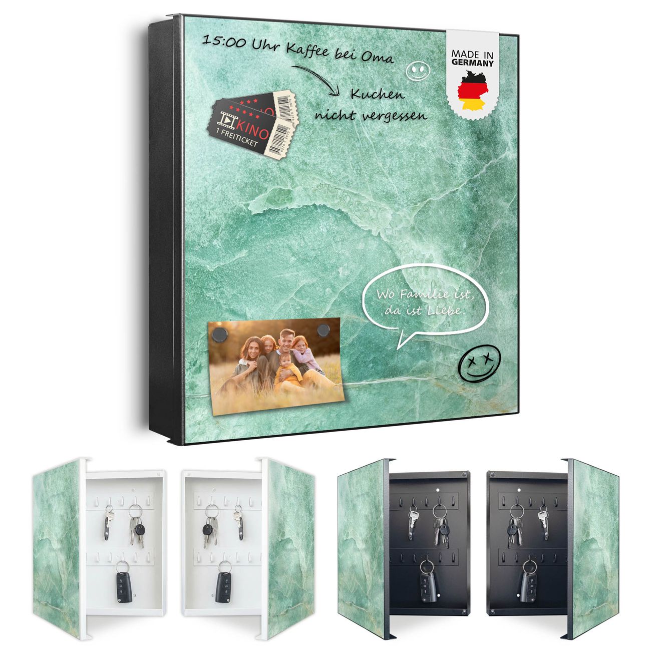 Bringe Ordnung und Eleganz in deinen Eingangsbereich mit dem banjado Schlüsselkasten Motiv Motiv Grüner Marmor 2. Die moderne Schlüsselbox kombiniert funktionales Design mit hochwertiger Verarbeitung und wird so zu einem echten Hingucker in Flur, Büro oder Ferienwohnung. ✅ Stilvolle Schlüsselaufbewahrung mit Motiv Motiv Grüner Marmor 2 Der Design-Schlüsselkasten Motiv Motiv Grüner Marmor 2 bietet Platz für bis zu 32 Schlüssel, die auf 4 stabilen Reihen mit je 8 Haken übersichtlich verstaut werden. Mit seinen kompakten Maßen von 30 x 30 x 5 cm passt die Schlüsselbox perfekt auch in kleinere Räume. Der schwarz lackierte Stahlkorpus mit links angeschlagenem Türscharnier harmoniert mit gedruckten Folie auf der Front und fügt sich nahtlos in jedes Wohnambiente ein. Ob als Schlüsselorganizer für Zuhause oder als praktische Lösung für Büros, Praxen und Gewerbe, der banjado Schlüsselkasten sorgt für Ordnung und Übersicht. Dank der magnetischen, mit Kreidestiften beschreibbaren Folie auf der Front kannst du Notizen anheften oder Termine direkt auf der Oberfläche festhalten. Die Schlüsselbox Motiv Motiv Grüner Marmor 2 zur Wandmontage wird inklusive Befestigungsmaterial geliefert und ist schnell angebracht. So hast du deine Schlüssel jederzeit griffbereit und zugleich stilvoll verstaut. Mit diesem banjado Schlüsselkasten Motiv Motiv Grüner Marmor 2 kombinierst du praktische Aufbewahrung mit stilvollem Wohndesign. Ob privat oder geschäftlich, die Schlüsselbox sorgt für mehr Ordnung, Übersicht und ein wohnliches Ambiente.Vorteile im Überblick