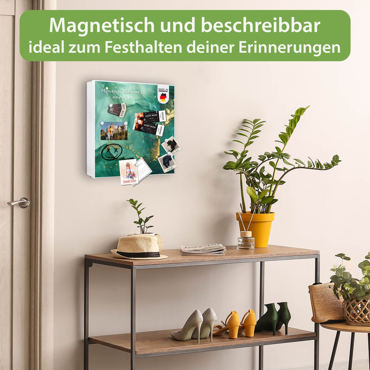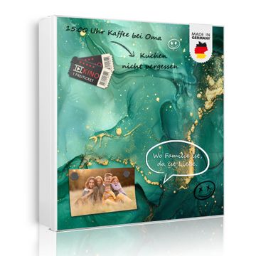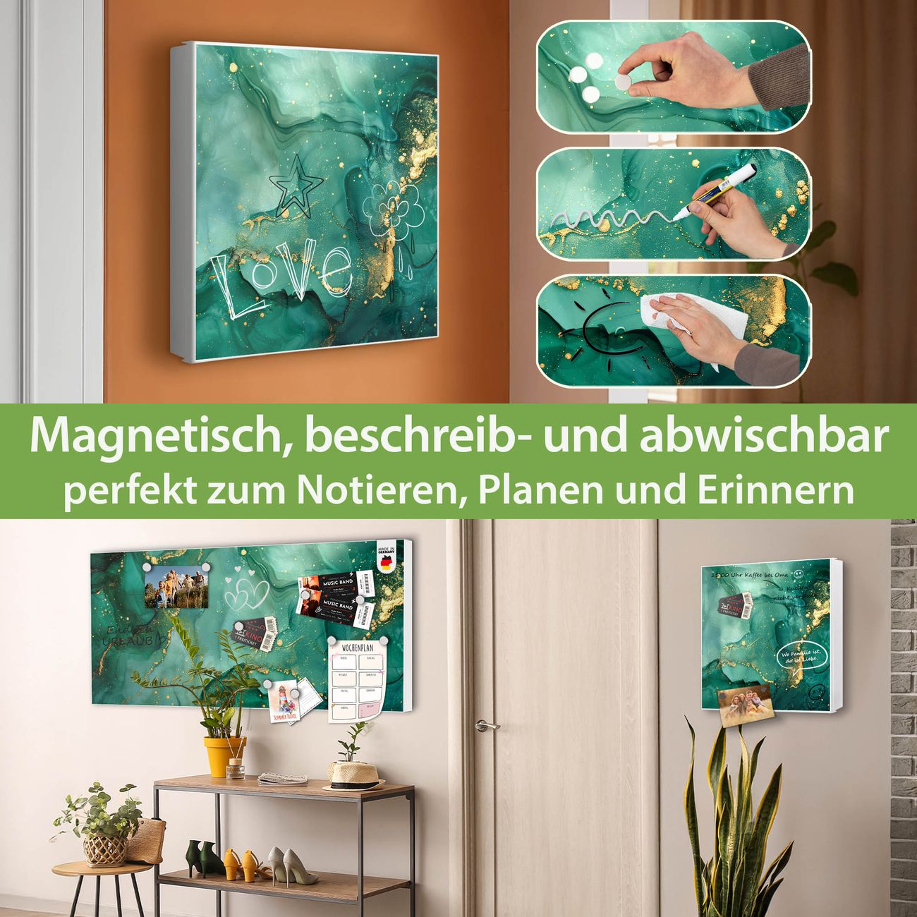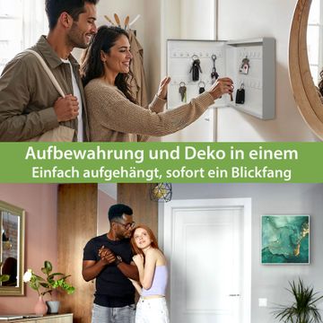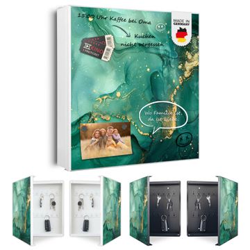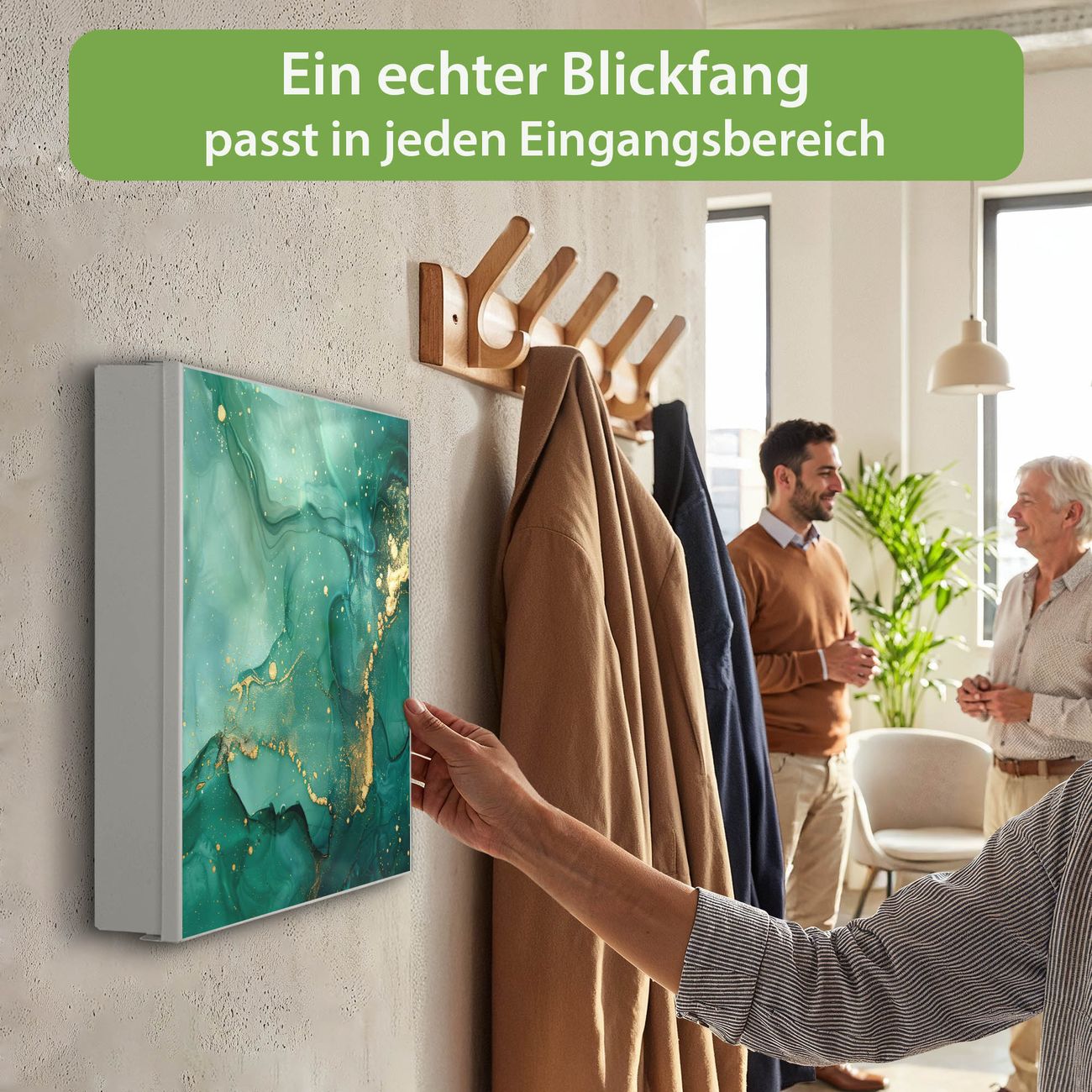 Bringe Ordnung und Eleganz in deinen Eingangsbereich mit dem banjado Schlüsselkasten Motiv Motiv Grüner Marmor mit Gold 1. Die moderne Schlüsselbox kombiniert funktionales Design mit hochwertiger Verarbeitung und wird so zu einem echten Hingucker in Flur, Büro oder Ferienwohnung. ✅ Stilvolle Schlüsselaufbewahrung mit Motiv Motiv Grüner Marmor mit Gold 1 Der Design-Schlüsselkasten Motiv Motiv Grüner Marmor mit Gold 1 bietet Platz für bis zu 32 Schlüssel, die auf 4 stabilen Reihen mit je 8 Haken übersichtlich verstaut werden. Mit seinen kompakten Maßen von 30 x 30 x 5 cm passt die Schlüsselbox perfekt auch in kleinere Räume. Der weiß lackierte Stahlkorpus mit links angeschlagenem Türscharnier harmoniert mit gedruckten Folie auf der Front und fügt sich nahtlos in jedes Wohnambiente ein. Ob als Schlüsselorganizer für Zuhause oder als praktische Lösung für Büros, Praxen und Gewerbe, der banjado Schlüsselkasten sorgt für Ordnung und Übersicht. Dank der magnetischen, mit Kreidestiften beschreibbaren Folie auf der Front kannst du Notizen anheften oder Termine direkt auf der Oberfläche festhalten. Die Schlüsselbox Motiv Motiv Grüner Marmor mit Gold 1 zur Wandmontage wird inklusive Befestigungsmaterial geliefert und ist schnell angebracht. So hast du deine Schlüssel jederzeit griffbereit und zugleich stilvoll verstaut. Mit diesem banjado Schlüsselkasten Motiv Motiv Grüner Marmor mit Gold 1 kombinierst du praktische Aufbewahrung mit stilvollem Wohndesign. Ob privat oder geschäftlich, die Schlüsselbox sorgt für mehr Ordnung, Übersicht und ein wohnliches Ambiente.Vorteile im Überblick