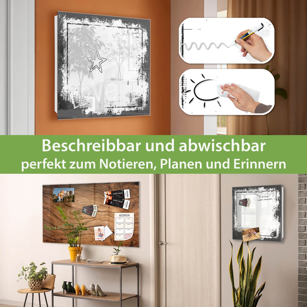 ✅ Magnetisch und mit Kreidestift beschreibbar, gehärtetes Glas, rechts angeschlagene TürOrdnung und Design in einem