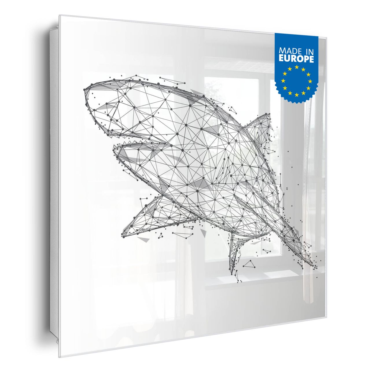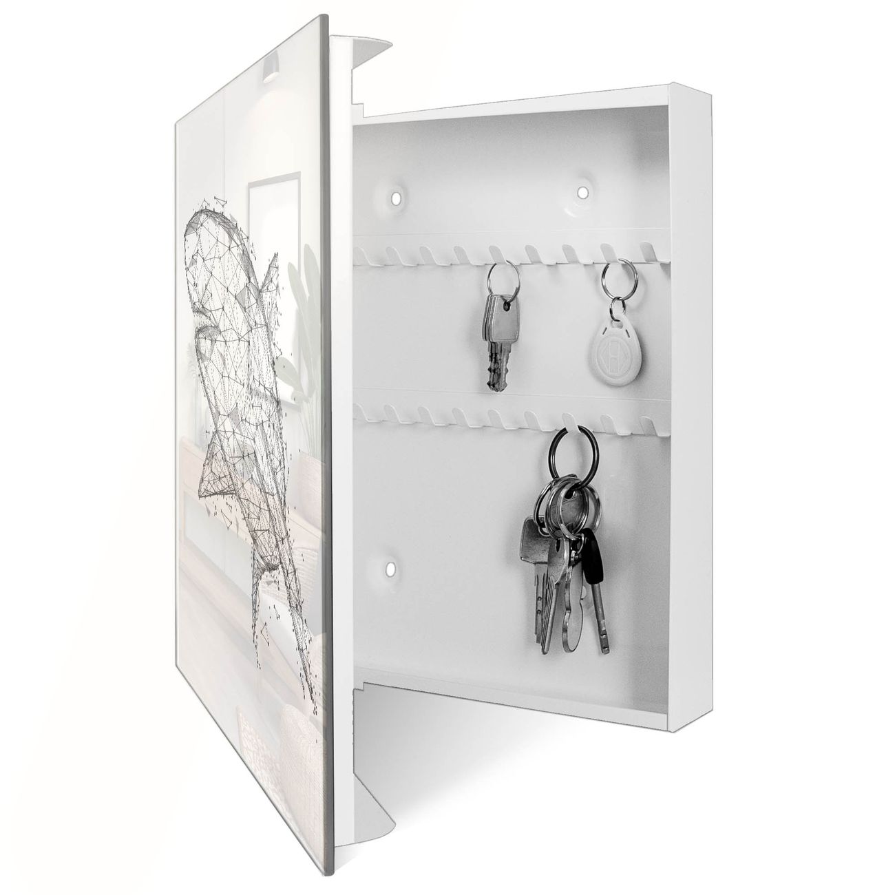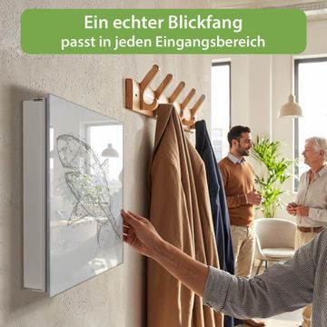 Bringe Ordnung und Eleganz in deinen Eingangsbereich mit dem banjado Schlüsselkasten Motiv Motiv Hai abstrakt 2. Die moderne Schlüsselbox kombiniert funktionales Design mit hochwertiger Verarbeitung und wird so zu einem echten Hingucker in Flur, Büro oder Ferienwohnung. ✅ Stilvolle Schlüsselaufbewahrung mit Glasfront im Motiv Motiv Hai abstrakt 2 Der Design-Schlüsselkasten Motiv Motiv Hai abstrakt 2 bietet Platz für bis zu 50 Schlüssel, die auf 5 stabilen Reihen mit je 10 Haken übersichtlich verstaut werden. Mit seinen kompakten Maßen von 30 x 30 x 5 cm passt die Schlüsselbox perfekt auch in kleinere Räume. Der weiß lackierte Stahlkorpus mit rechts angeschlagenem Türscharnier harmoniert mit der Glasfront und fügt sich nahtlos in jedes Wohnambiente ein. Ob als Schlüsselorganizer für Zuhause oder als praktische Lösung für Büros, Praxen und Gewerbe, der banjado Schlüsselkasten sorgt für Ordnung und Übersicht. Dank der magnetischen, mit Kreidestiften beschreibbaren Glasfront kannst du Notizen anheften oder Termine direkt auf der Oberfläche festhalten. Die Schlüsselbox Motiv Motiv Hai abstrakt 2 zur Wandmontage wird inklusive Befestigungsmaterial geliefert und ist schnell angebracht. So hast du deine Schlüssel jederzeit griffbereit und zugleich stilvoll verstaut. Mit diesem banjado Schlüsselkasten Motiv Motiv Hai abstrakt 2 kombinierst du praktische Aufbewahrung mit stilvollem Wohndesign. Ob privat oder geschäftlich, die Schlüsselbox sorgt für mehr Ordnung, Übersicht und ein wohnliches Ambiente.Vorteile im Überblick